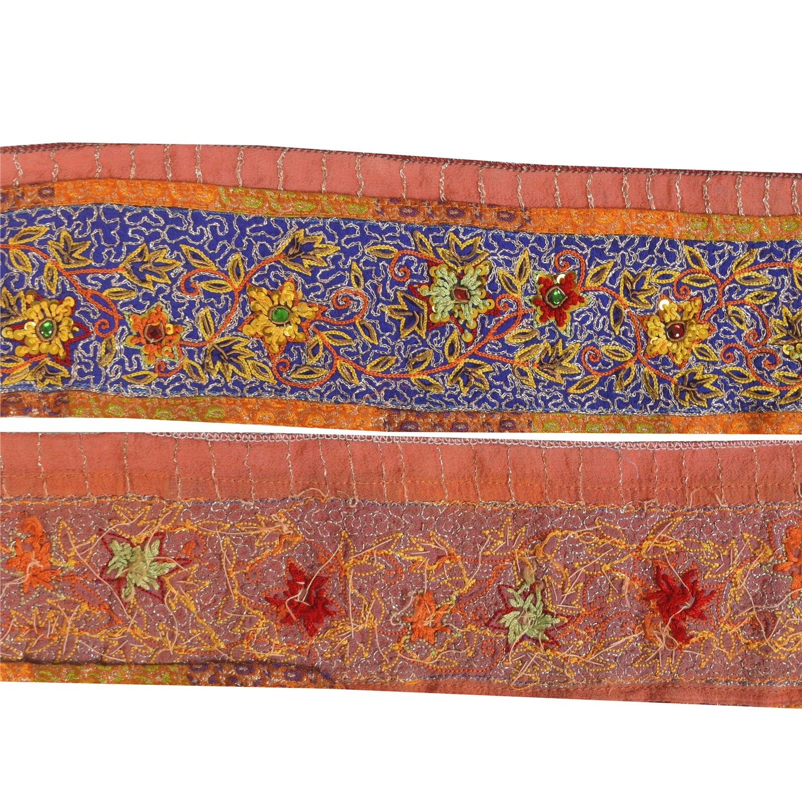 Sanskriti Vintage Sari/Saree Border Hand Beaded 1YD Trim Blue & Orange 2.5W Lace