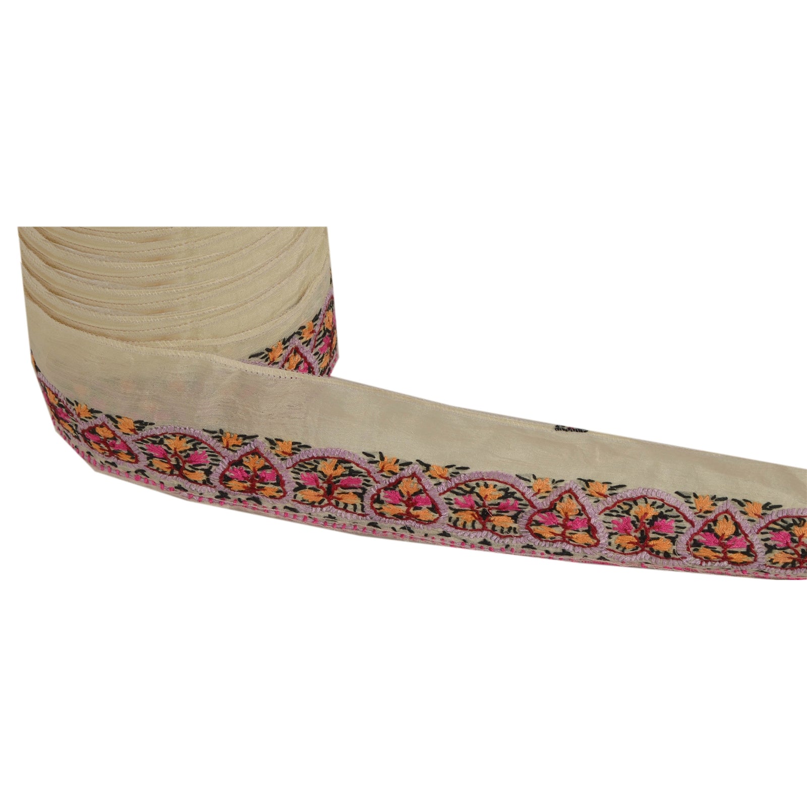Fabulous 100% pure silk hand embroidered Suzani sari border in cream color highlighting woven work. Border has beautiful floral design painstakingly multi color thread work. WOW!! an awesome one of a kind versatile border. 1 Quantity = 1 Yard