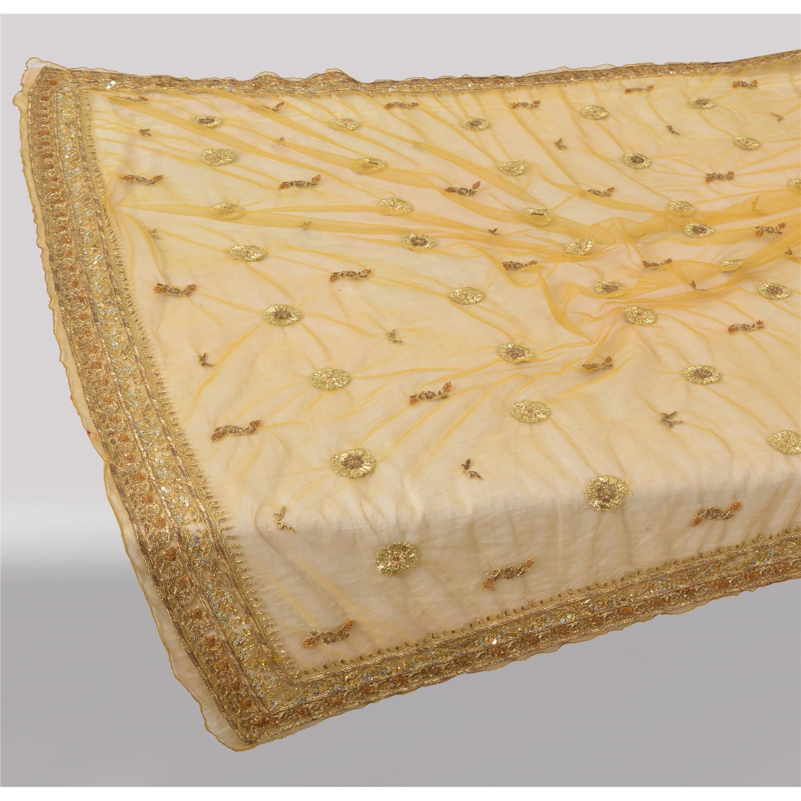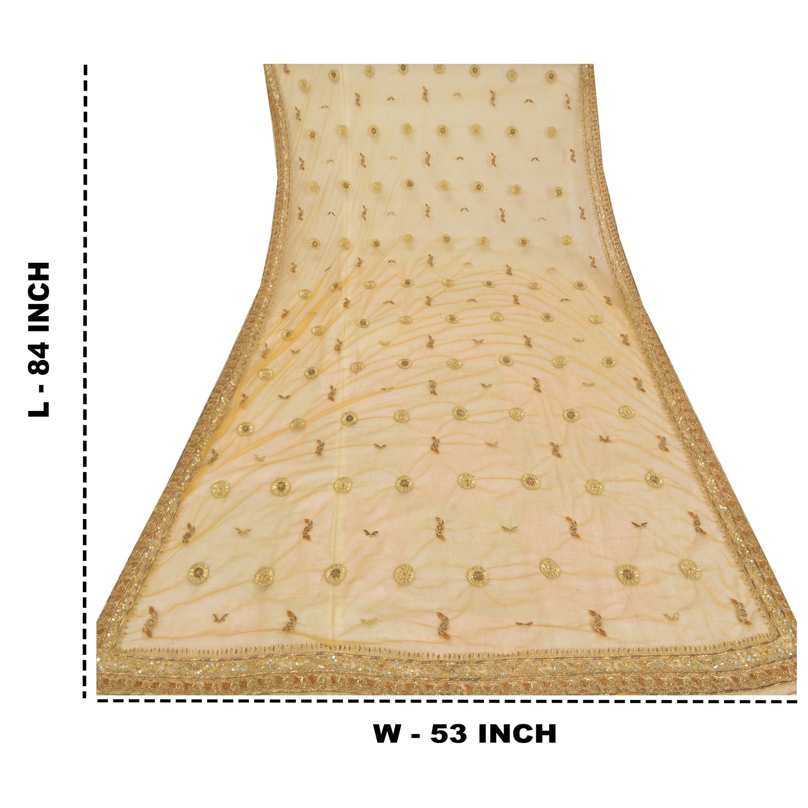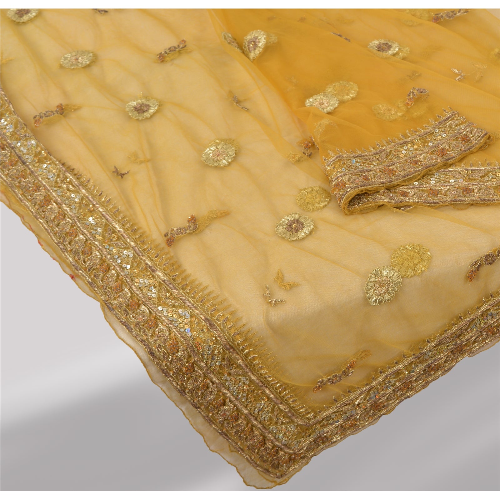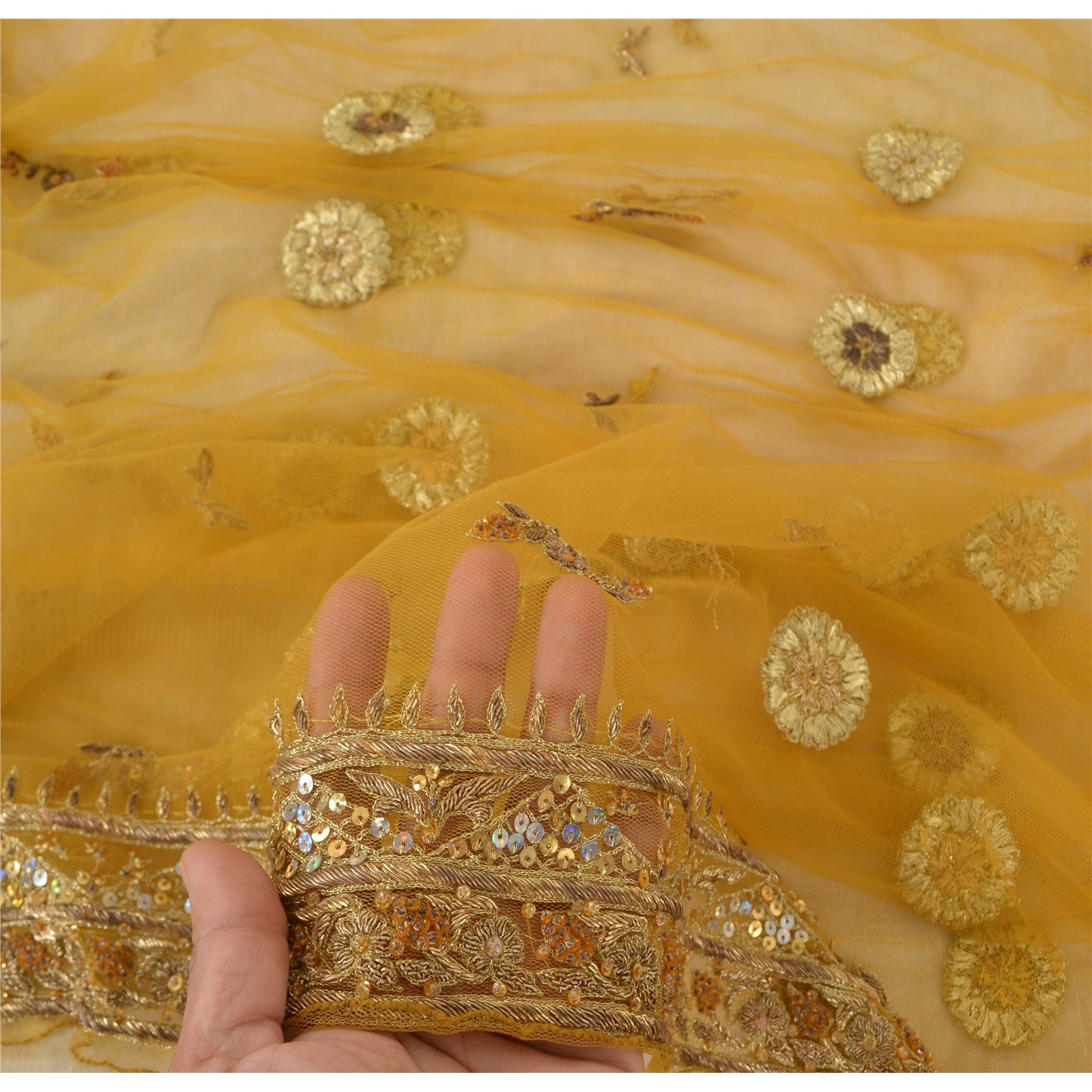 'THE ITEM COLOR OR SHADE MAY BE DARKER OR LIGHTER THAN THE PICTURE.' Awesome yellow colored net mesh hand beaded long scarf/dupatta. Center portion of the dupatta floral design with zari/zardozi work. Border features has floral design embellished with metallic golden zari/zardozi work, glass beads work & golden sequins work is really enhancing beauty of the dupatta/stole. This dupatta/stole can be used for various crafting ideas too. Use it for dress designing, as a throw, as window dressing, upholstery, table linen and much more. Let your creative juices flow. Shipping note: International buyers please note: Import duties, taxes, and charges are not included in the item price or postage cost. These charges are the buyer's responsibility. Please check with your country's customs office to determine what these additional costs will be prior to bidding or buying. Buyer will pay custom duty/tax. It is calculated and charged differently by every country. As a seller I do not have any control over it. VAT or sales tax is calculated by the platform at the time of checkout. Customs charge is payable at the time of delivery.'