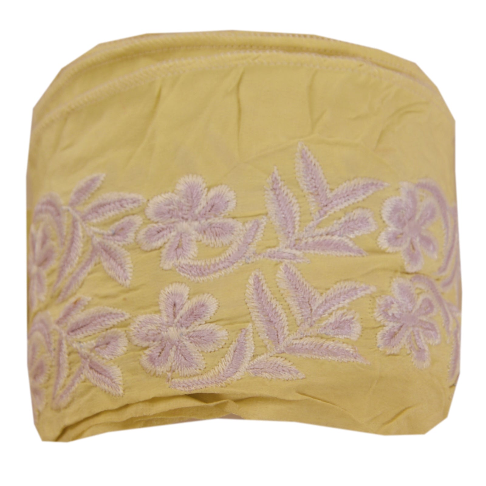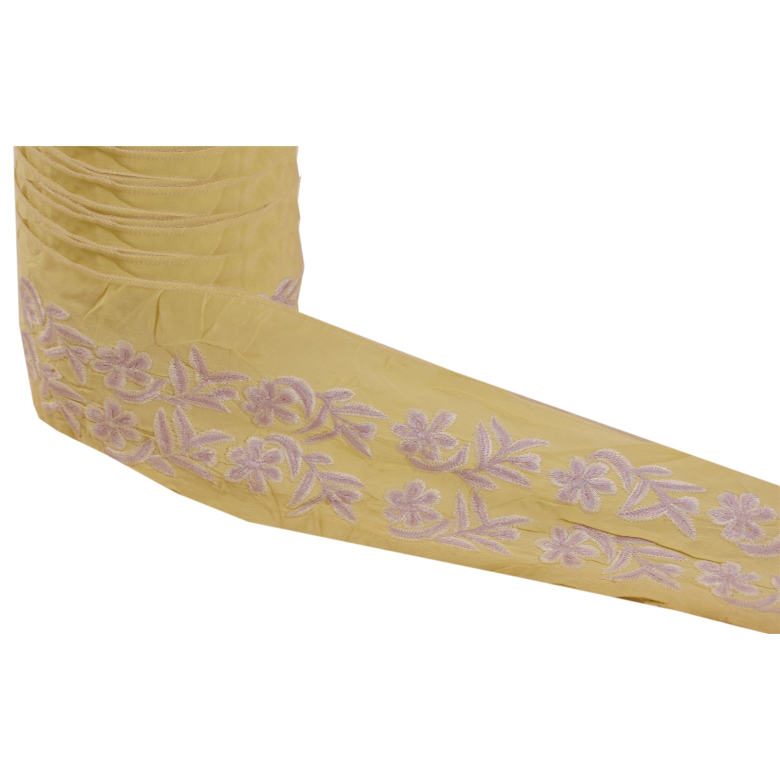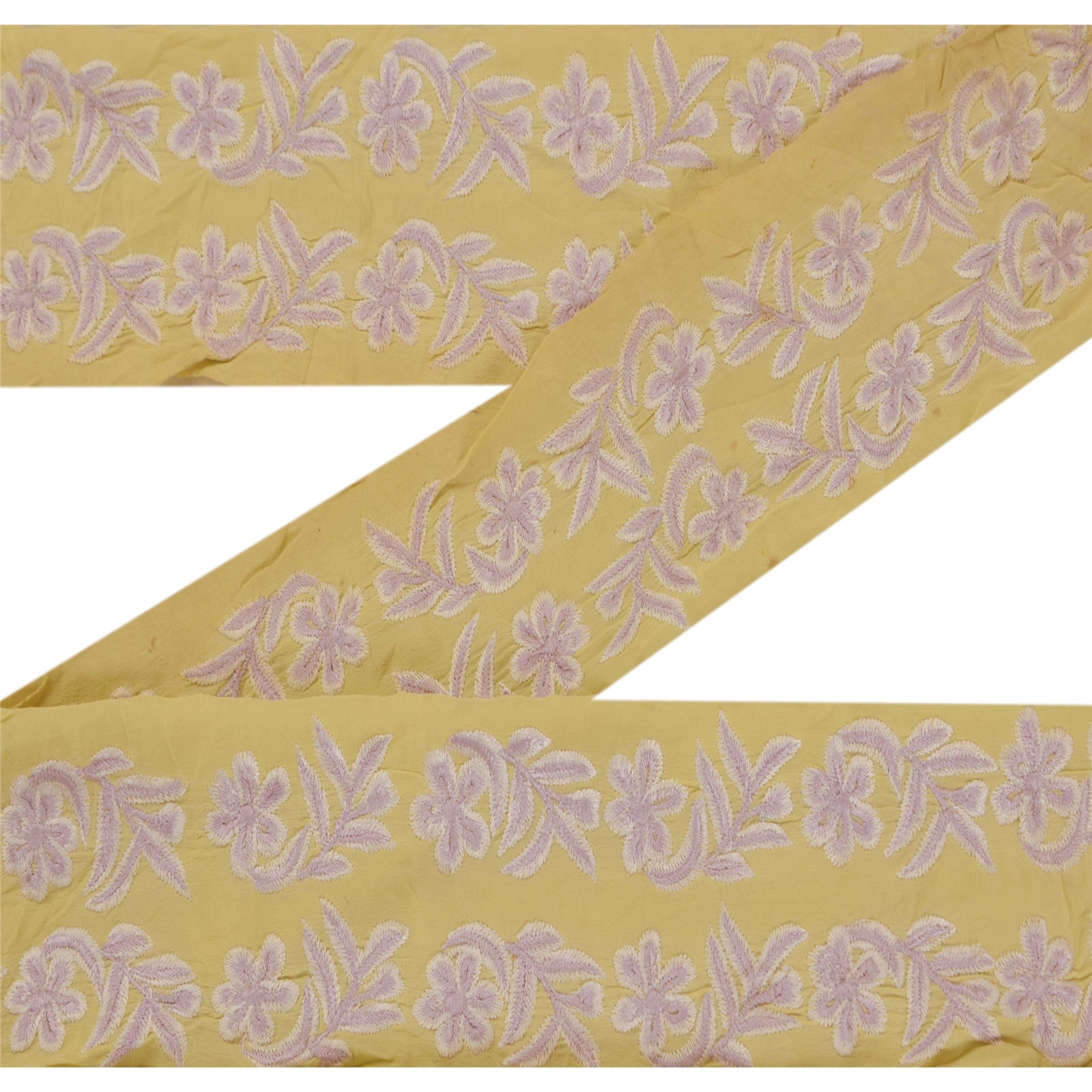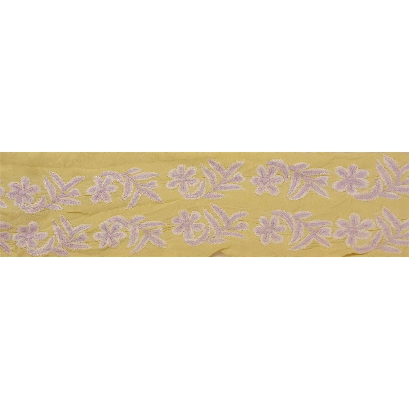 Wonderful crepe silk embroidered sari border in cream color highlighting thread work. Border has beautiful floral patterns painstakingly embroidered with purple, white WOW!! an awesome one of a kind versatile border. 1 Quantity = 1 Yard B-13637