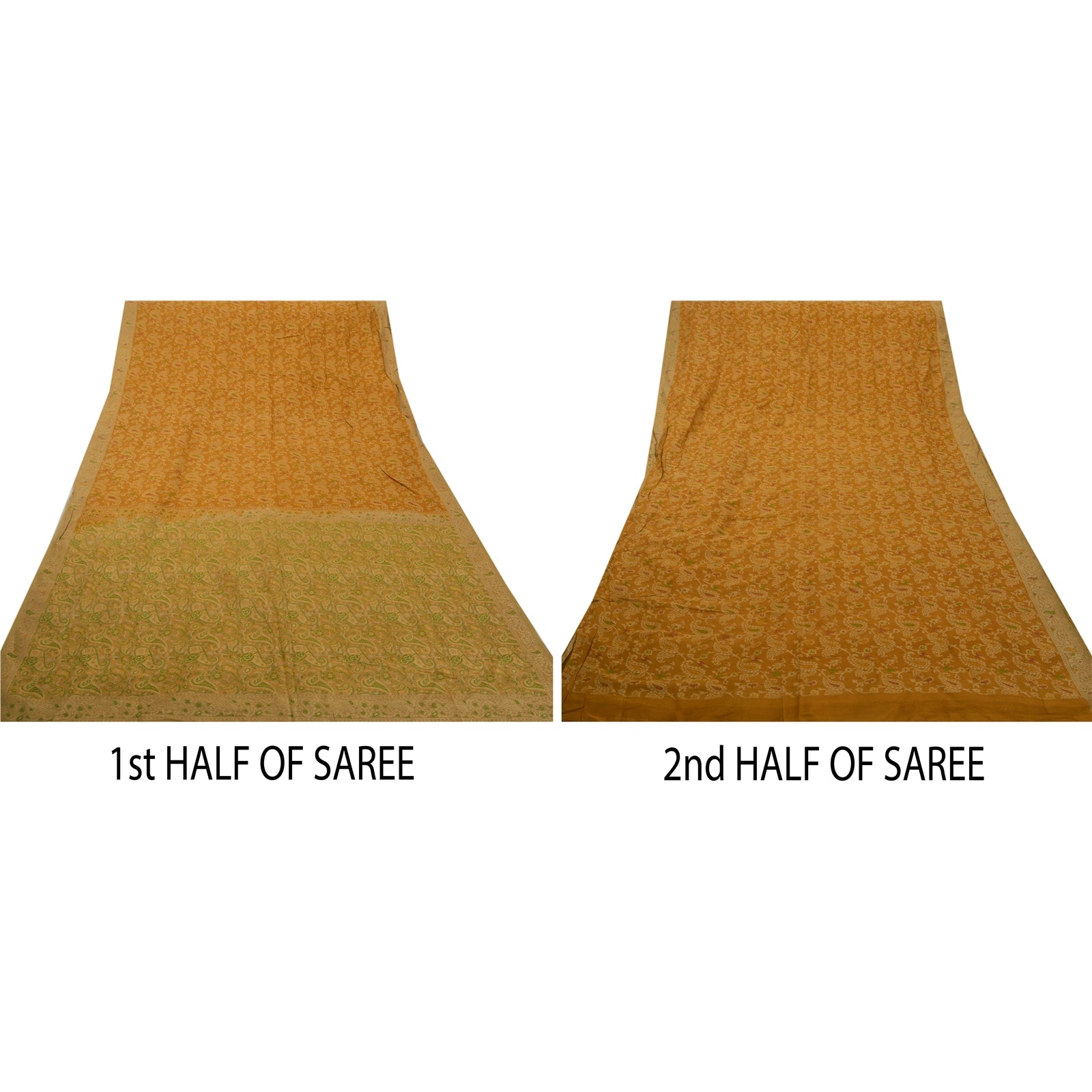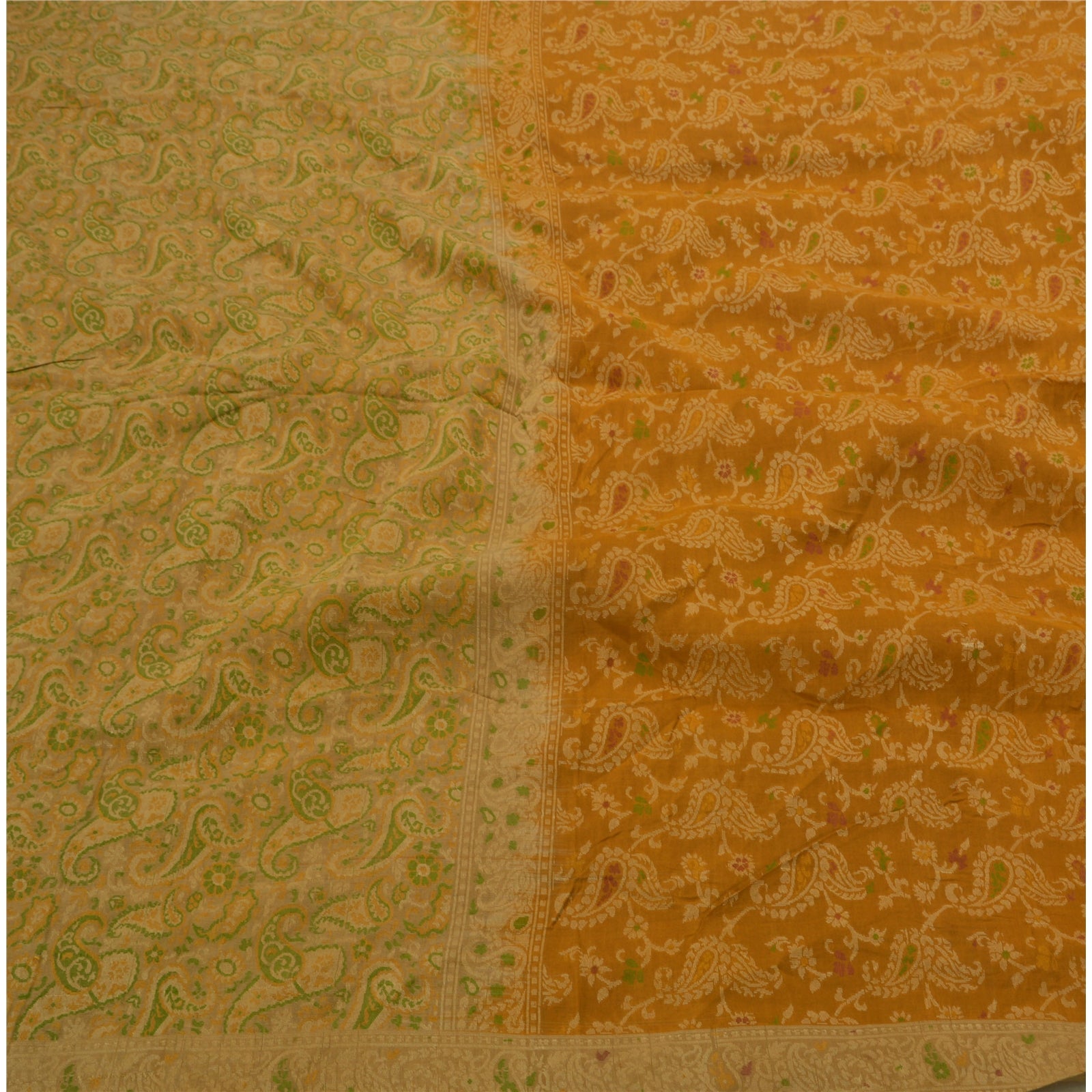 ? Beautiful green & orange colored woven pure silk sari ? Pallu & Border features floral & paisley design adorned with cream & green weaving work makes the sari look ravishing ? There are floral motifs with similar work in center part of sari. What is special about this saree? Nice cream & green combination woven work with floral design on orange & green color base Sustainable Fabric is really enhancing the beauty of the saree. This unique vintage saree can be used for various crafting ideas even if you don't want to use it as a sari. Design a dress, use it as a throw, as window dressing, upholstery, sarongs, table linen and much more. Let your creative juices flow and use this decorated Sustainable Fabric in multiple fashion.