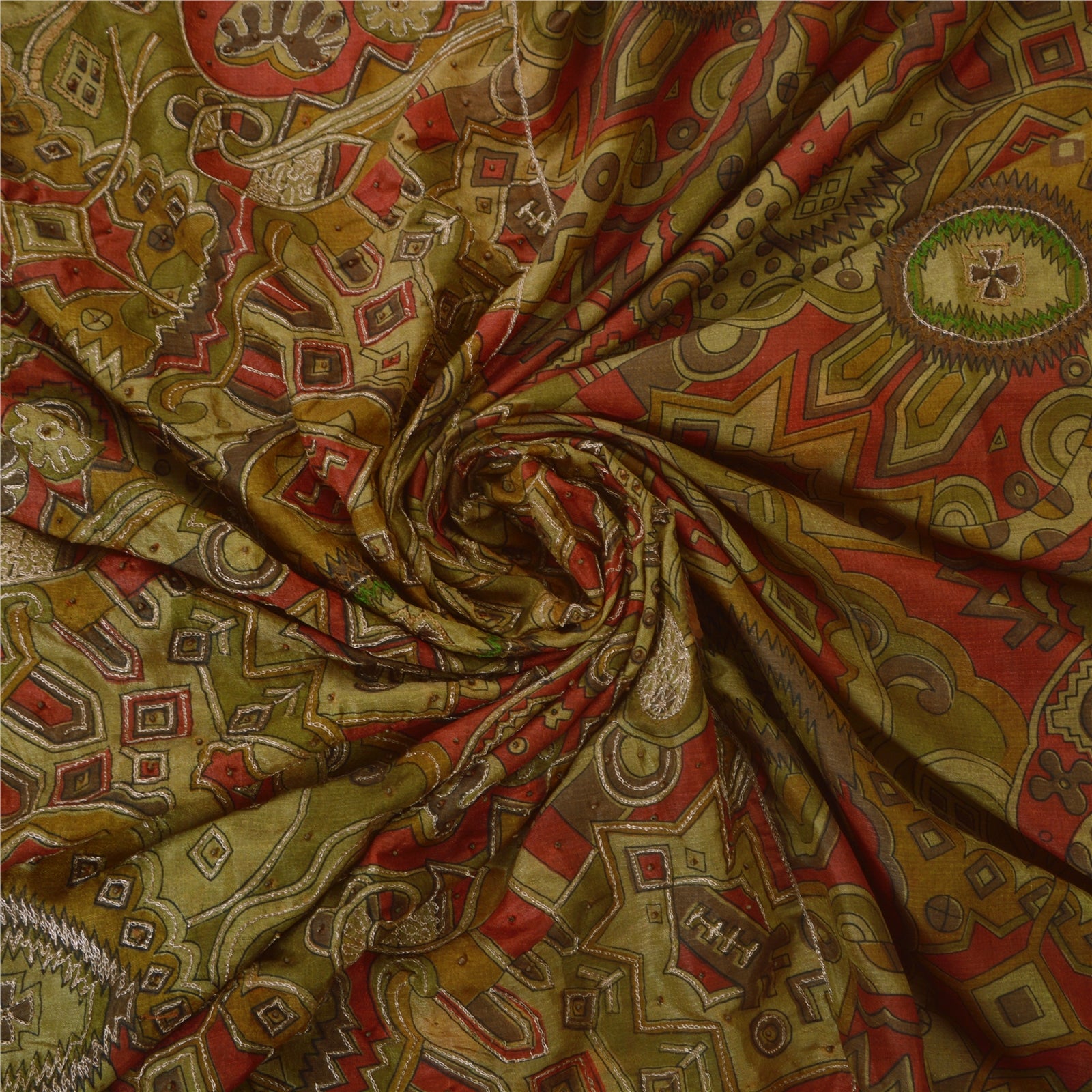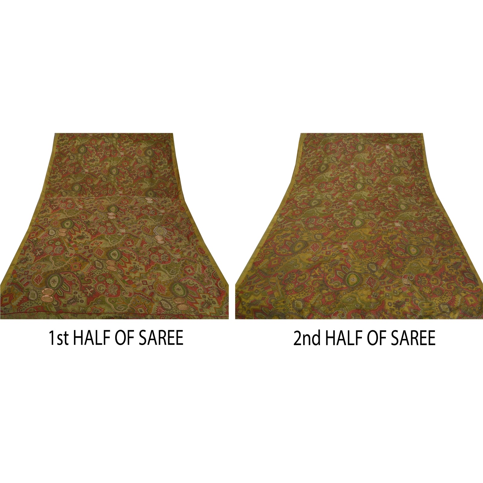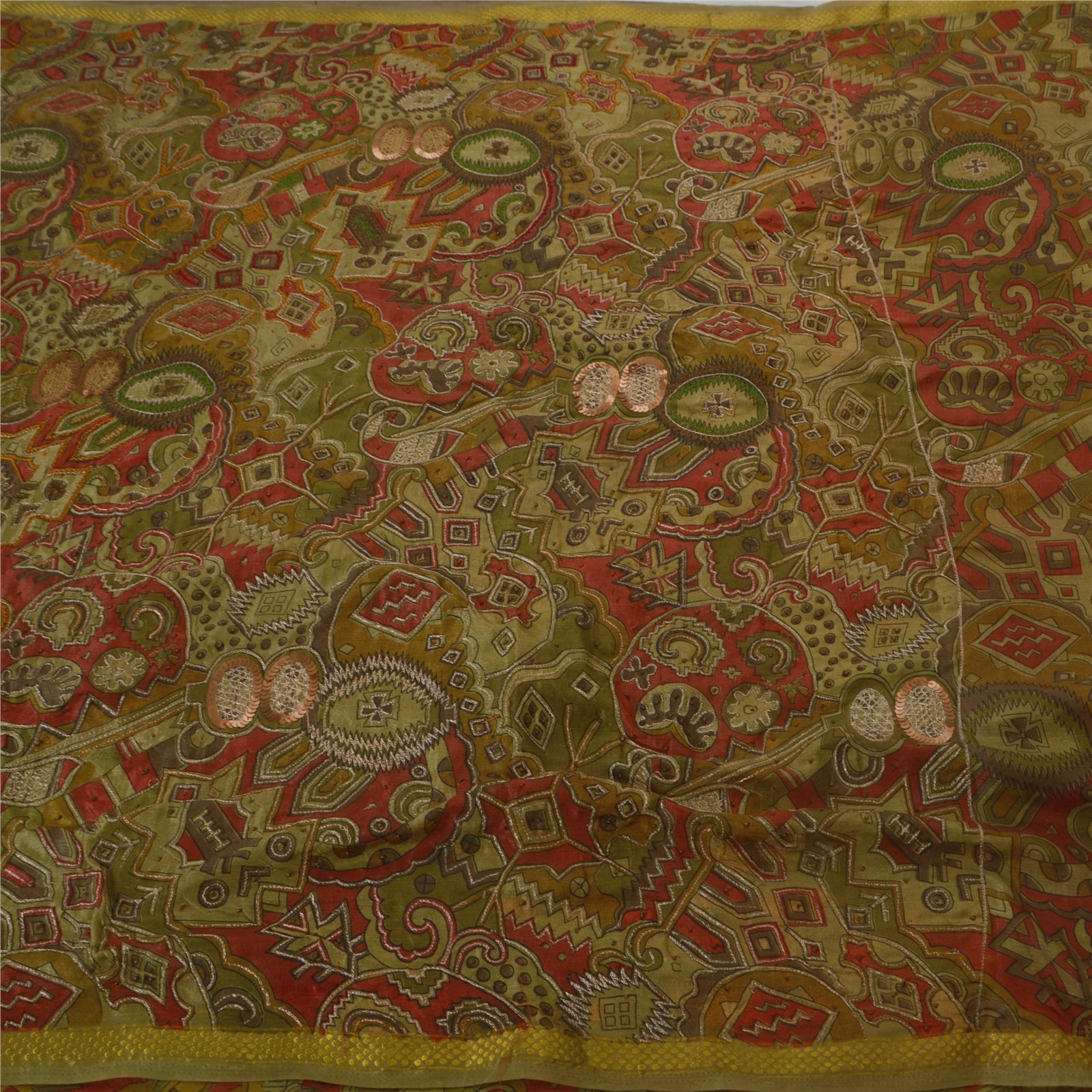 Sanskriti offers this beautiful vintage green saree which is crafted with artificial (art) silk and adorns hand beaded floral design. The pallu & the border of this sari features floral design which is embellished with thread work, golden zari, and beads. The center part of the sari boasts similar floral design with thread and zari work. This lovely vintage saree can be used for various crafting ideas too. Use it for dress designing, as a throw, as window dressing, upholstery, sarongs, table linen and much more. Let your creative juices flow! Note- This Sustainable Fabric is crafted with artificial silk, not pure silk.