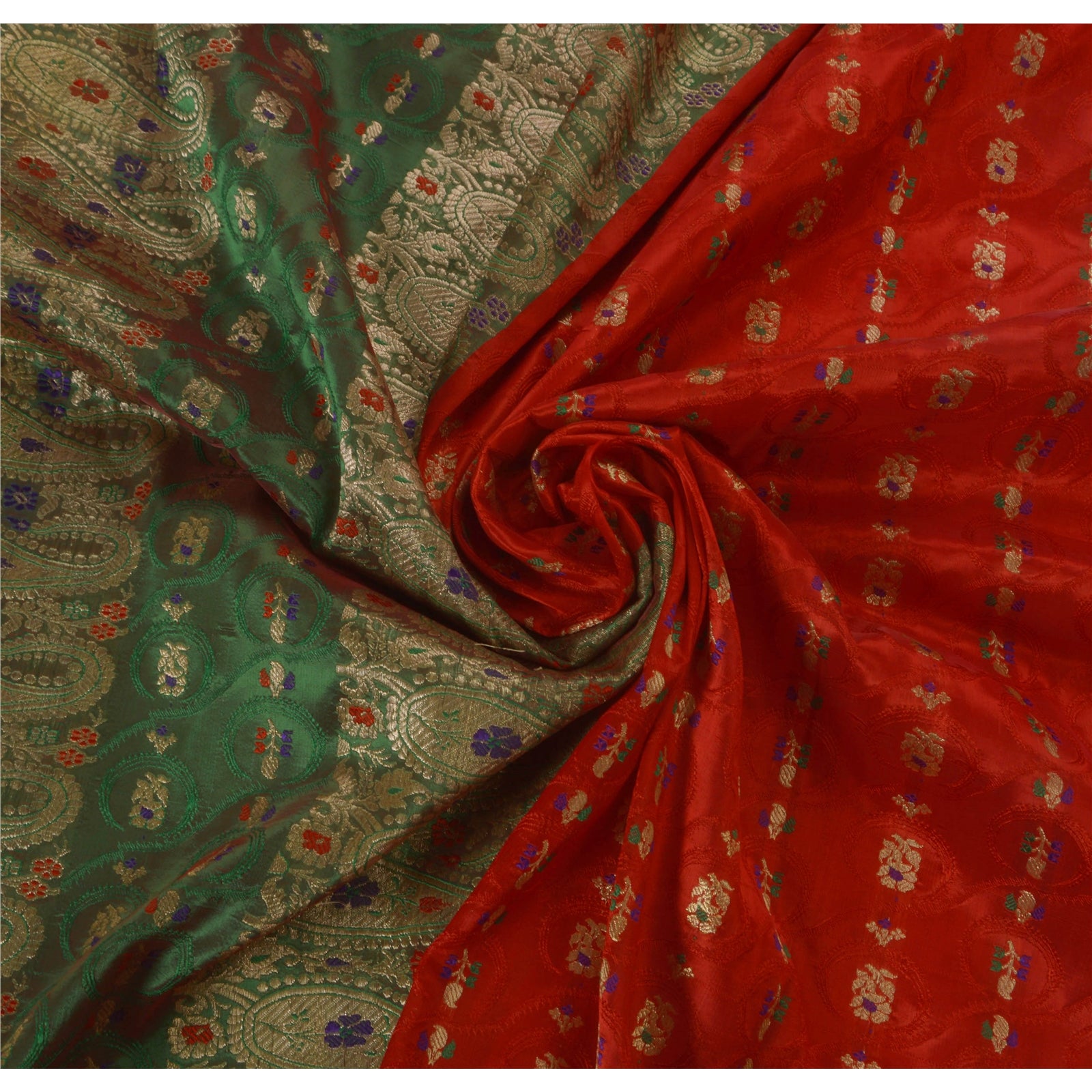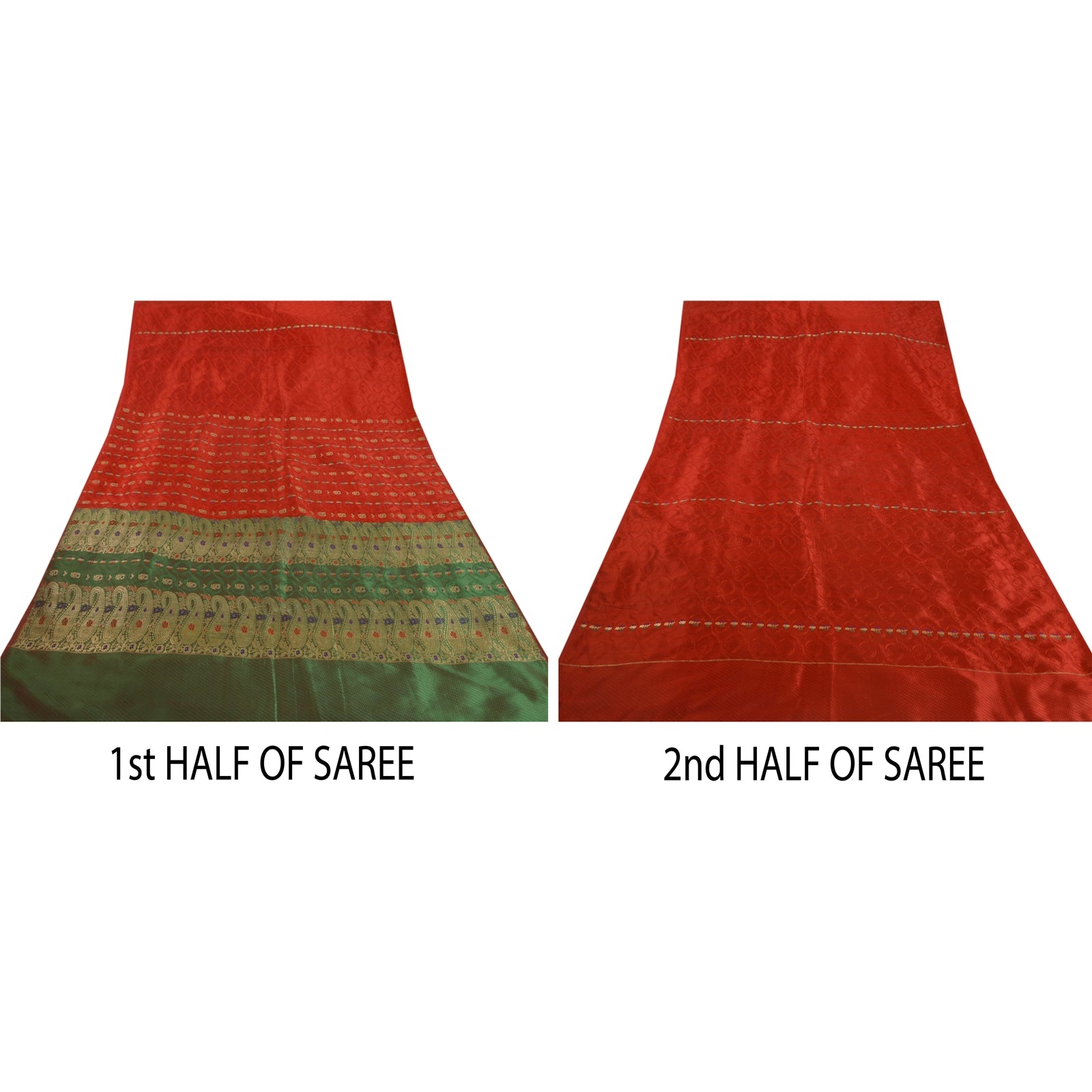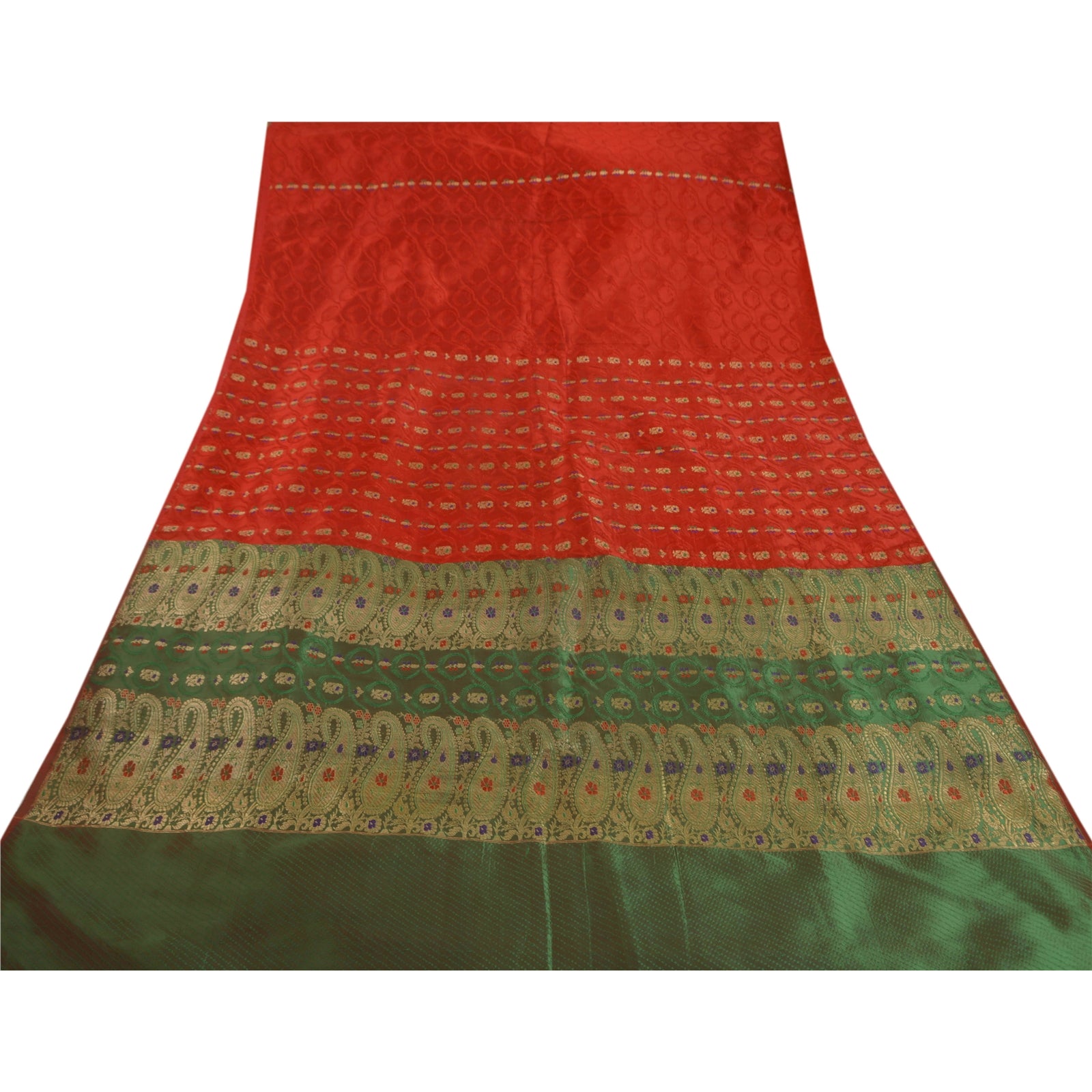 Sanskriti offers this beautiful vintage red saree which is crafted with artificial (art) silk and adorns woven paisley and floral design. The pallu & the border of this sari features paisley and floral design which is embellished with thread work and golden zari work over green base. The center part of the sari boasts similar floral motifs. This lovely vintage saree can be used for various crafting ideas too. Use it for dress designing, as a throw, as window dressing, upholstery, sarongs, table linen and much more. Let your creative juices flow! Note- This Sustainable Fabric is crafted with artificial silk, not pure silk.