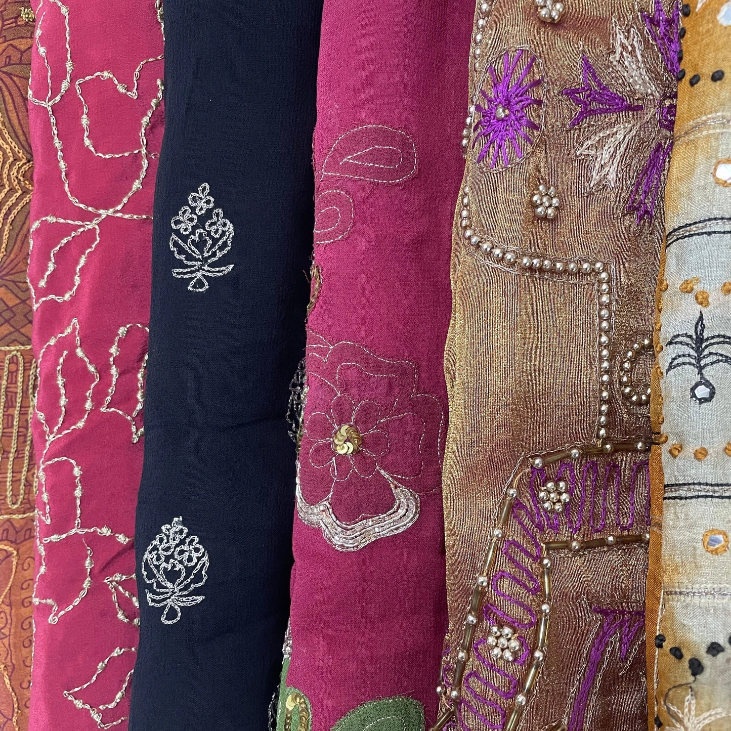 These are used sari, you will find stains and holes, but since the sari generally come 5 yards long there is plenty of Sustainable Fabric to play with. They come in all colors and prints. Just imagine the history they carry, the sari is traditional dress for women in India and to this day you will see the street flooded in colors and women wrapped in cloth.