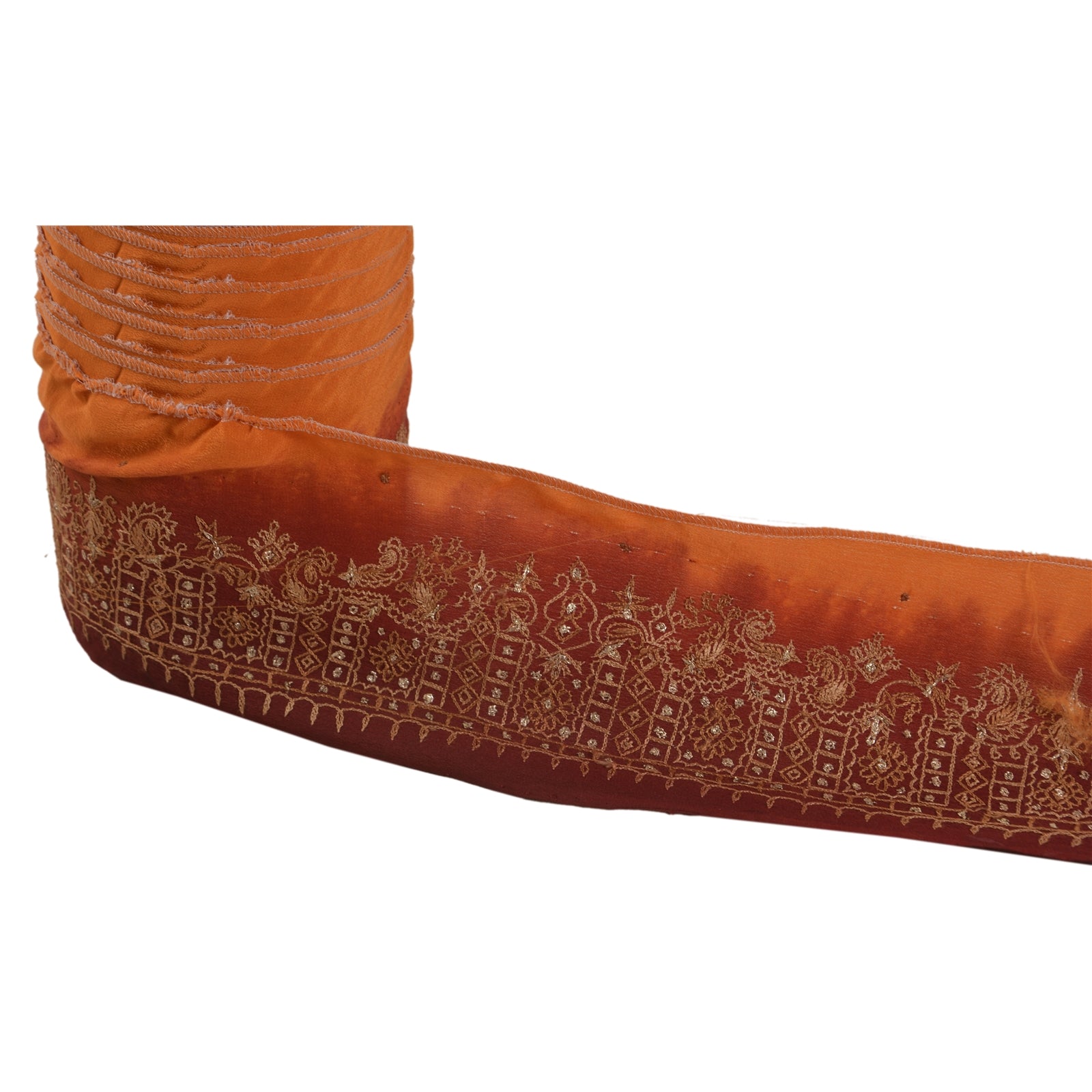 Amazing crepe silk hand embroidered sari border in brown & orange color highlighting zari work. Border has beautiful floral patterns painstakingly hand embroidered with brown thread work. Further you can see fine detailing with golden zari work. WOW!! an awesome one of a kind versatile border. 1 Quantity = 6 Yard