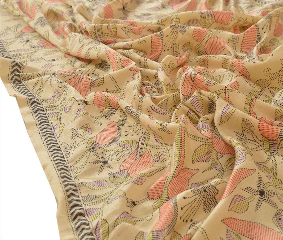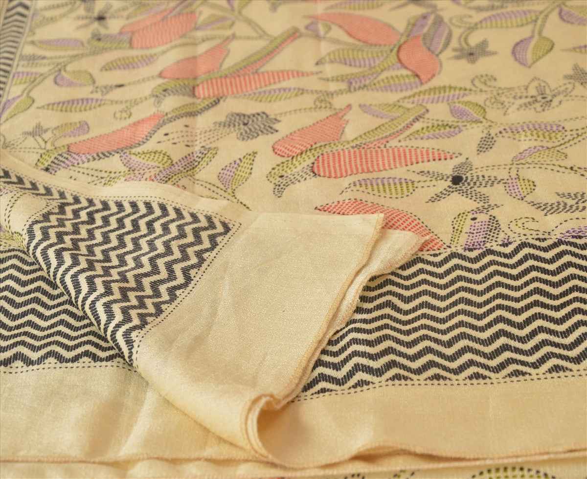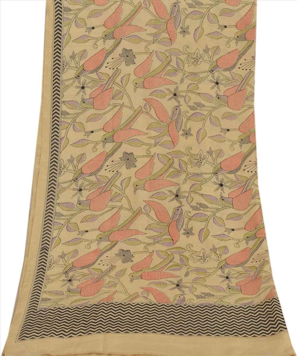 Sanskriti Vintage Dupatta Long Stole Art Silk Cream Wrap Hijab Kantha Printed Veil Scarves