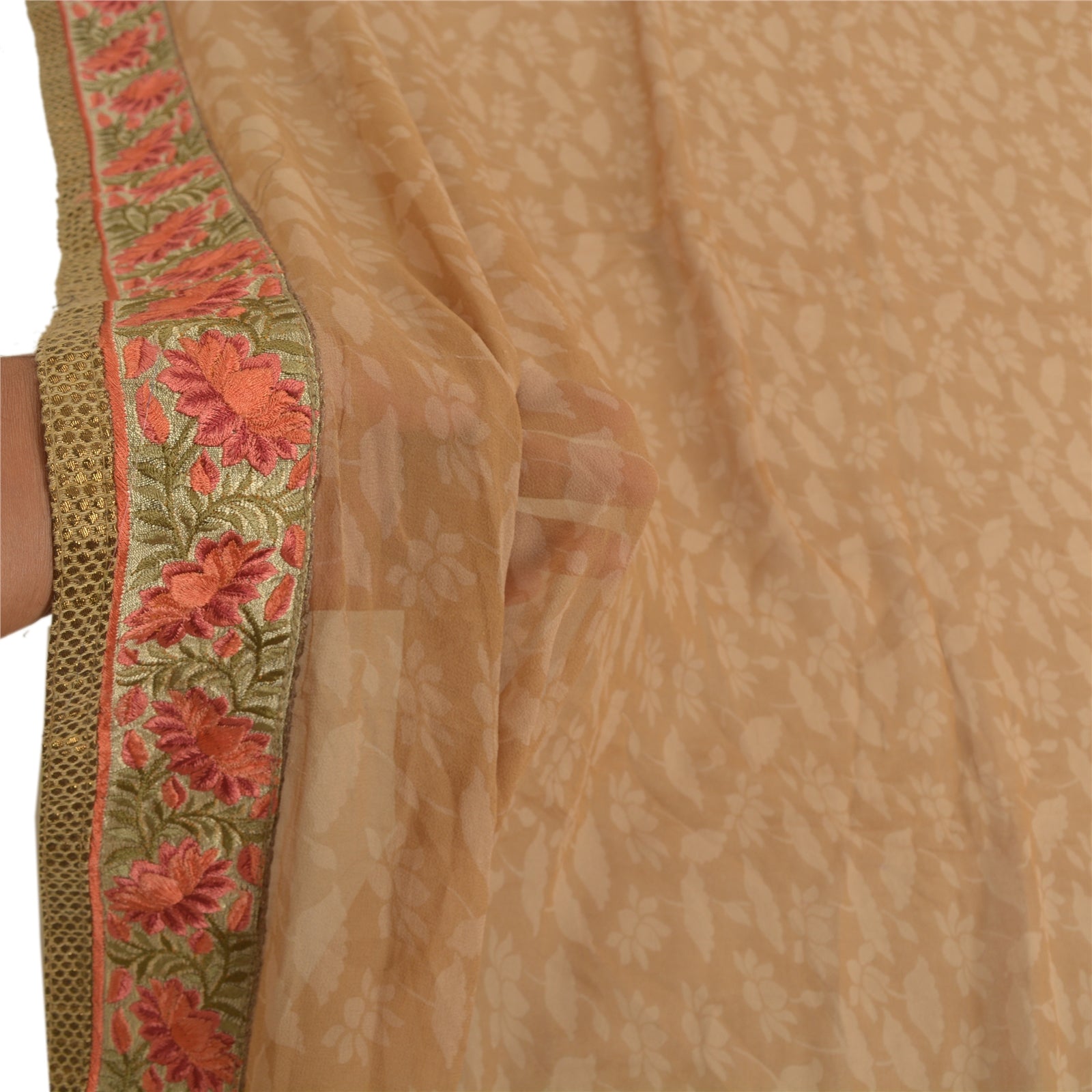 Elegant Beige colored georgette printed long scarf/dupatta. The center portion has printed floral design . Border of the dupatta has embroidered floral design with peach and green color. This item's Beauty Factor Nice pattern with printed work on beige color base Sustainable Fabric is really enhancing the beauty of the dupatta.