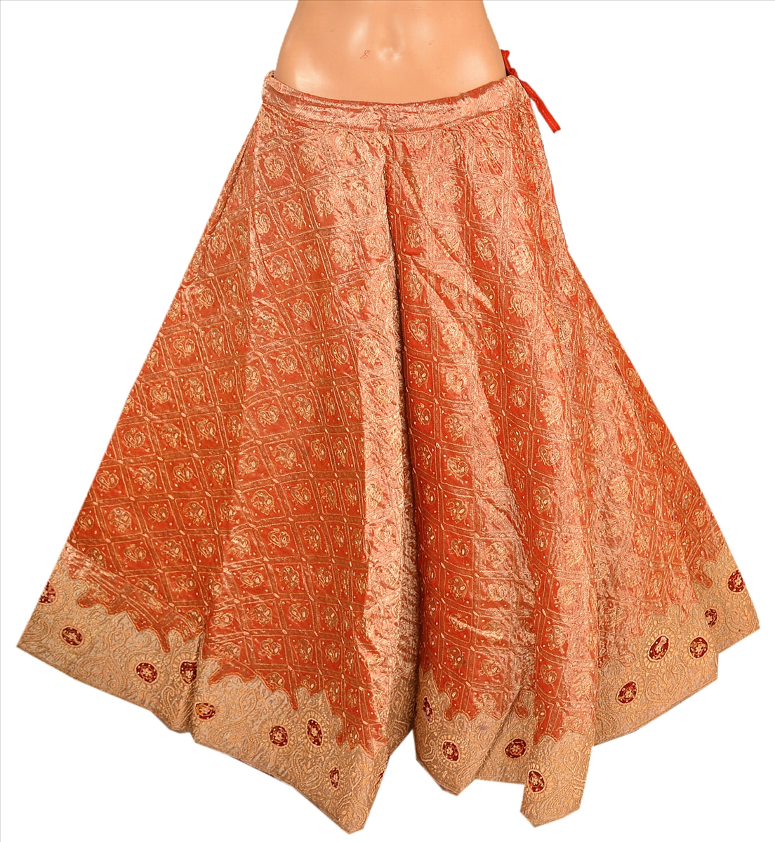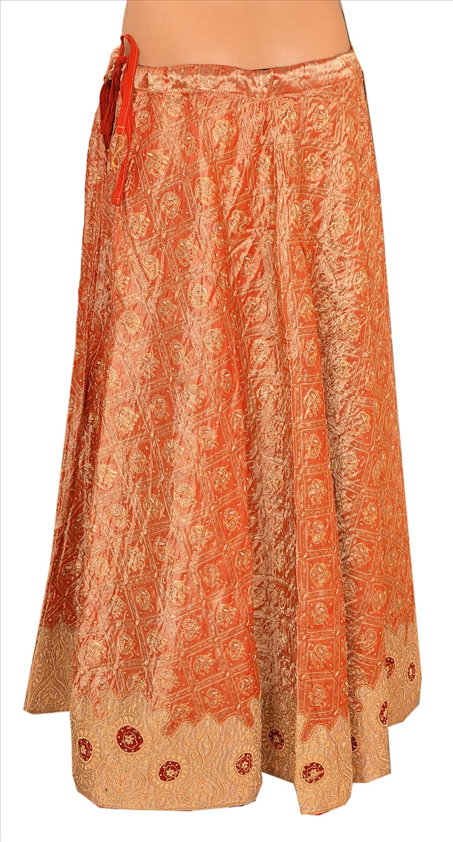 Attractive tissue silk hand embroidered woven brocade skirt with gold dori work, gold/silver zardozi/dabka work, white glass beads with green/gold/ maroon patch work along with elephant, floral & peacock design on golden red base Sustainable Fabric. Awesome & unique pattern with golden & maroon patch work on golden red color base Sustainable Fabric is really enhancing the beauty of the skirt.