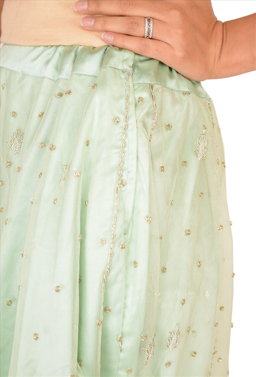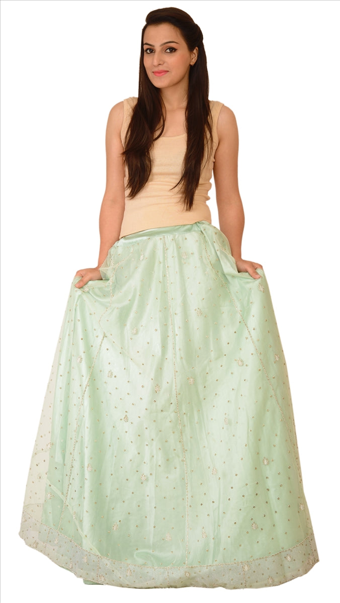 Sanskriti Vintage Green Net Skirt Long Stitched Bollywood Hand Beaded Zardozi L Size