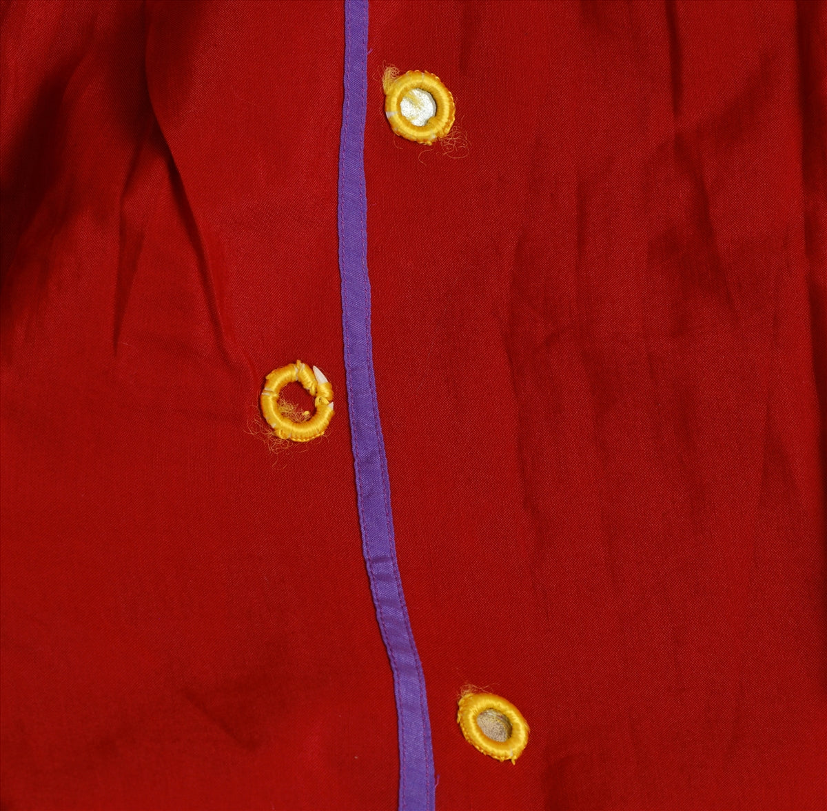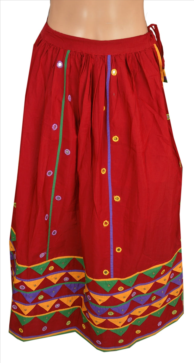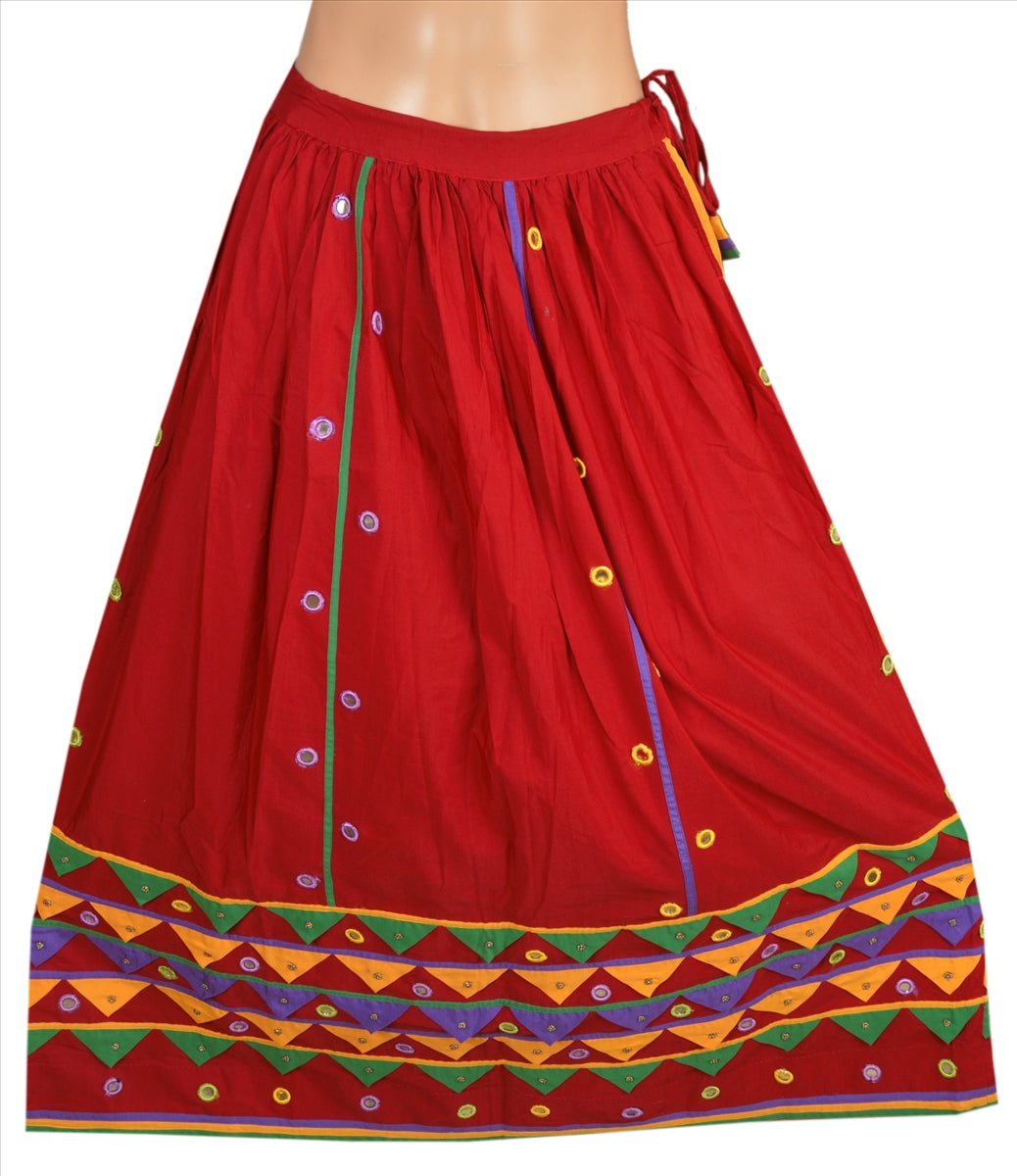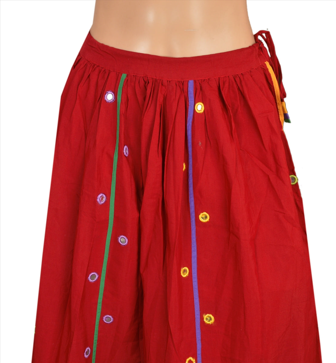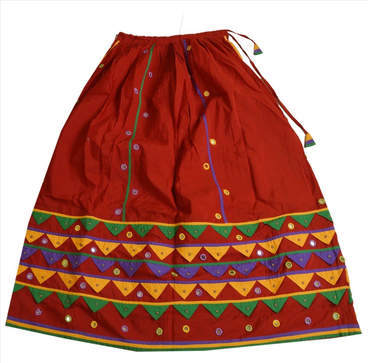 Maroon color cotton skirt with hand embroidered floral design with green, purple thread work, gold glass beads, mirror work with yellow, green, purple color Sustainable Fabric patch work. Sparkling mirror work with vibrant patch work on maroon base Sustainable Fabric is really enhancing the beauty of skirt.