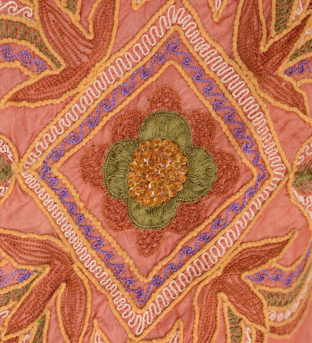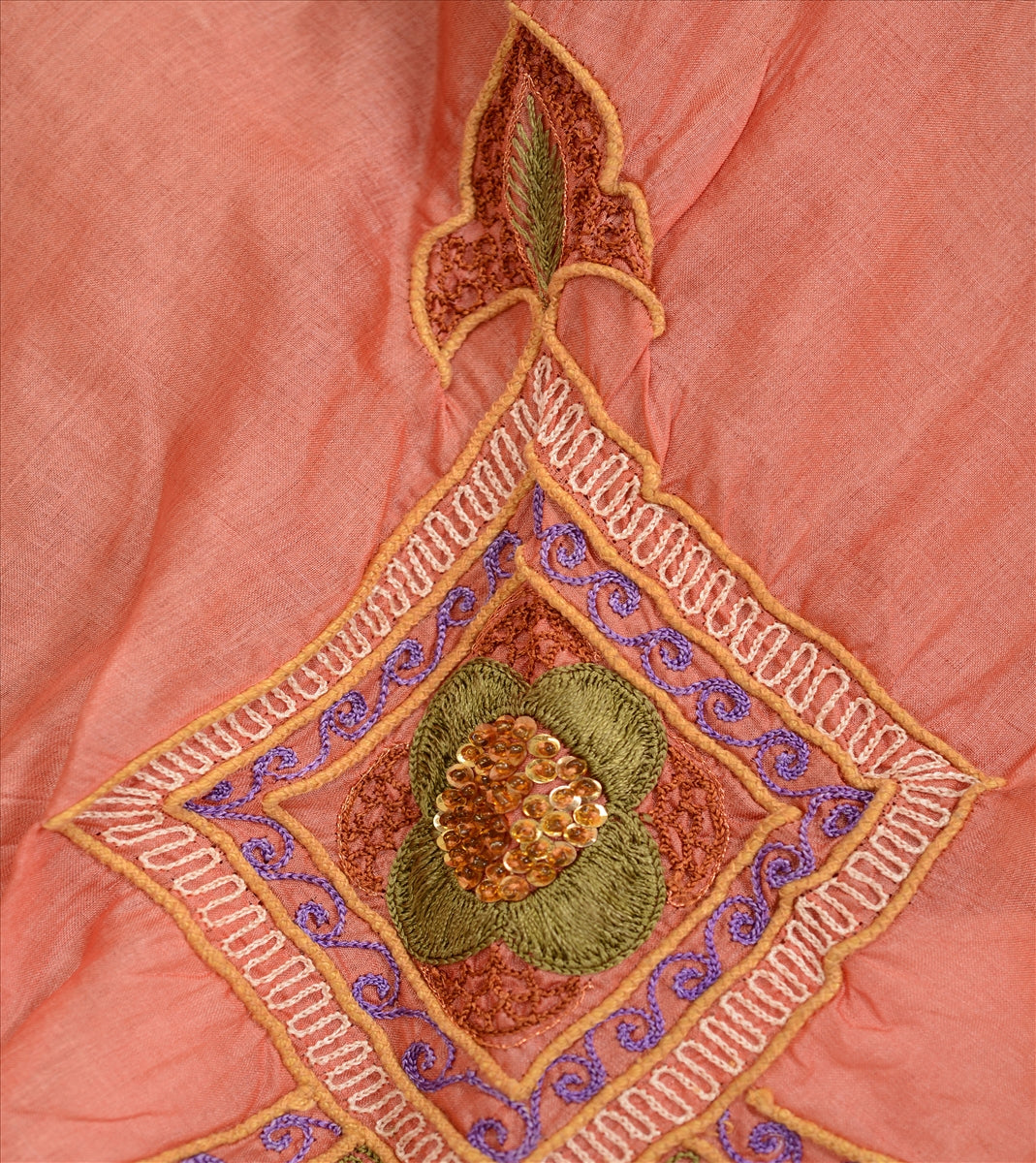 Peach color pure silk skirt with hand embroidered floral design with white, green, brown, purple thread work cream dori work, copper zari work, gold sequins, yellow glass beads. Multi color thread work with floral pattern on peach base Sustainable Fabric is really enhancing the beauty of skirt.
