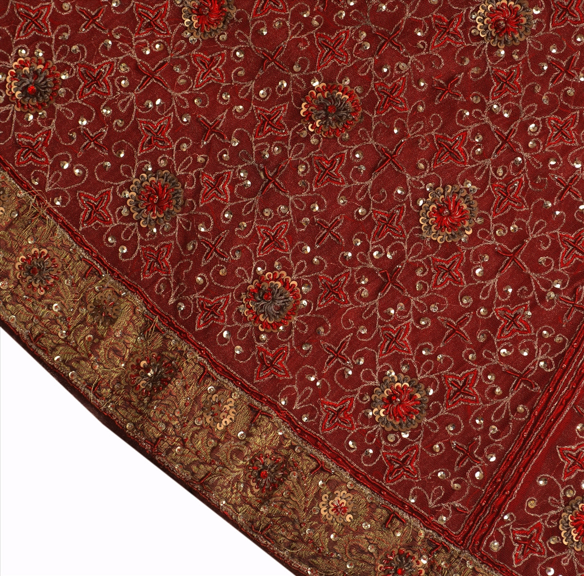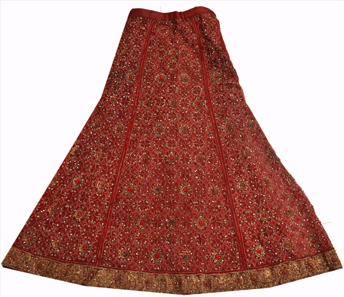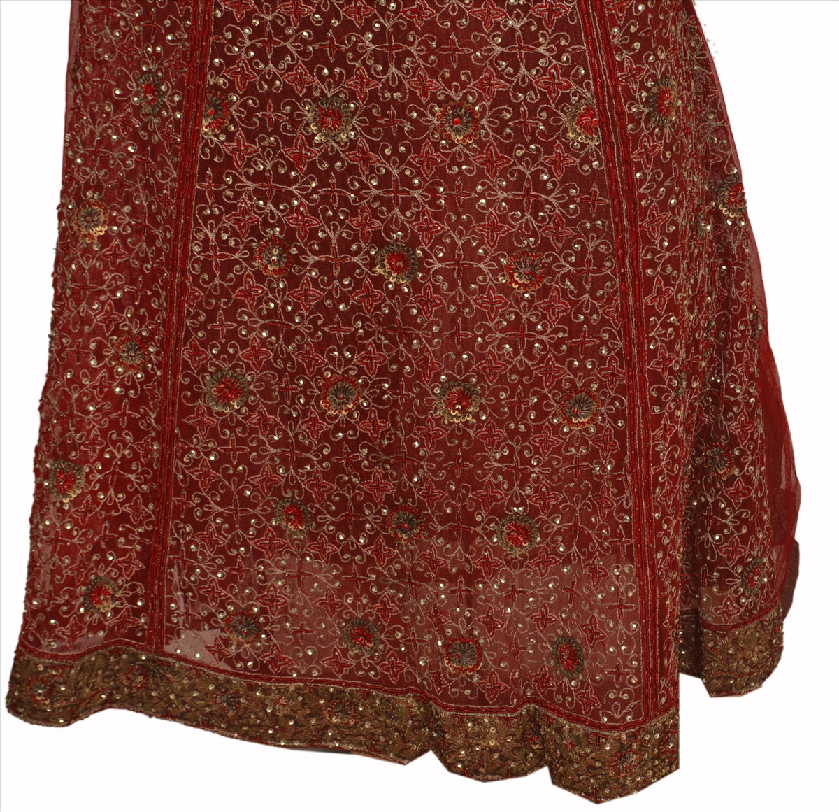 Maroon color net skirt with hand embroidered floral design with gold/maroon thread work, gold zari work, red zardozi work, gold sequins, red ad stone, white glass beads work with golden woven Sustainable Fabric patch work on bottom.., Shimmering sequins work with golden patch work on maroon base Sustainable Fabric is really enhancing the beauty of skirt.
