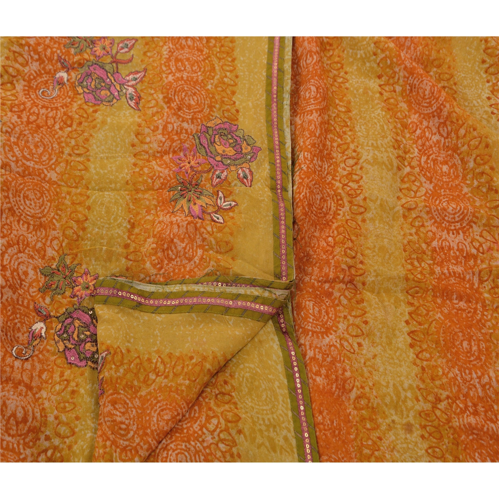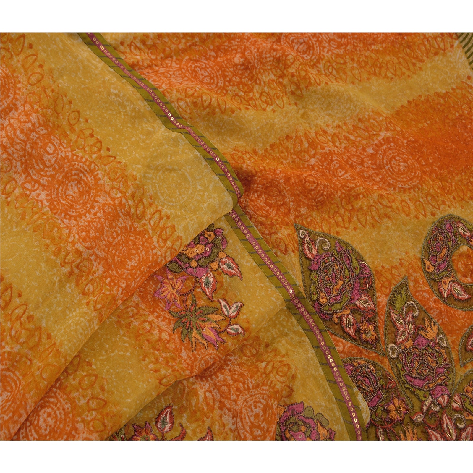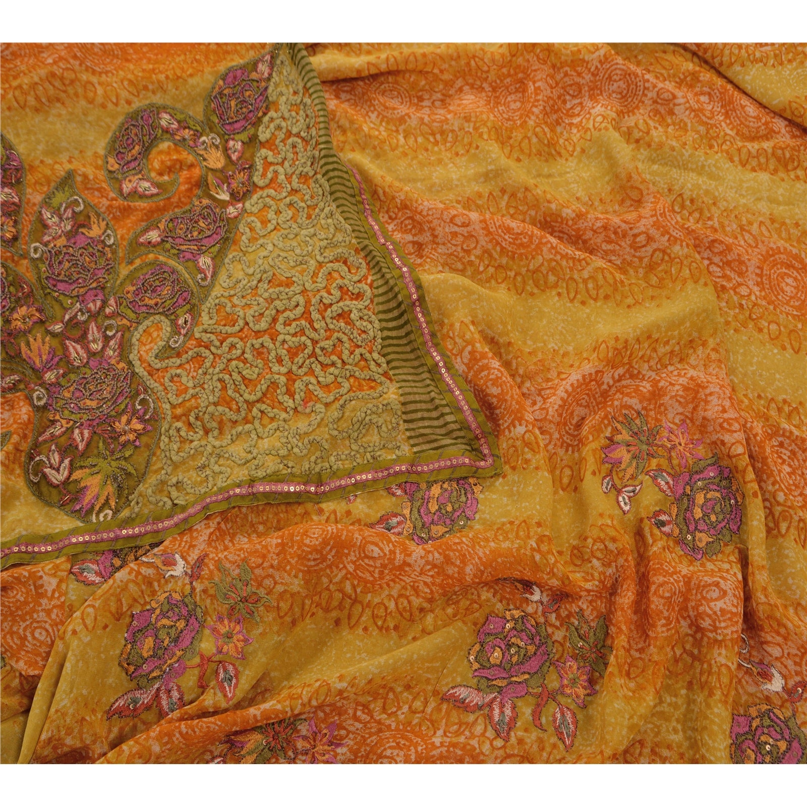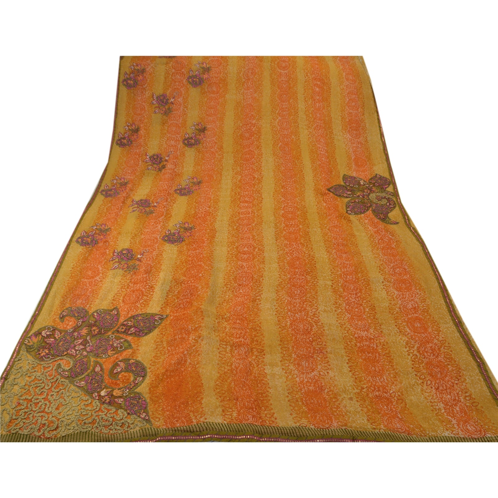 ? Beautiful orange & green colored hand printed pure georgette silk sari ? Pallu & border features floral design embellished with pink/saffron/green/cream thread work, gold zari/zardozi work, gold sequins, green dori work and gold beads work with net Sustainable Fabric work. ? There are green Sustainable Fabric patch work with pink lace work on both sides of borders. ? There are floral motifs with similar work in center part of sari. What is special about this saree? Vibrant multi color thread work with green dori work on green & orange color base Sustainable Fabric is really enhancing the beauty of the saree. This unique vintage saree can be used for various crafting ideas even if you don't want to use it as a sari. Design a dress, use it as a throw, as window dressing, upholstery, sarongs, table linen and much more. Let your creative juices flow and use this decorated Sustainable Fabric in multiple fashion.