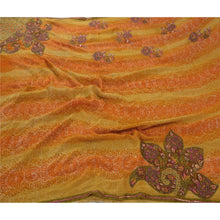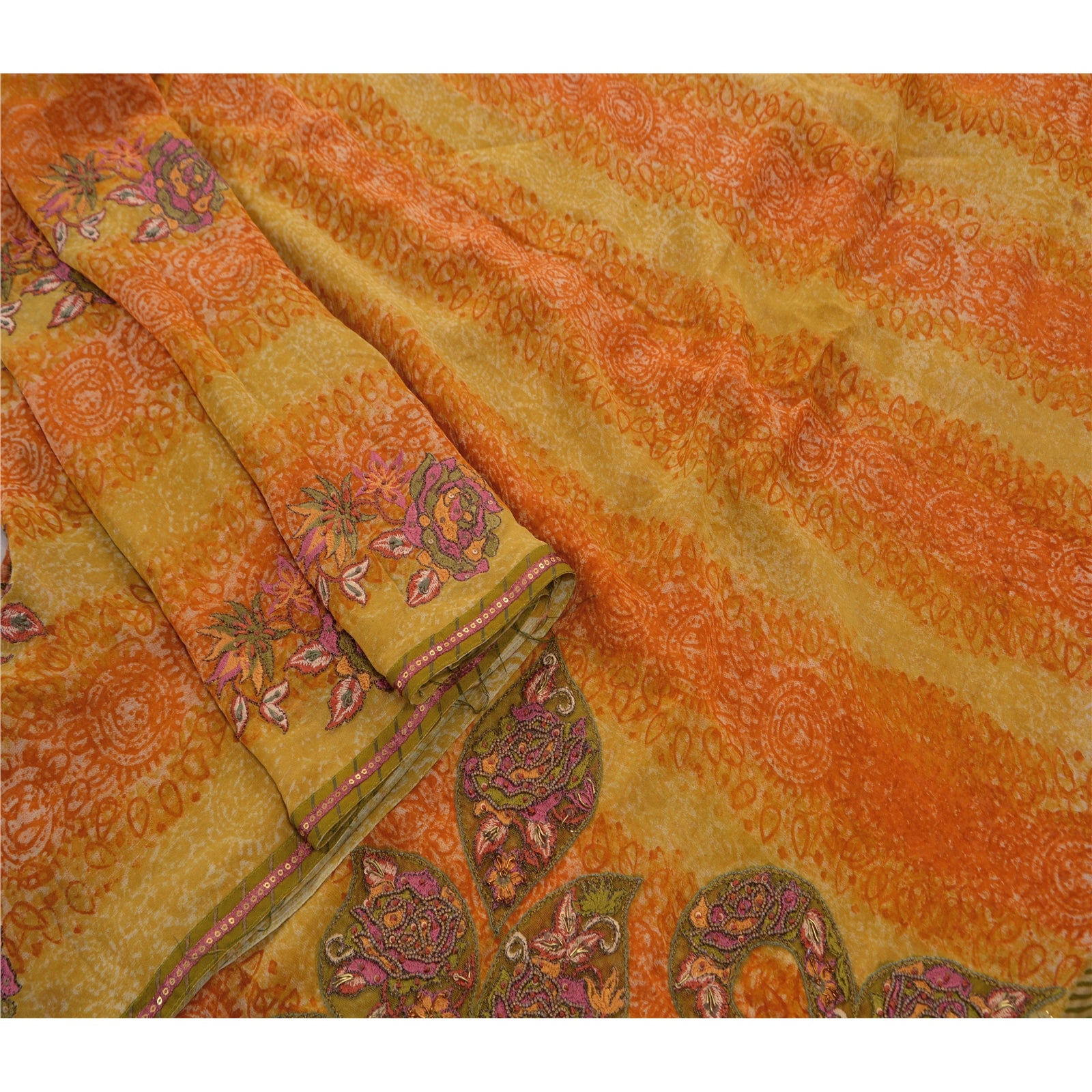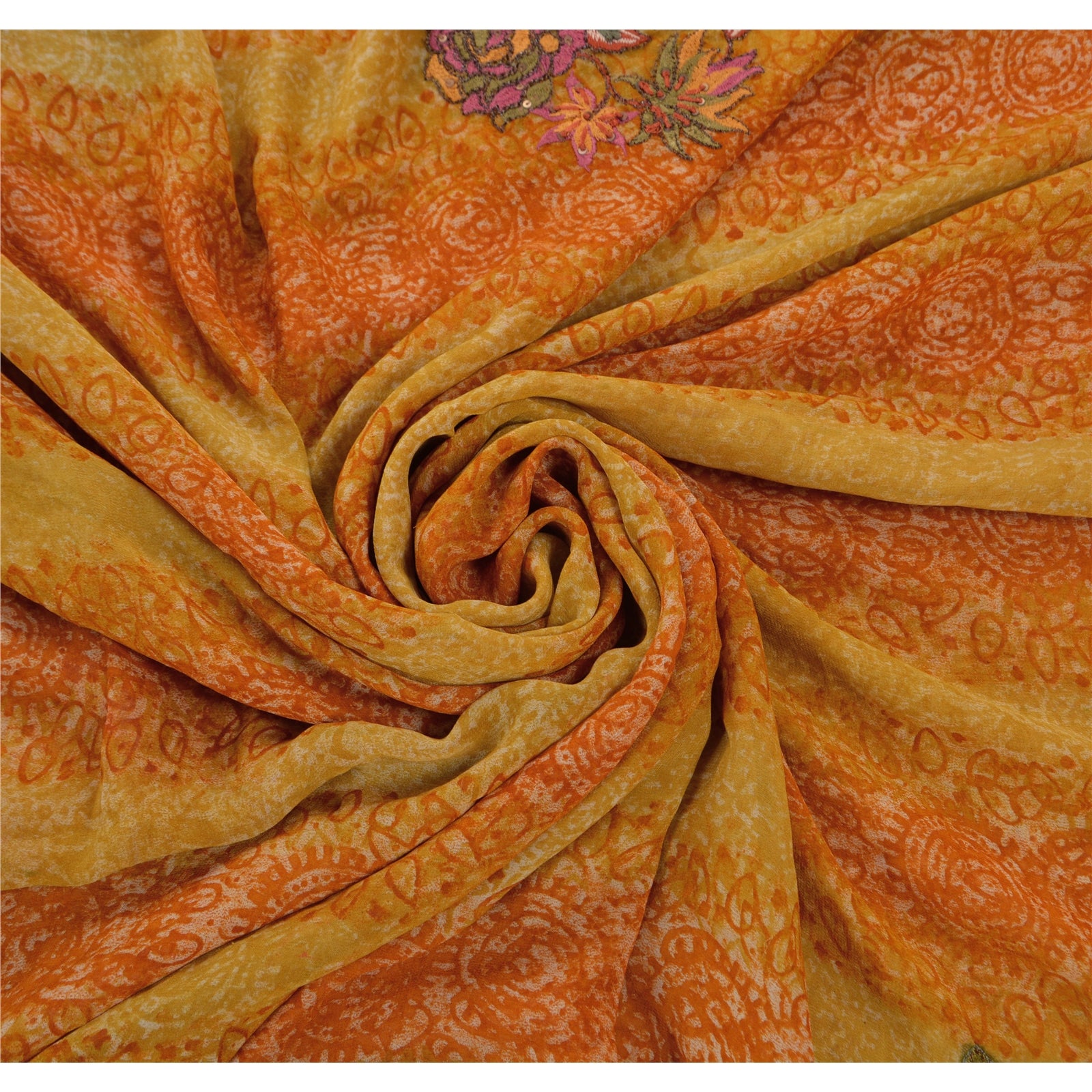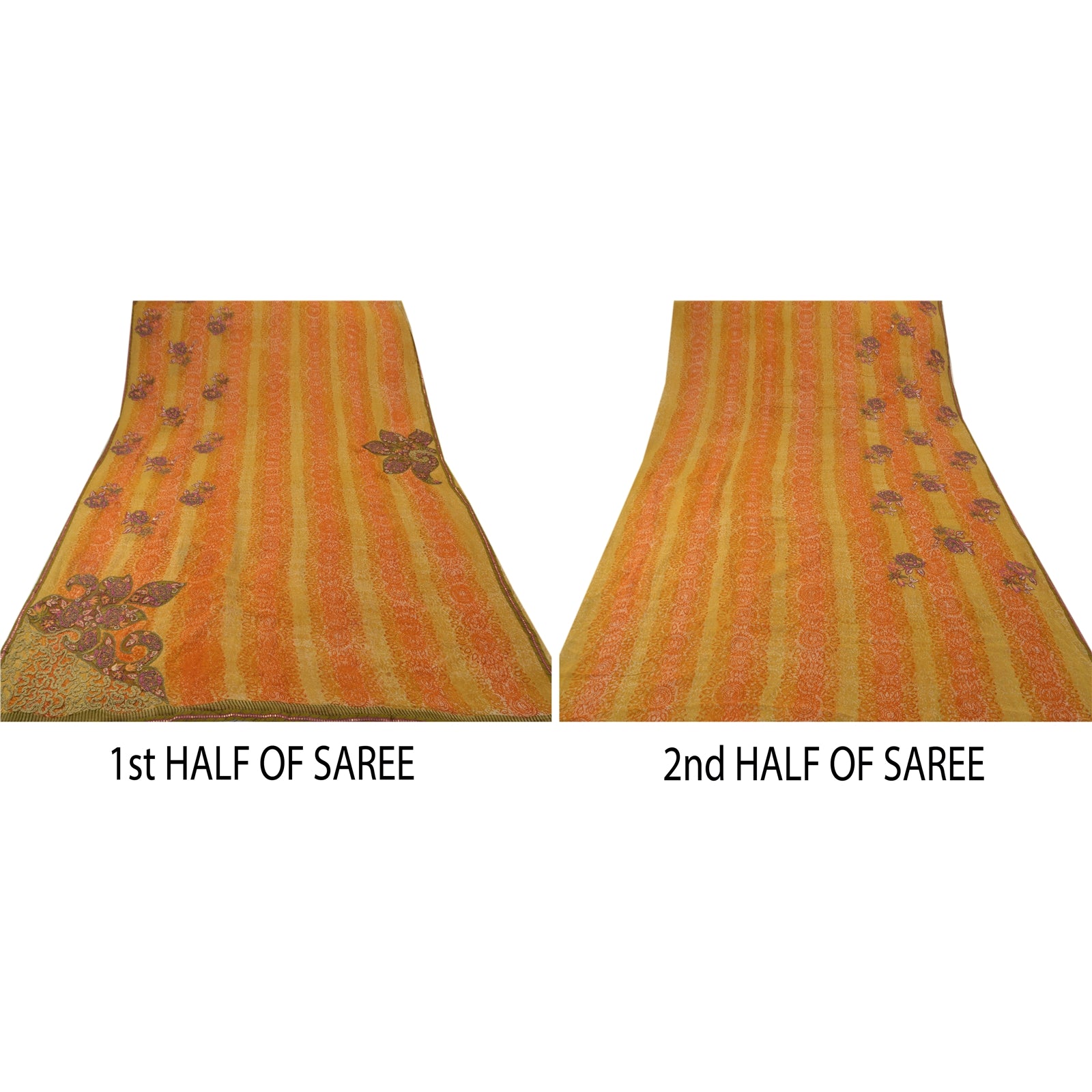 ? Beautiful orange & green colored hand printed pure georgette silk sari ? Pallu & border features floral design embellished with pink/saffron/green/cream thread work, gold zari/zardozi work, gold sequins, green dori work and gold beads work with net Sustainable Fabric work. ? There are green Sustainable Fabric patch work with pink lace work on both sides of borders. ? There are floral motifs with similar work in center part of sari. What is special about this saree? Vibrant multi color thread work with green dori work on green & orange color base Sustainable Fabric is really enhancing the beauty of the saree. This unique vintage saree can be used for various crafting ideas even if you don't want to use it as a sari. Design a dress, use it as a throw, as window dressing, upholstery, sarongs, table linen and much more. Let your creative juices flow and use this decorated Sustainable Fabric in multiple fashion.
