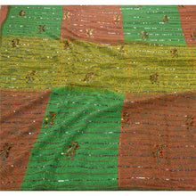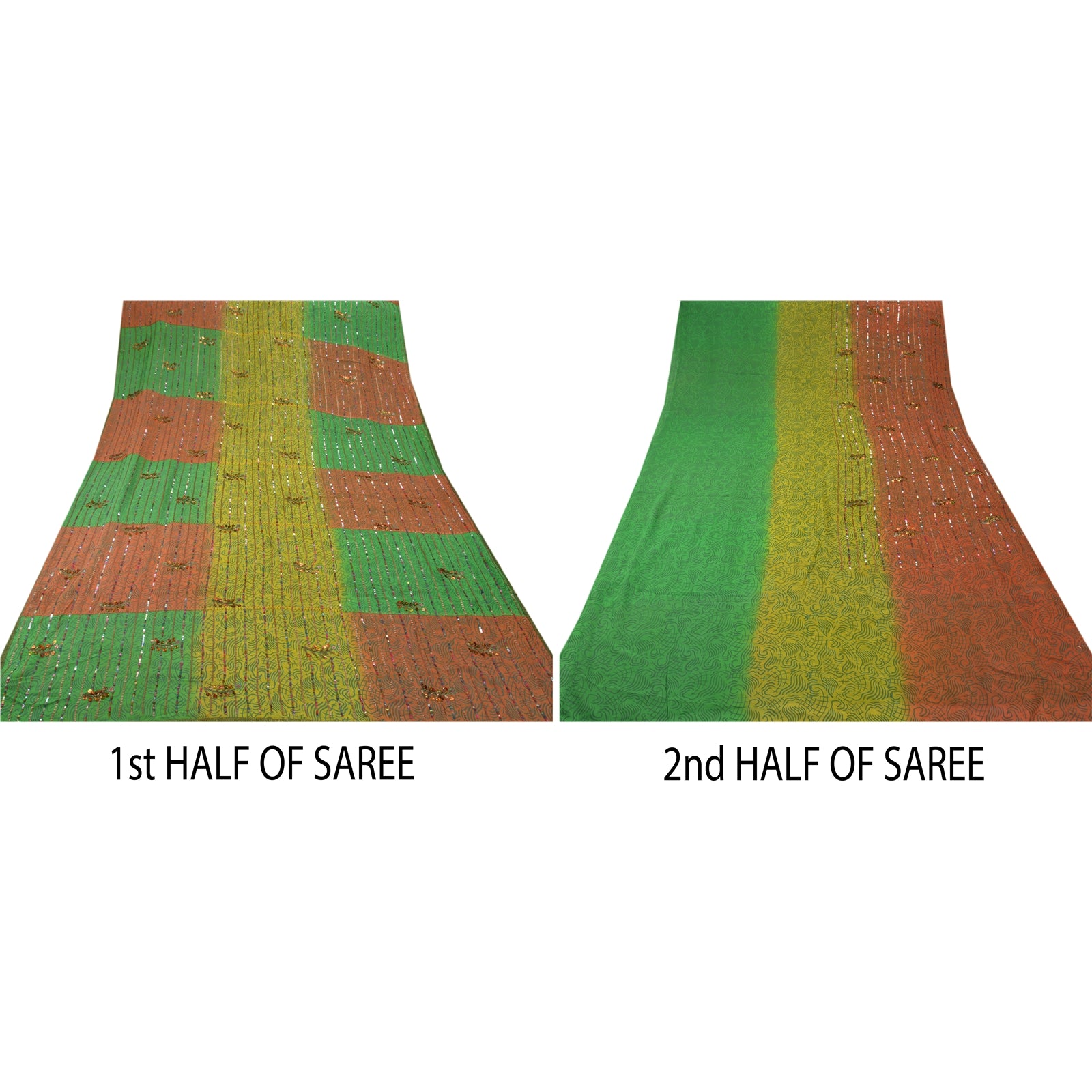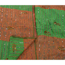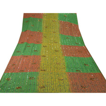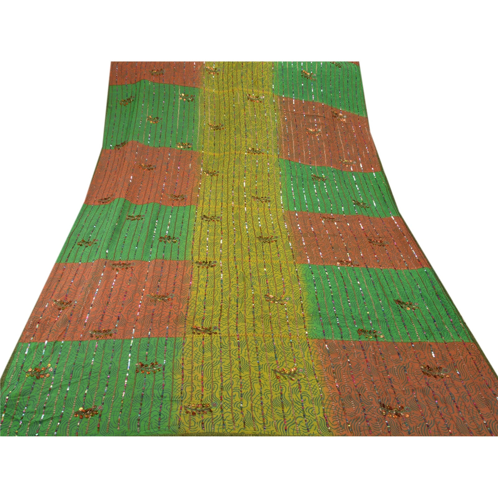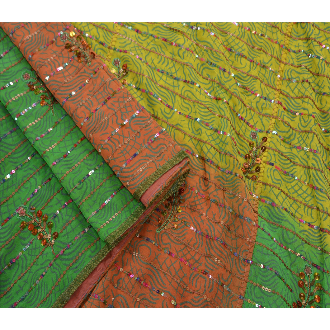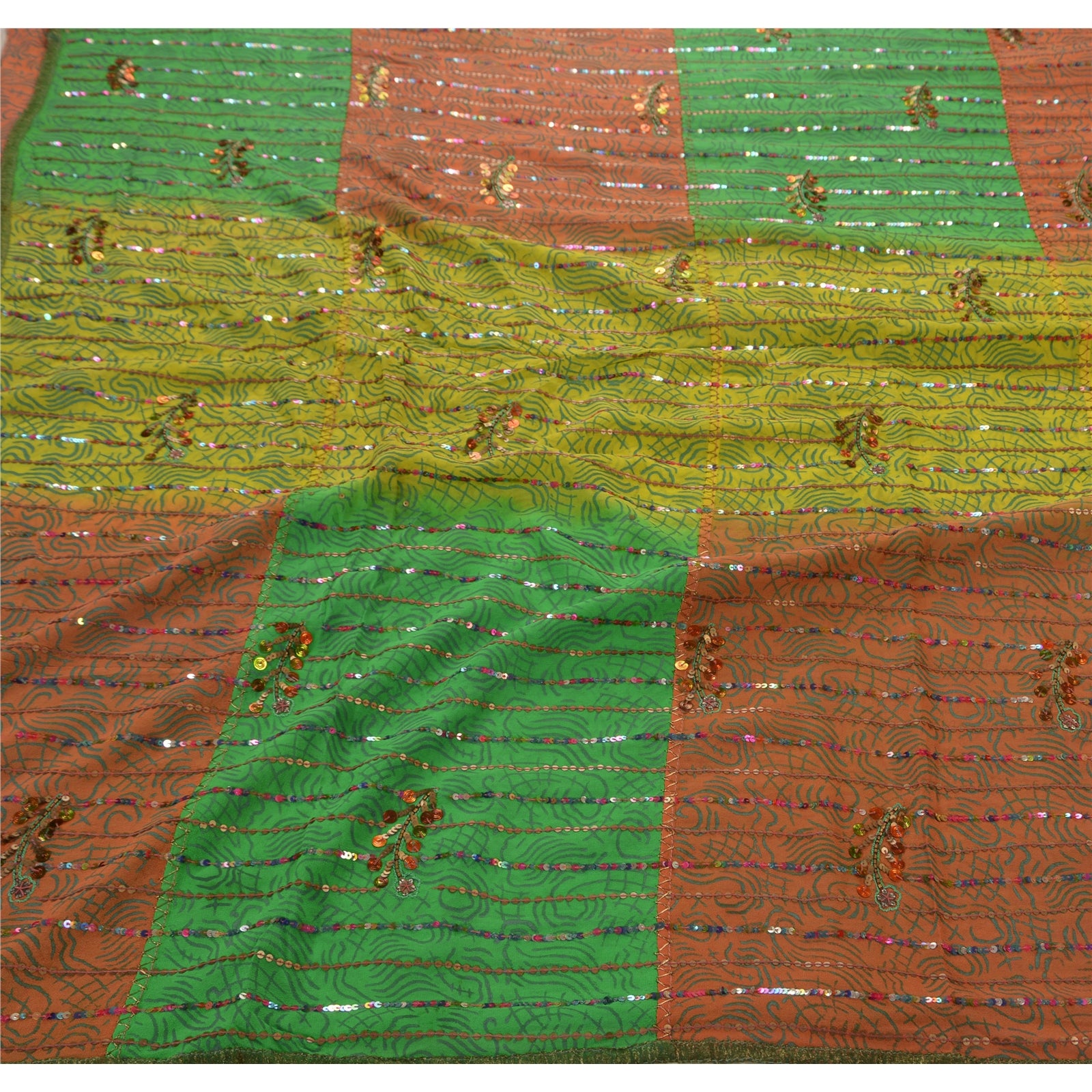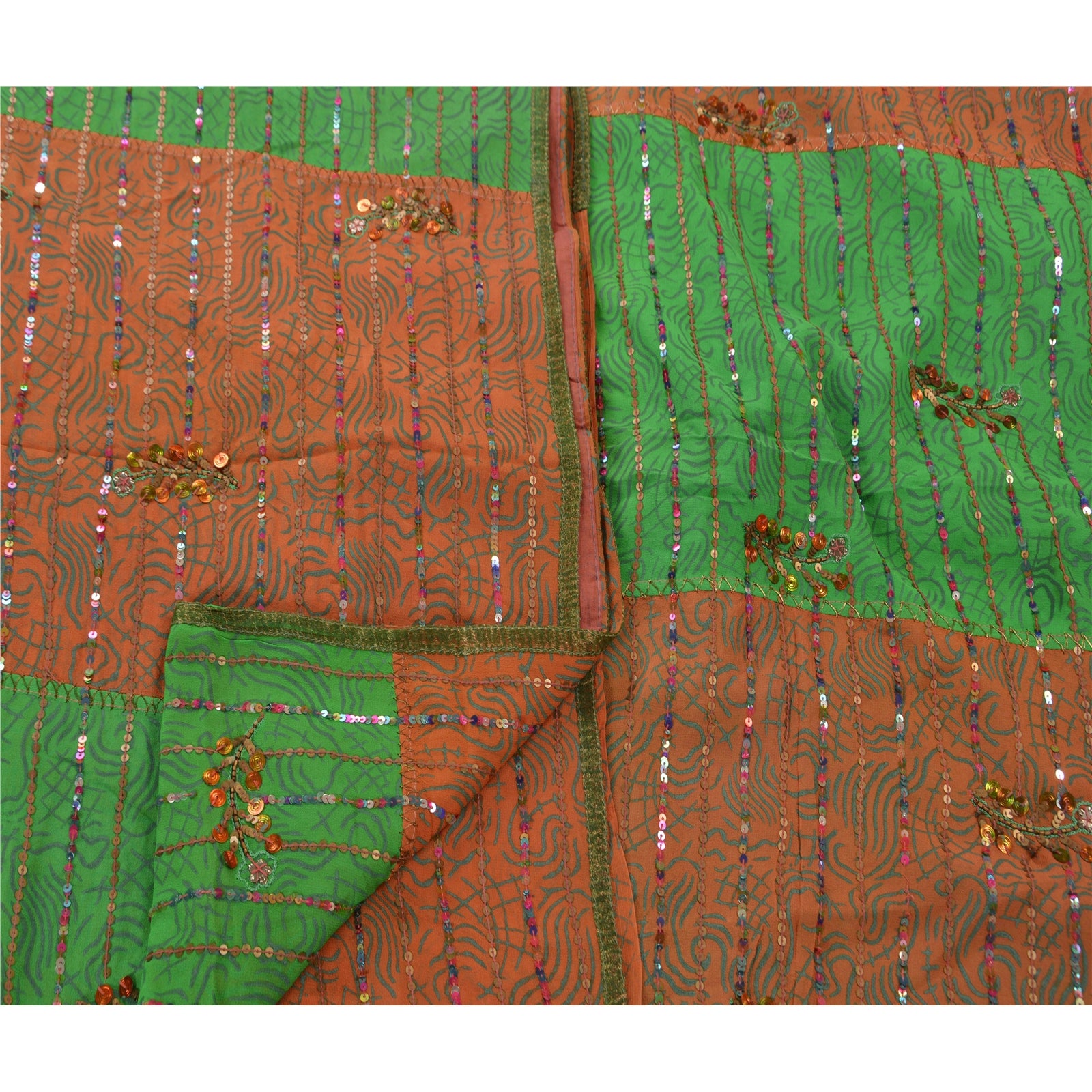 ? Beautiful orange & green colored hand embroidered painted pure georgette silk sari ? All over sari features floral design embellished with green thread work, gold beads and multi color/metallic sequins work. ? There are golden Sustainable Fabric patch work on both sides of borders. What is special about this saree? Shimmering multi color sequins work with golden painted work on green & orange color base Sustainable Fabric is really enhancing the beauty of the saree. This unique vintage saree can be used for various crafting ideas even if you don't want to use it as a sari. Design a dress, use it as a throw, as window dressing, upholstery, sarongs, table linen and much more. Let your creative juices flow and use this decorated Sustainable Fabric in multiple fashion.