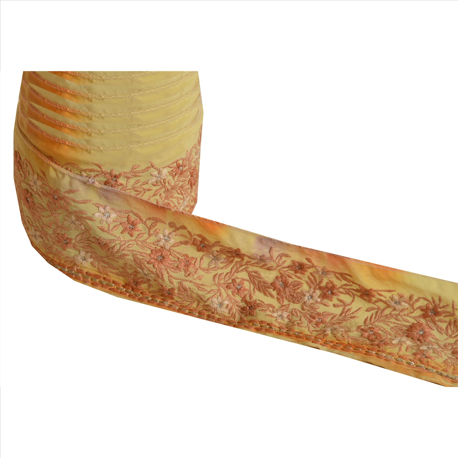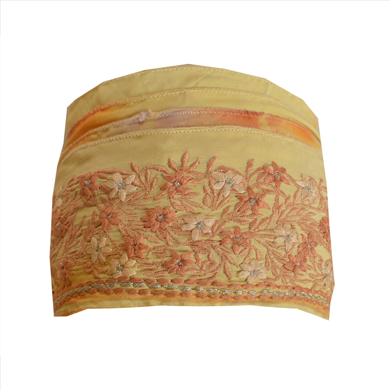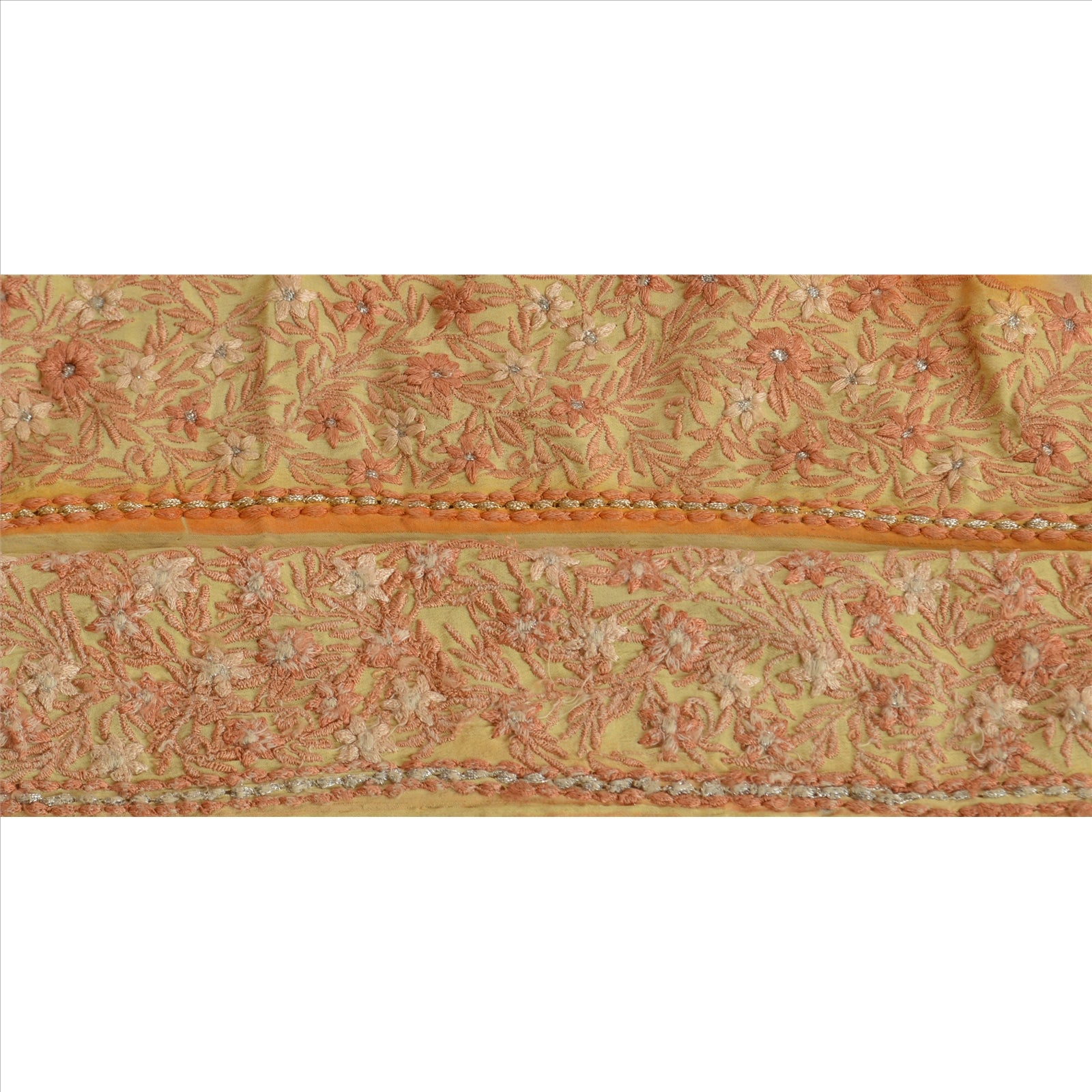 Beautiful pure crepe silk embroidered sari border. Further embellished by cream/peach/silver thread work along with floral design on cream base Sustainable Fabric.