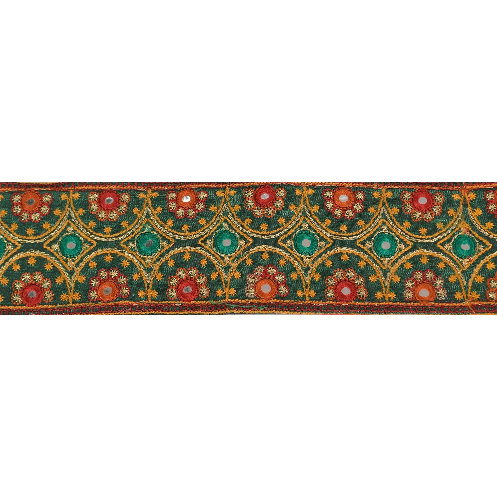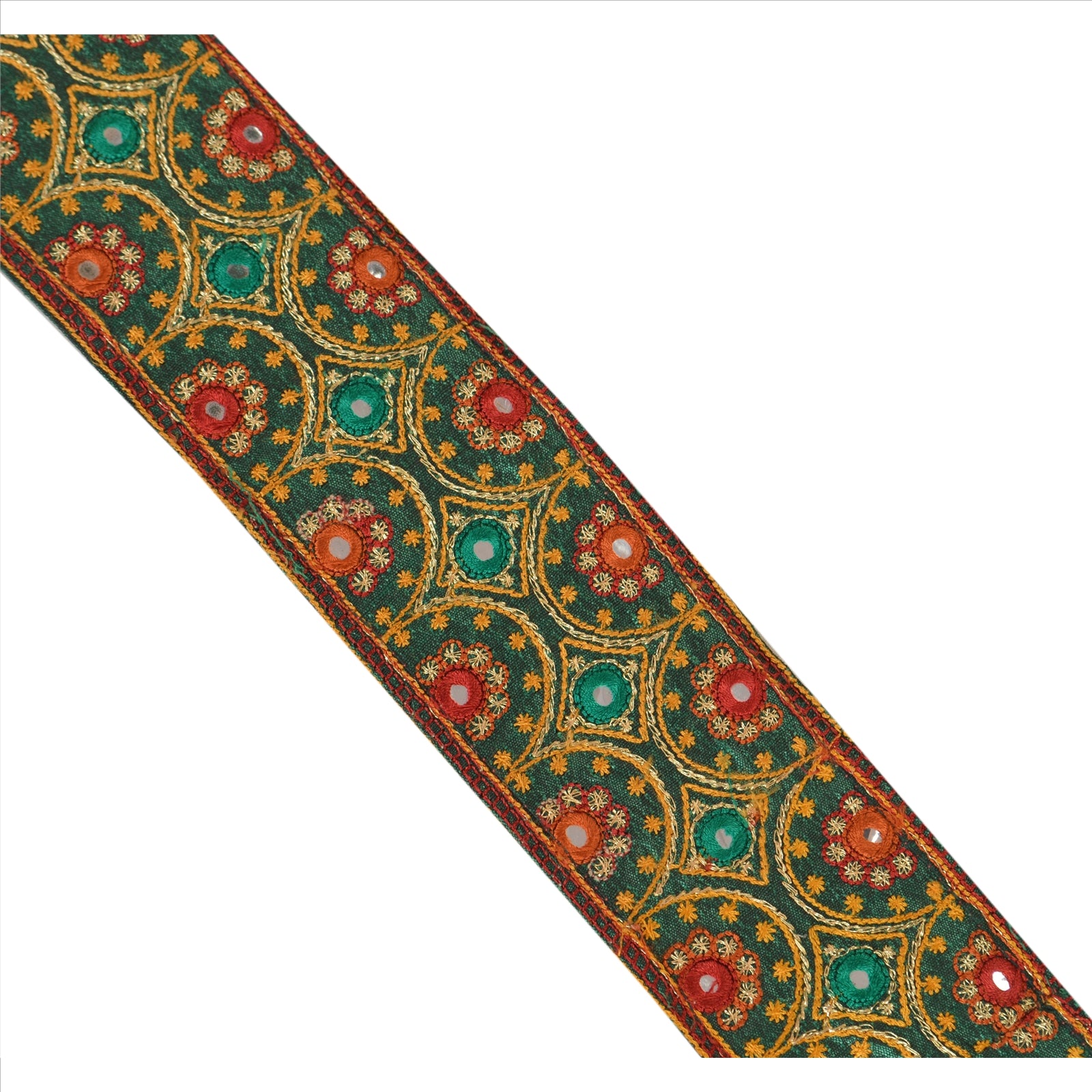 Beautiful georgette embroidered sari border. Further embellished by green/maroon/saffron/gold thread work . Also you can see mirror work, green Sustainable Fabric patch work along with floral design on pink base Sustainable Fabric. 1 quantity = 1 yard