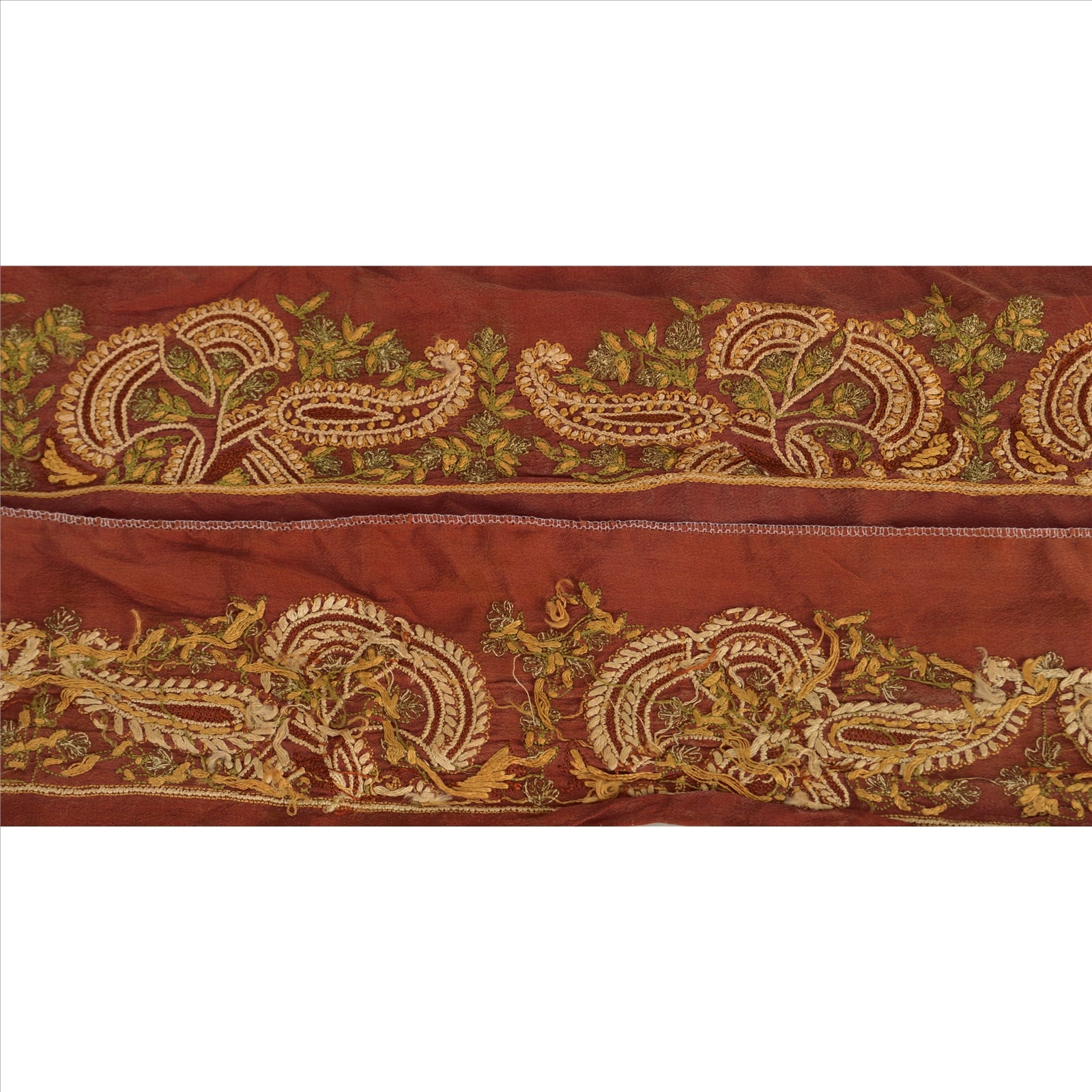Beautiful pure crepe silk hand embroidered sari border. Further embellished by cream/green thread work, gold zari work along with floral & paisley design on orange base Sustainable Fabric.