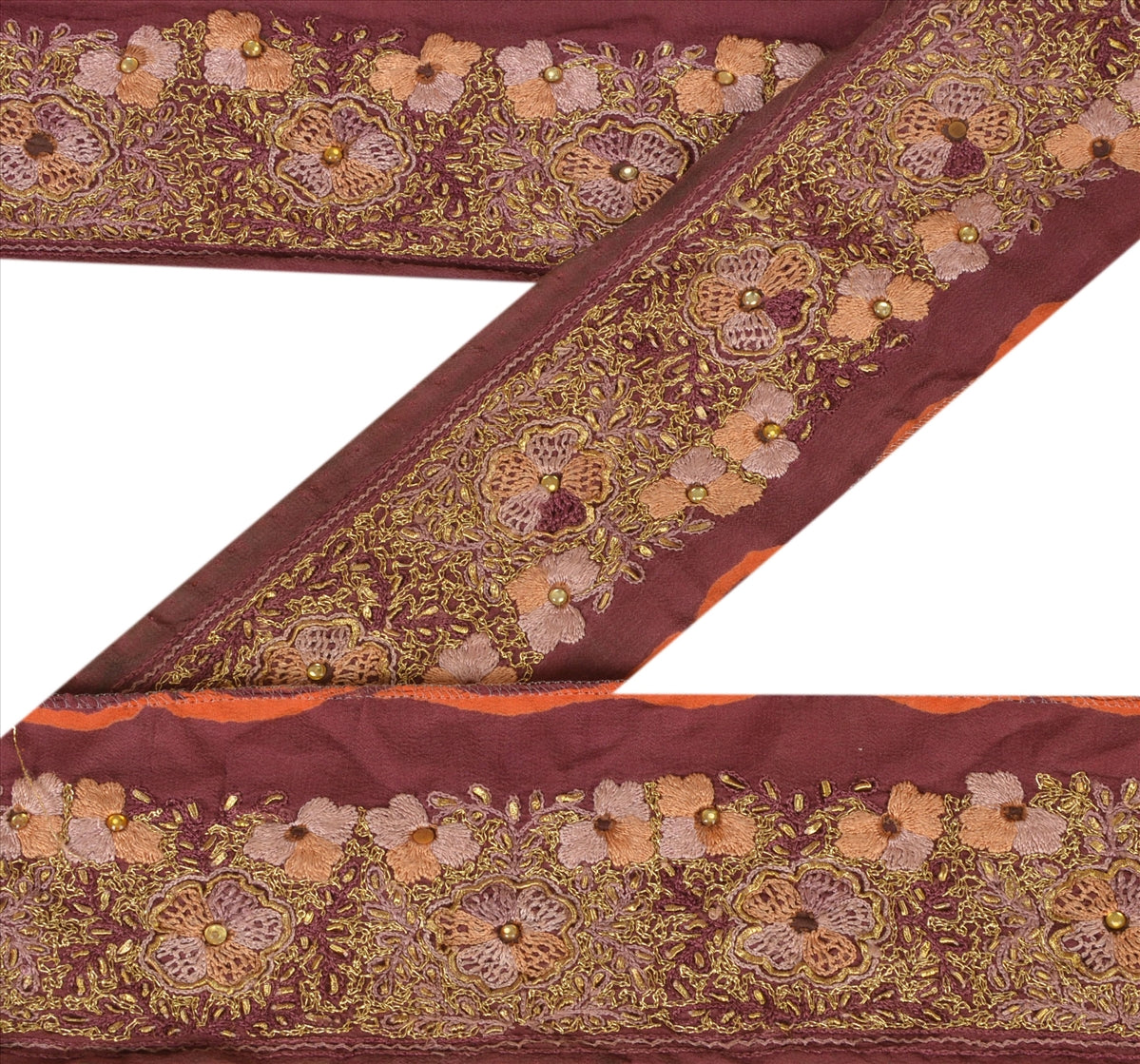 Beautiful pure crepe silk hand embroidered sari border. Further embellished by pink, peach, purple thread work, gold zari/dabka work . Also you can see yellow kundan stone work along with floral design on purple base Sustainable Fabric.