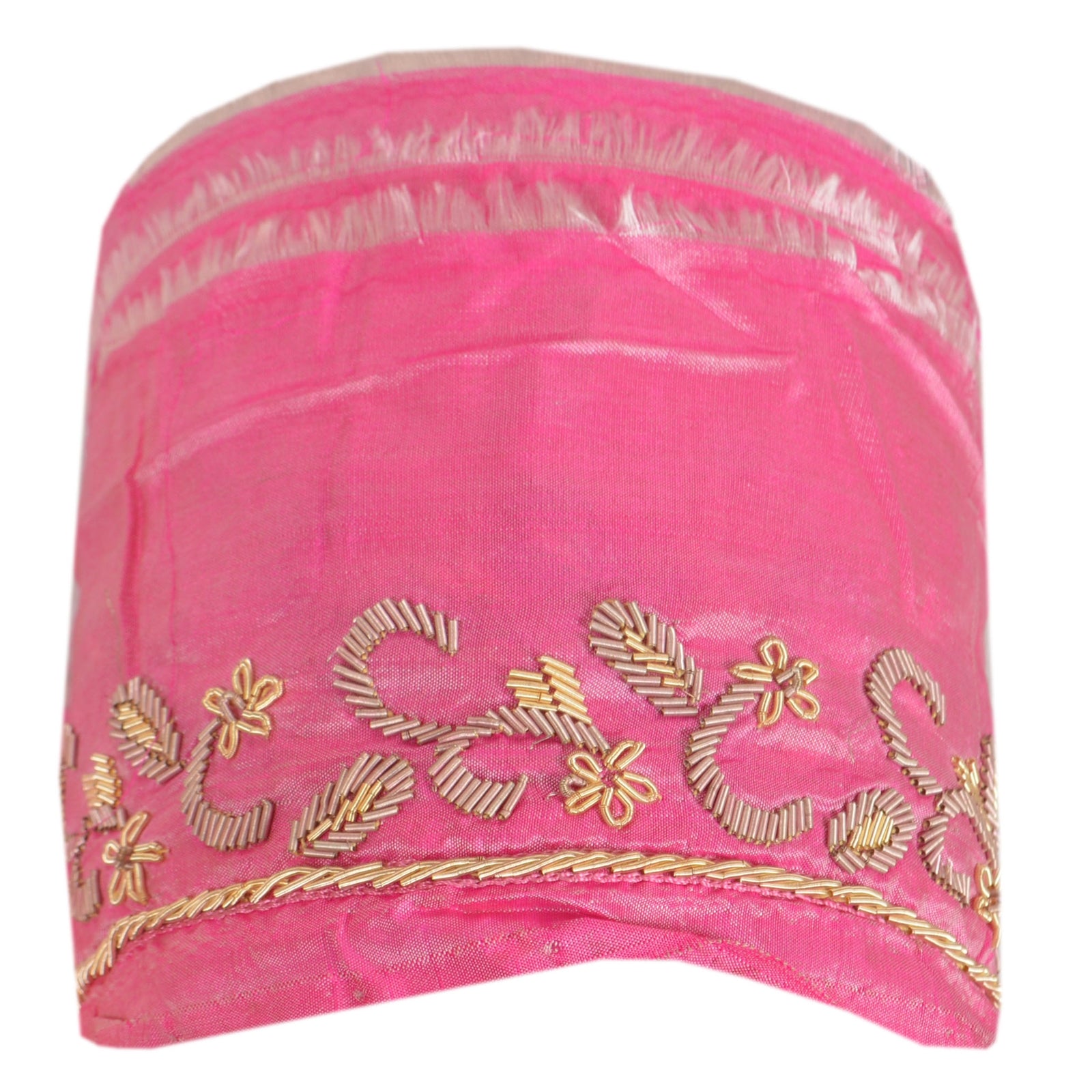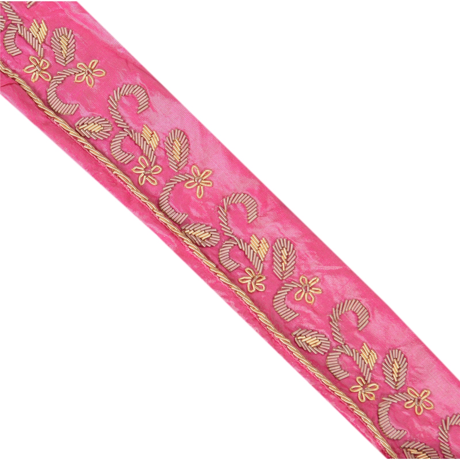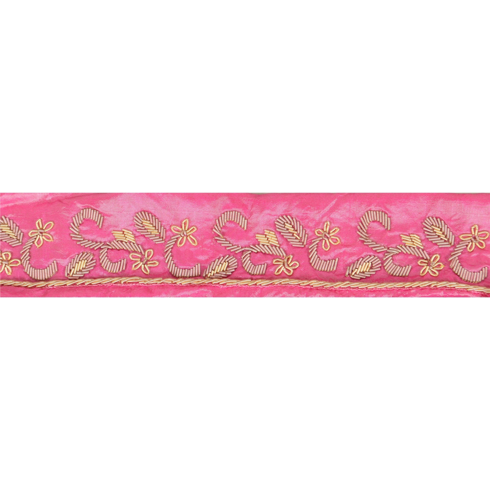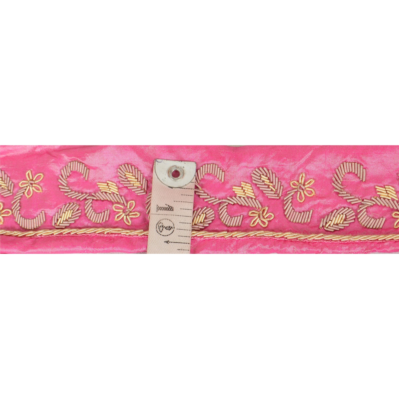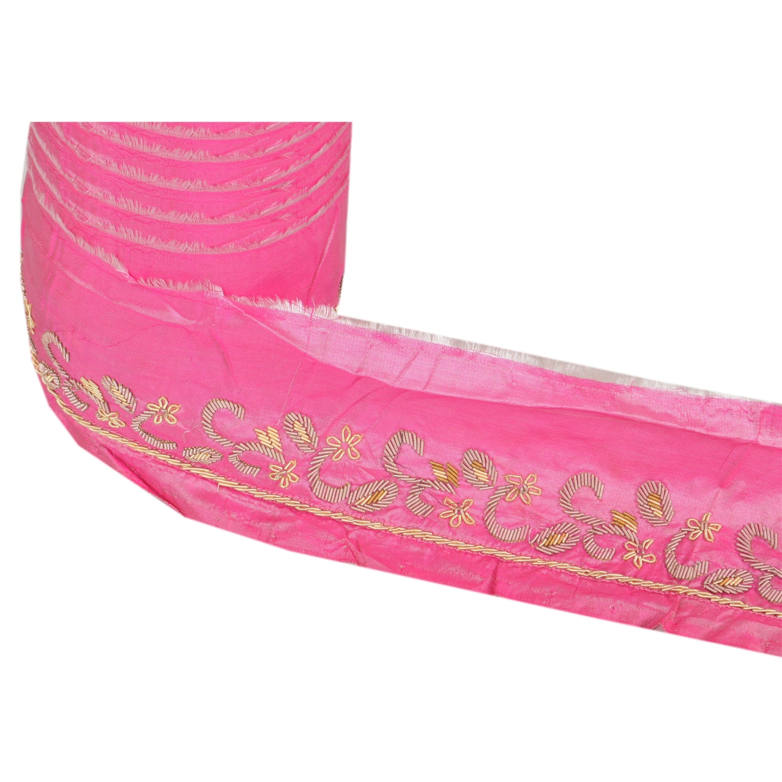 Fabulous pure silk hand embroidered sari border in pink color highlighting zardozi work . Border has beautiful floral & paisley patterns painstakingly hand embroidered with gold zardozi work. WOW!! an awesome one of a kind versatile border. 1 Quantity = 1 Yard