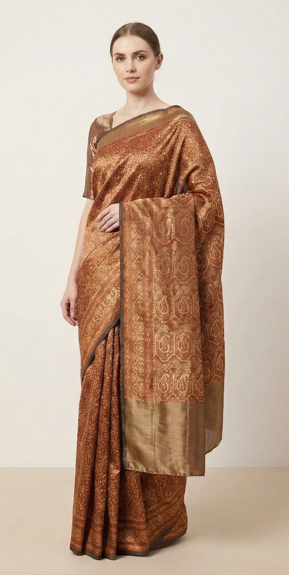 • Удивительные оттенки зеленого цвета, сотканные из искусственного шелка. • Pallu & border имеет цветочный узор, украшенный тканым узором оранжевого/кремового цвета. • Похожая работа в центральной части сари. Блузка с похожей отделкой идет в комплекте с этим сари бесплатно, и мы не взимаем с вас за нее никакой дополнительной платы. Что особенного в этом сари? Привлекающая внимание тканая работа с цветочным узором на основе из экологически чистой ткани в оттенках зеленого цвета действительно подчеркивает красоту сари. Это уникальное винтажное сари можно использовать для различных идей по рукоделию, даже если вы не хотите использовать его как сари. Спроектируйте платье, используйте его как плед, как украшение для окон, обивку, саронги, столовое белье и многое другое. Дайте волю своим творческим способностям и используйте эту декорированную устойчивую ткань в различных вариантах. Примечание: это сари не из чистого шелка, а из искусственного шелка.