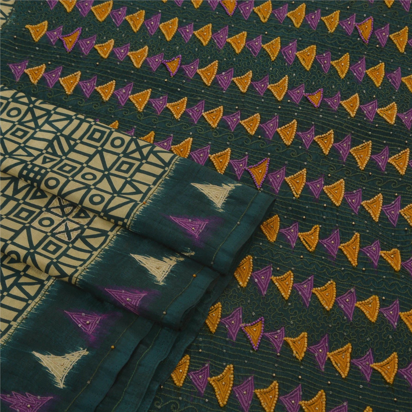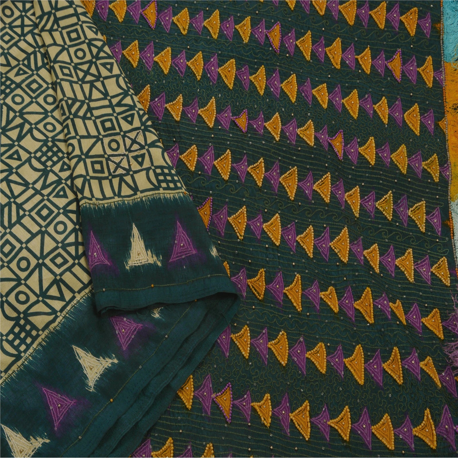 ? Красивое шелковое сари кремового и зеленого цвета с ручной вышивкой и принтом ? Pallu & Border отличается цветочным дизайном, украшенным желтыми/зелеными/фиолетовыми нитями, белыми стеклянными/желтыми, фиолетовыми перламутровыми/золотыми бусинами. ? В центральной части сари присутствуют цветочные мотивы с похожей работой. ? Сари имеет сине-желто-фиолетовую бахрому на паллу. Что особенного в этом сари? Привлекательные желтые и фиолетовые бусины, напоминающие жемчуг, сочетаются с цветочным узором на кремово-зеленой основе. Экологичная ткань действительно подчеркивает красоту сари. Это уникальное винтажное сари можно использовать для различных идей по рукоделию, даже если вы не хотите использовать его как сари. Спроектируйте платье, используйте его как покрывало, как окно Гардероб, обивка, саронги, столовое белье и многое другое. Дайте волю своим творческим способностям и используйте эту декорированную устойчивую ткань в различных вариантах.