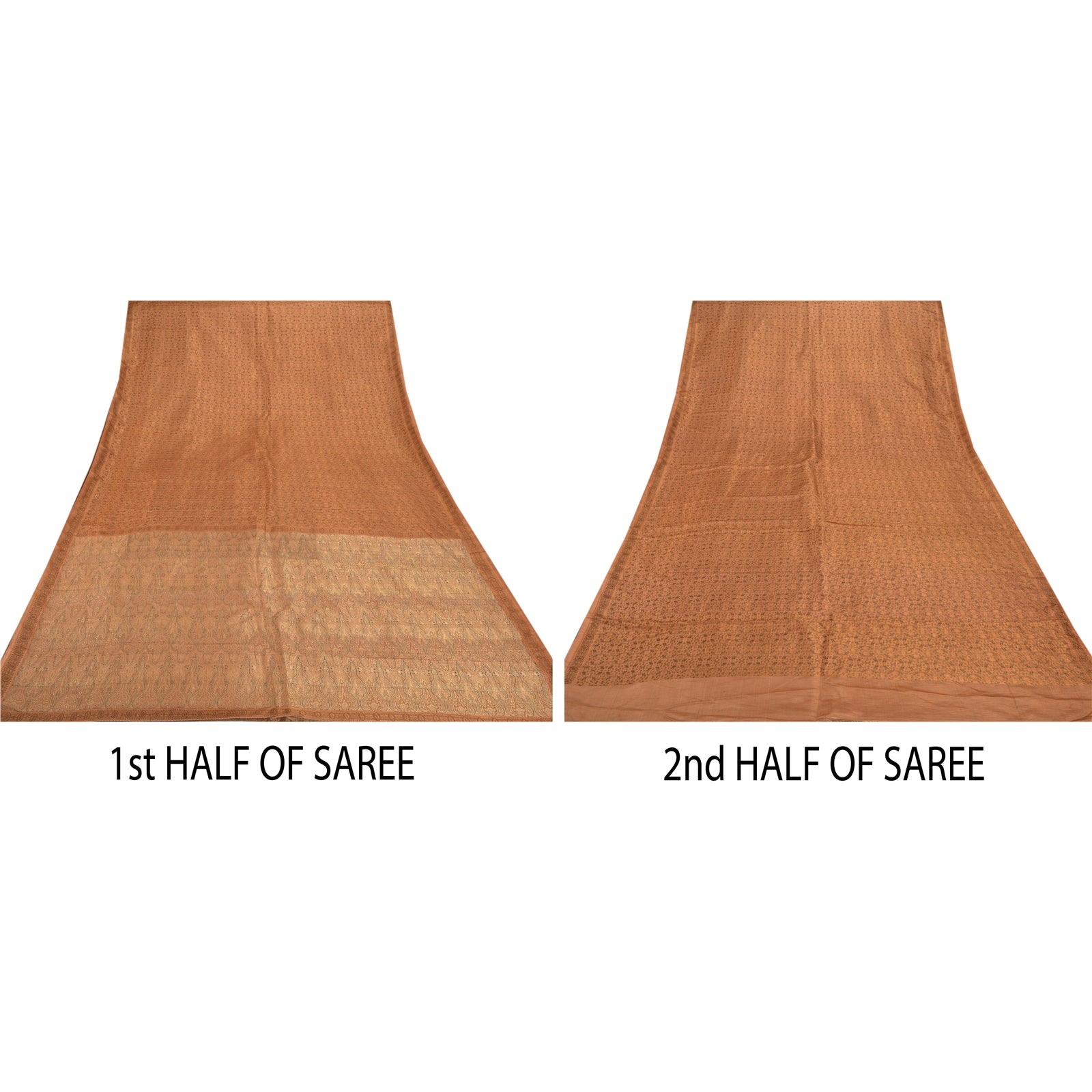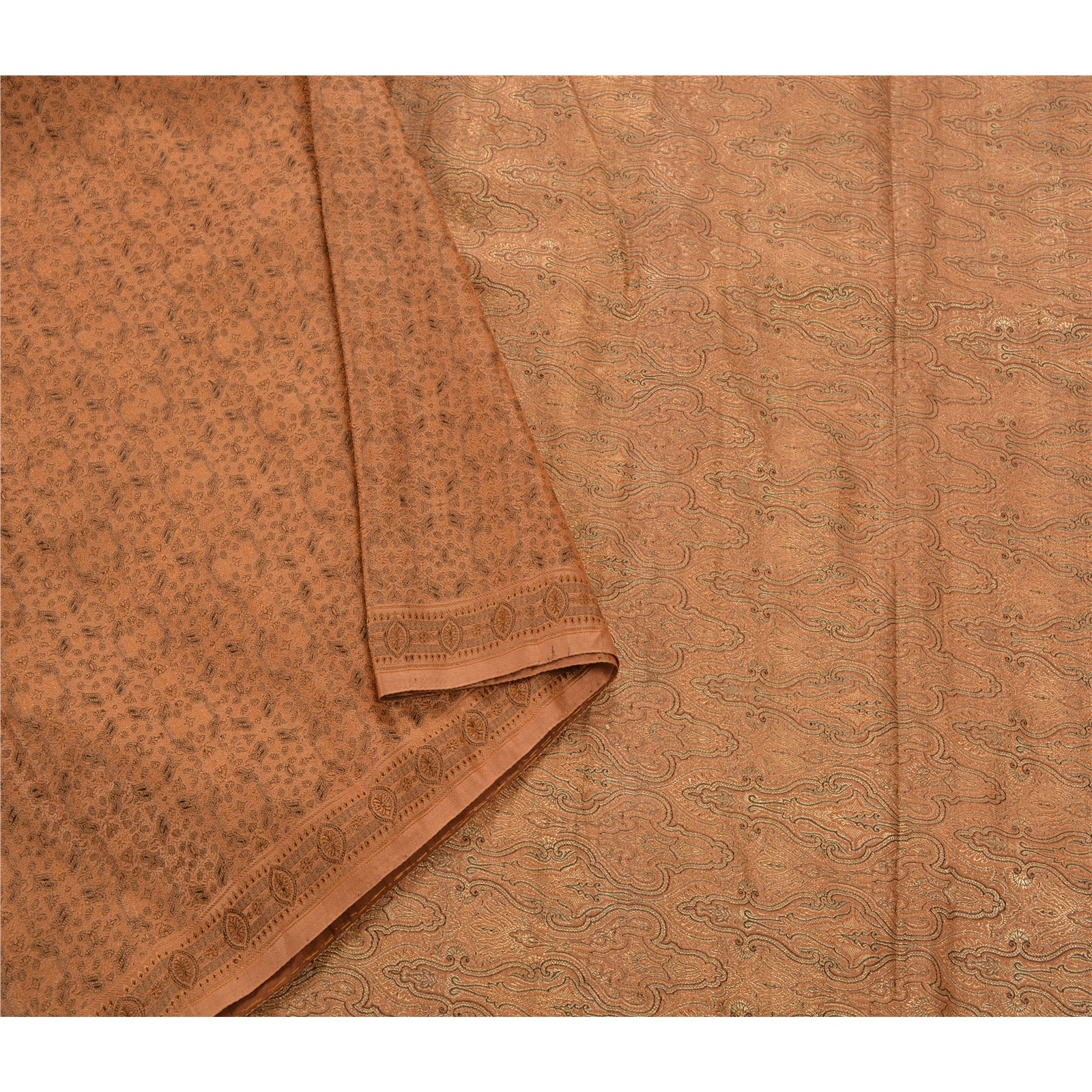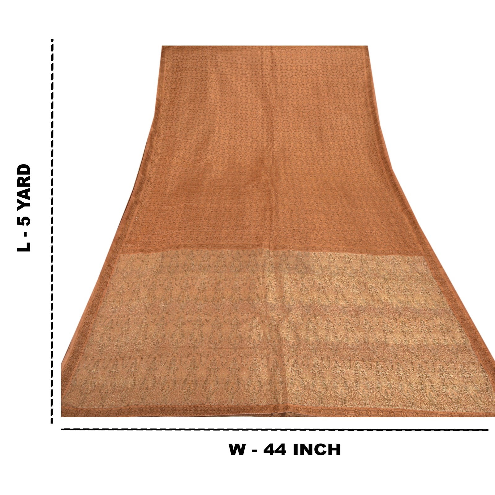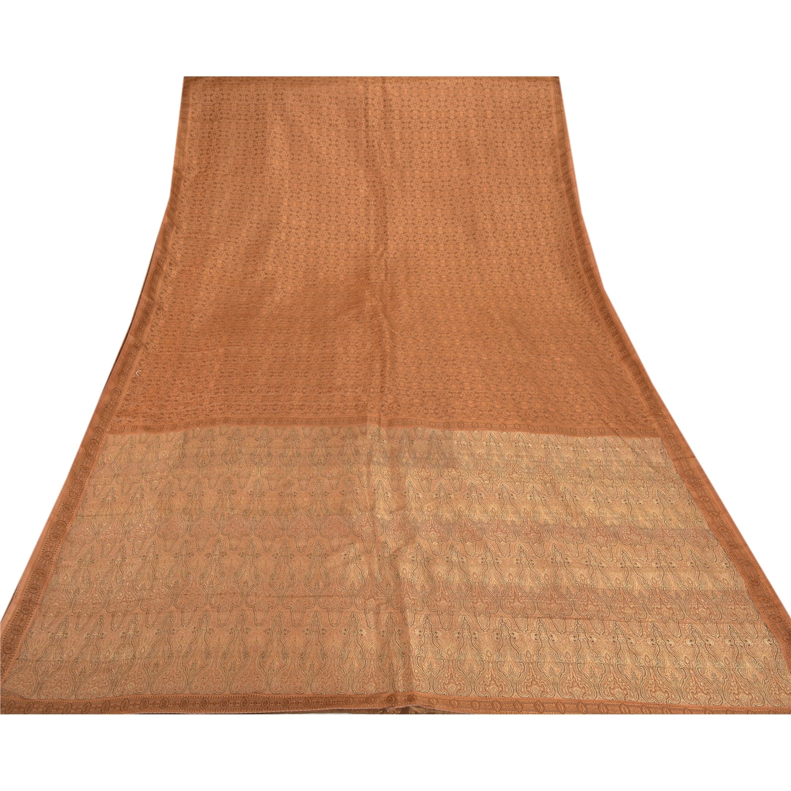 Sanskriti предлагает это винтажное коричневое тканое тяжелое сари, которое изготовлено из 100% чистого атласного шелка, устойчивой ткани. Сари паллу и каймы украшены цветочным и пейсли-дизайном, украшенным золотой работой зари, тканой работой черной нитью. Центральная часть сари может похвастаться аналогичной тканой работой. Это тяжелое сари также можно использовать для различных идей по рукоделию. Используйте его для дизайна платьев, в качестве пледа, для оформления окон, обивки, столового белья и многого другого. Дайте волю своим творческим сокам!