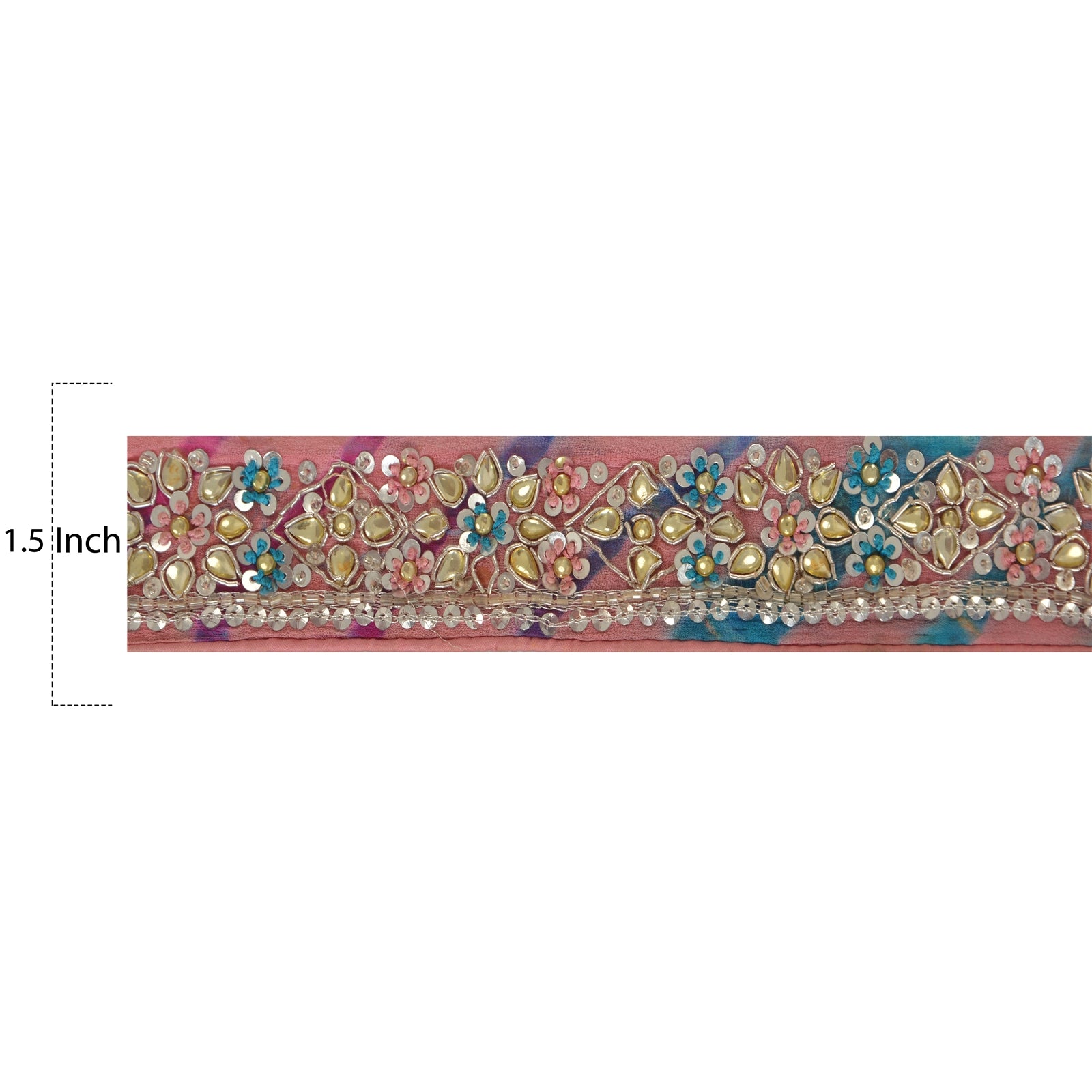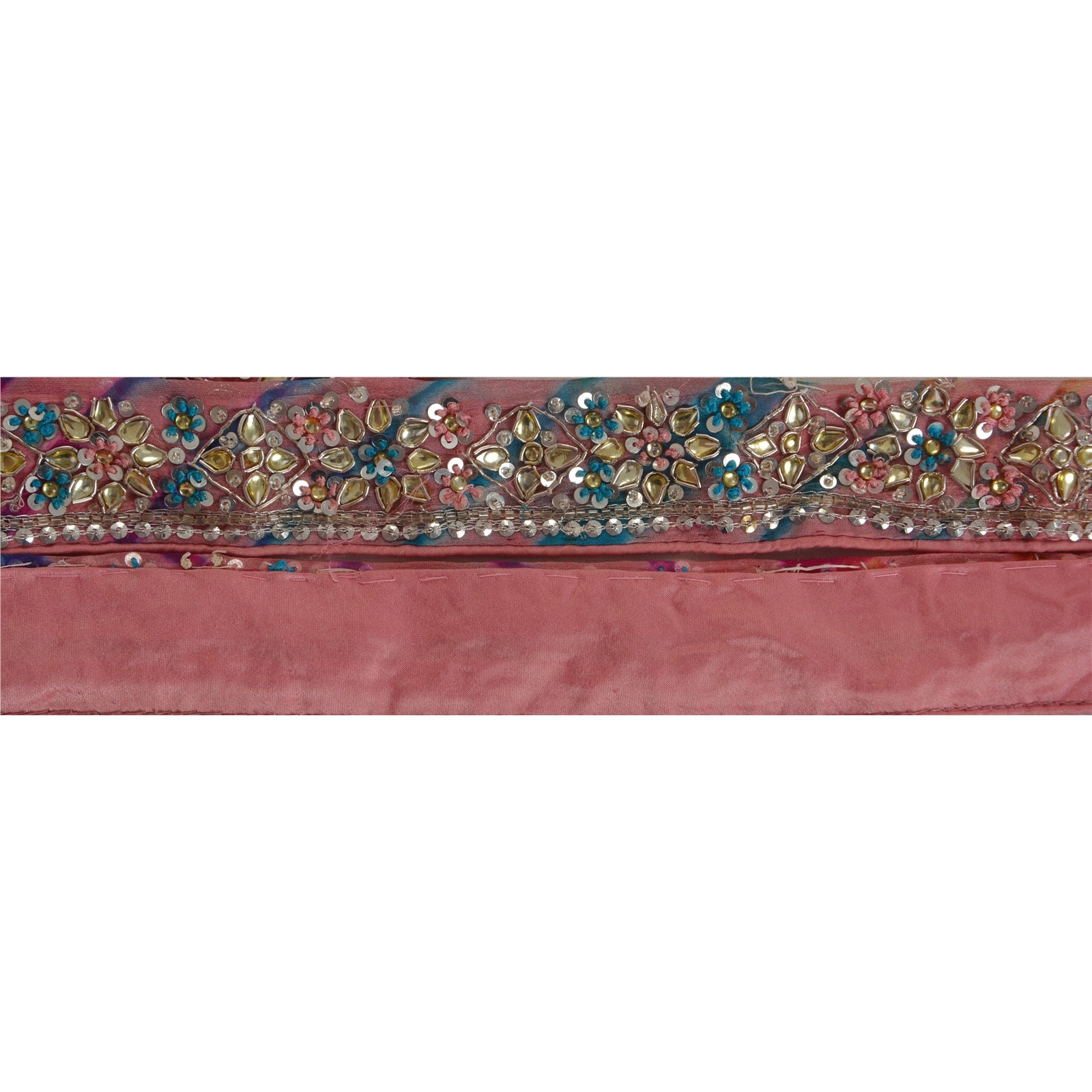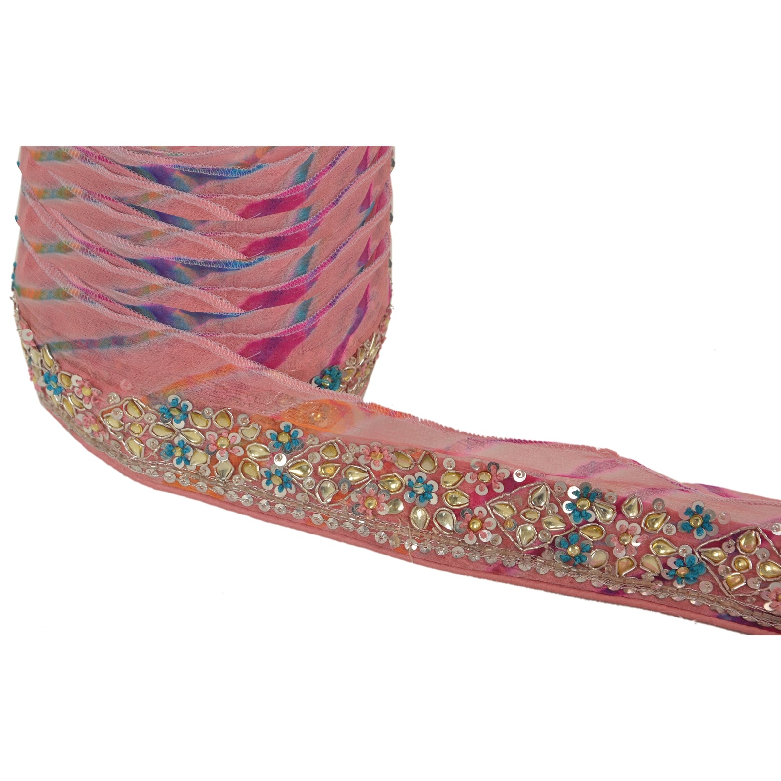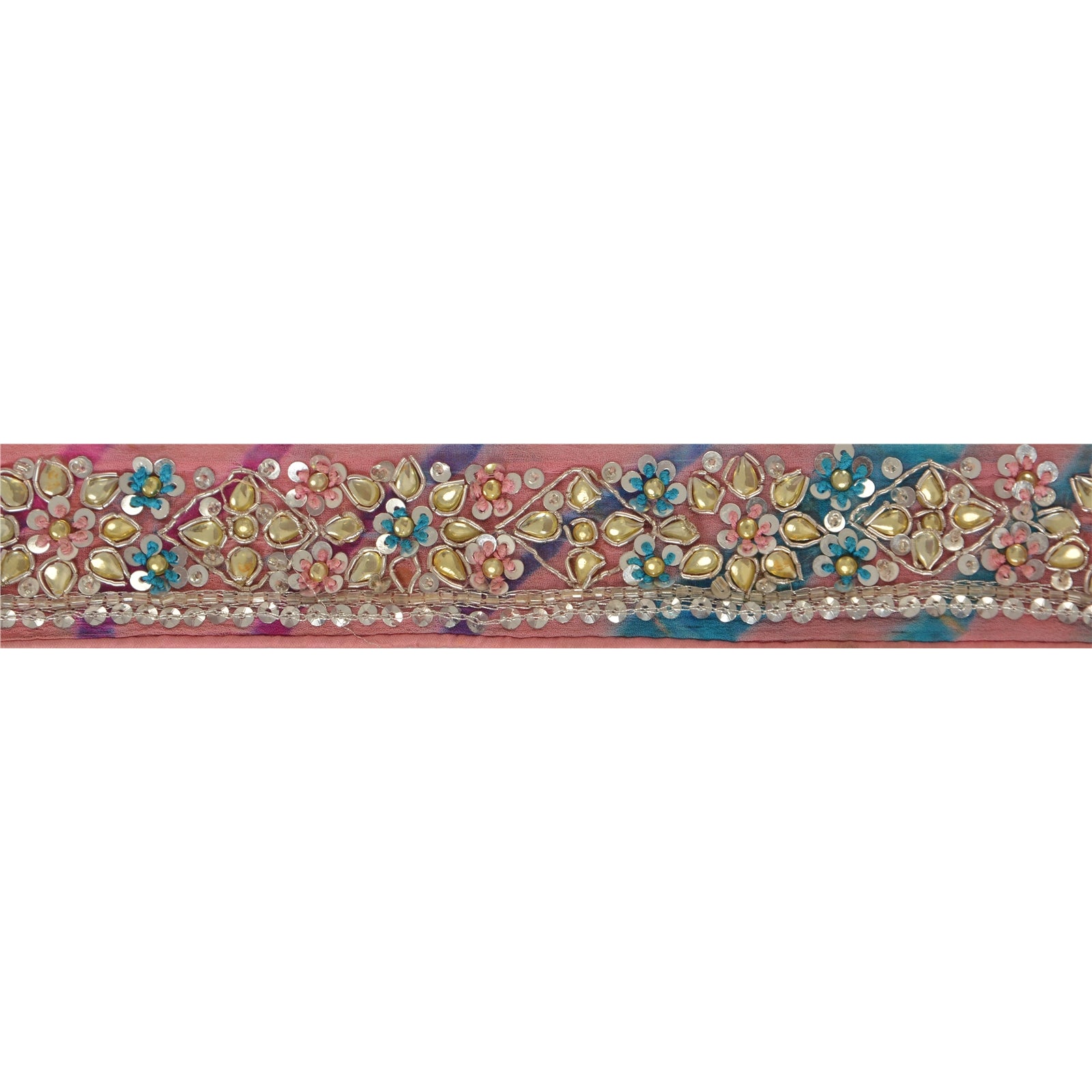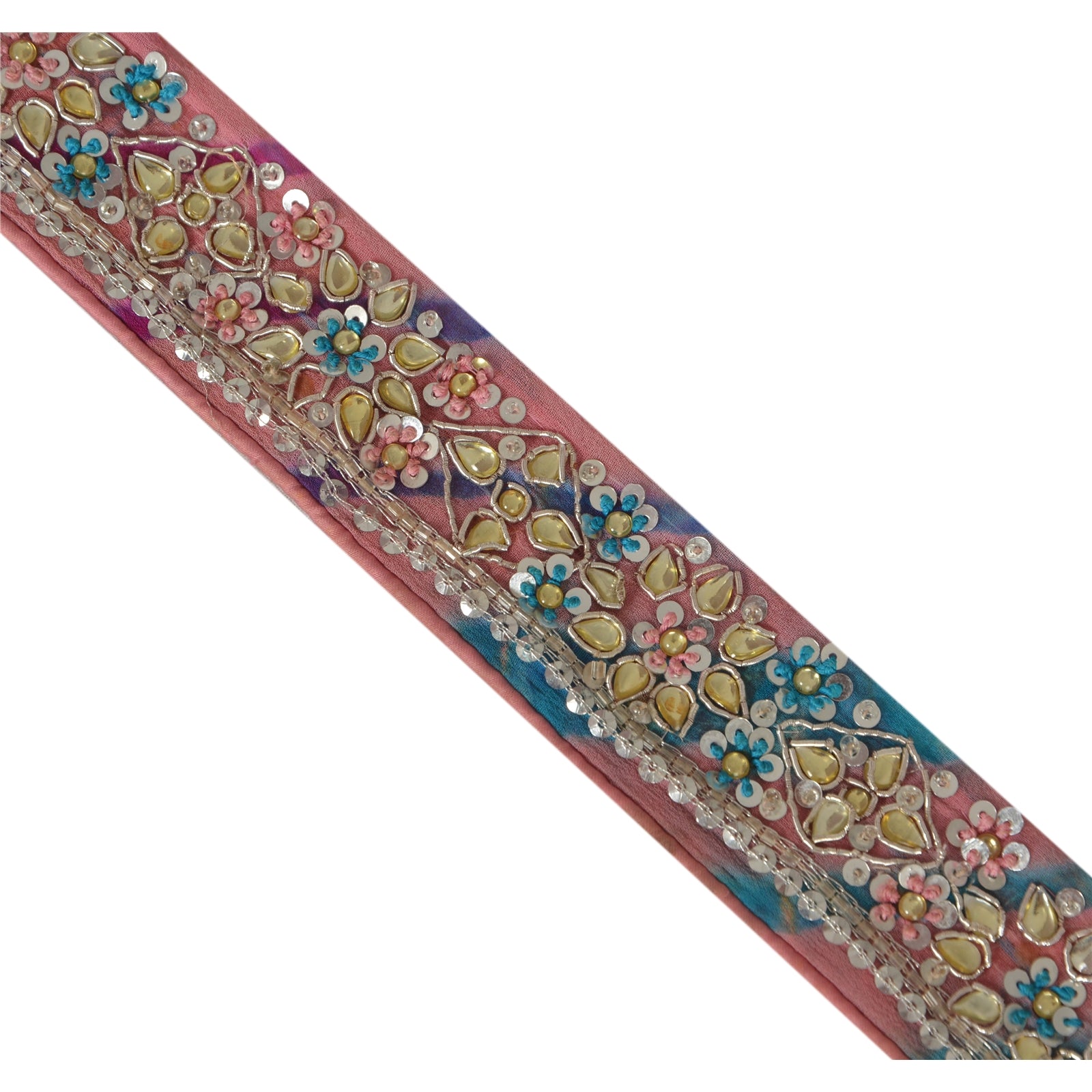 Великолепная кайма сари из жоржета, расшитая вручную бисером, розового цвета, подчеркивающая работу с камнем кундан. Бордюр украшен красивыми цветочными узорами, кропотливо вышитыми вручную бисером, серебряными зардози, желтым камнем кундан и серебряными пайетками. Далее вы можете увидеть тонкую детализацию с использованием белых стеклянных бусин. ВАУ!! потрясающий, уникальный и универсальный бордюр. 1 Количество = 1 Ярд