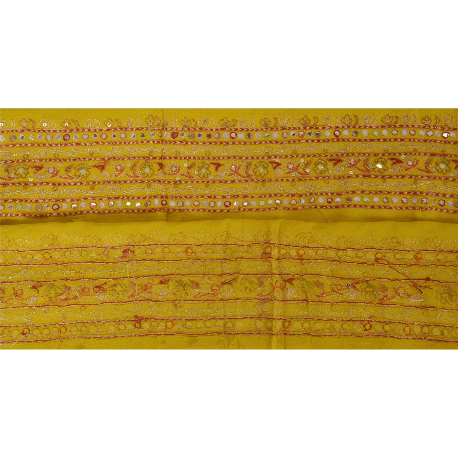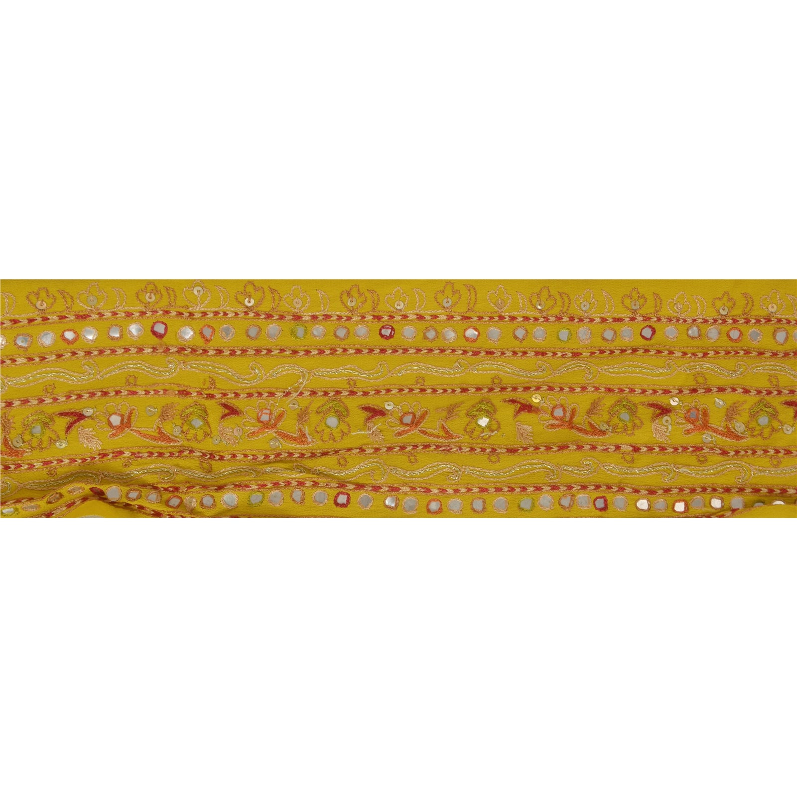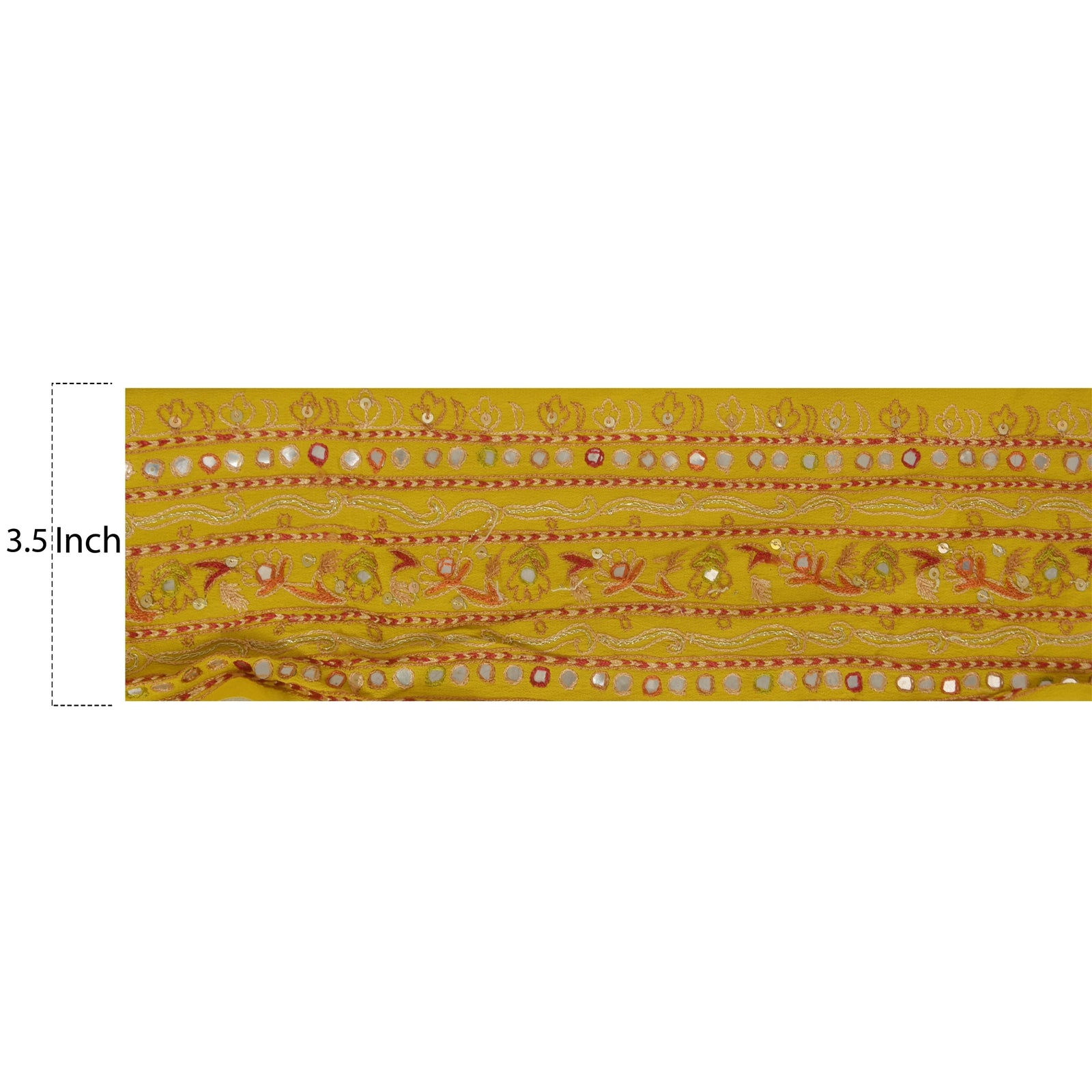 Fabulous pure silk hand beaded sari border in green color highlighting mirror work. Border has beautiful floral patterns painstakingly hand beaded with golden sequins, mirror work . Further you can see fine detailing with multi color thread, golden zari work. WOW!! an awesome one of a kind versatile border. 1 Quantity = 1 Yard B-14242