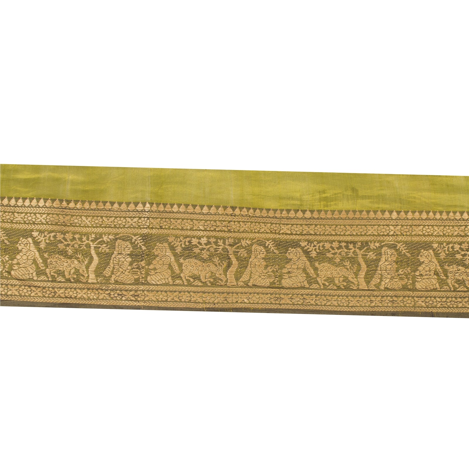 THE ITEM COLOR OR SHADE MAY BE DARKER OR LIGHTER THAN THE PICTURE. Wonderful 100% pure silk woven sari border in green color highlighting traditional Baluchari work from Odisha (Eastern India). Border has beautiful woven pattern in golden color showcasing 2 Indian women talking to each other sitting beside a tree. It also shows a motif of a deer eating grass which further add to the beauty of this trim. WOW!! An awesome one of a kind versatile border. 1 Quantity = 1 Yard Shipping Note: 'International buyers please note: Import duties, taxes, and charges are not included in the item price or postage cost. These charges are the buyer's responsibility. Please check with your country's customs office to determine what these additional costs will be prior to bidding or buying. Buyer will pay custom duty/tax. It is calculated and charged differently by every country. As a seller I do not have any control over it. VAT or sales tax is calculated by the platform at the time of checkout. Customs charge is payable at the time of delivery.' B-14002