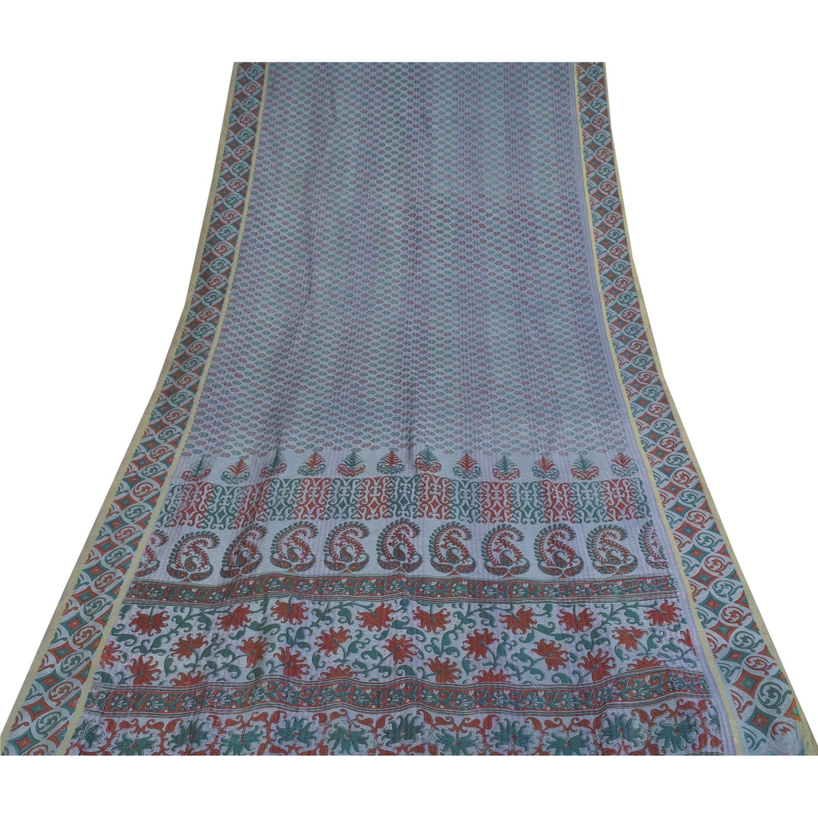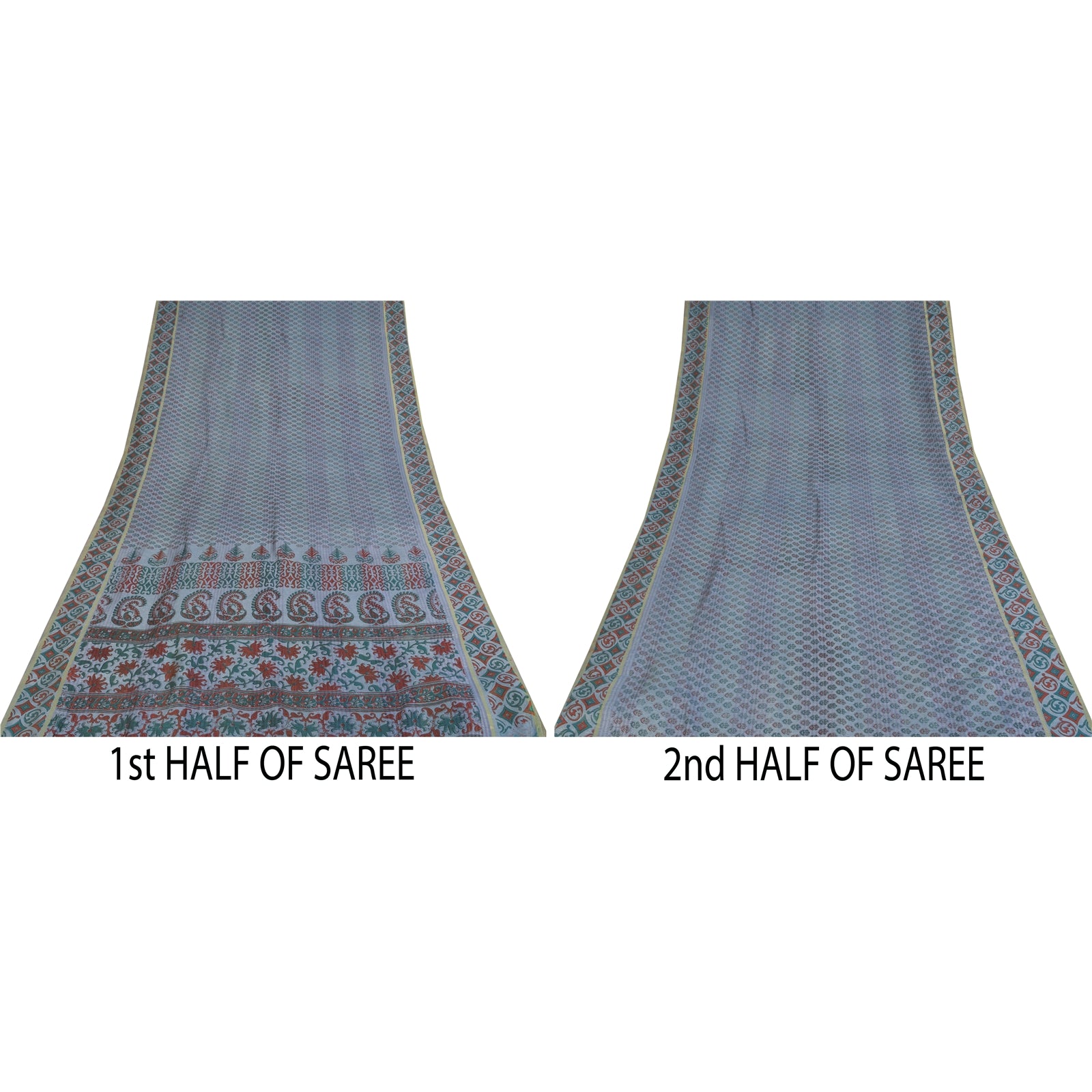 Sanskriti Vintage Art Silk Sarees Grey Painted Indian Sari Craft 5 Yard Fabric