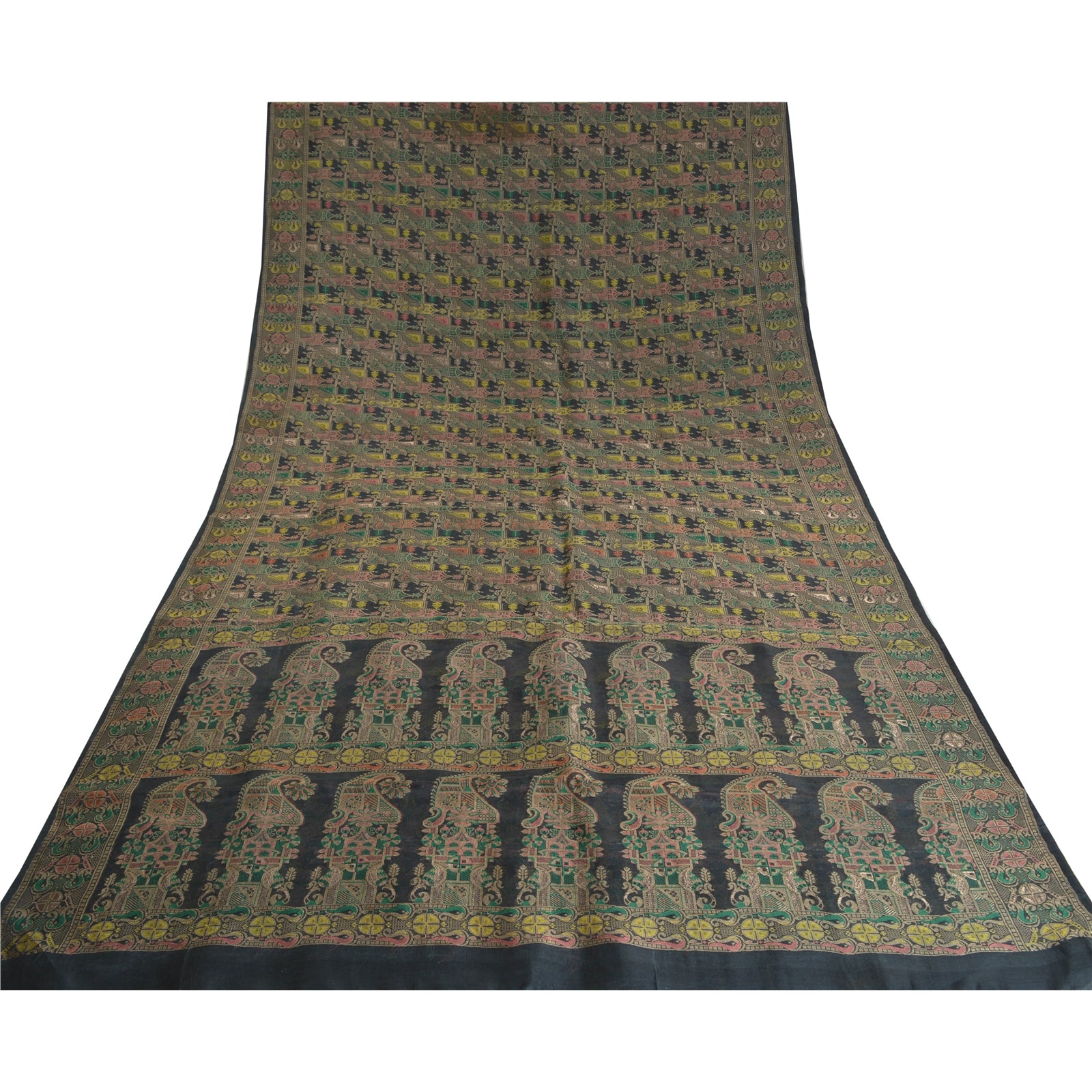 'THE ITEM COLOR OR SHADE MAY BE DARKER OR LIGHTER THAN THE PICTURE.' Sanskriti Offers This Vintage Black Colored Woven Saree Which Is Crafted With 100% Pure Silk Base Fabric. Pallu & Border sari features multi color thread woven work along with floral & paisley design. The center part of sari boasts similar woven work. This saree can be used for various crafting ideas too. Use it for dress designing, as a throw, as window dressing, upholstery, table linen and much more. Let your creative juices flow. 'International buyers please note: Import duties, taxes, and charges are not included in the item price or postage cost. These charges are the buyer's responsibility. Please check with your country's customs office to determine what these additional costs will be prior to bidding or buying. Buyer will pay custom duty/tax. It is calculated and charged differently by every country. As a seller I do not have any control over it. VAT or sales tax is calculated by the platform at the time of checkout. Customs charge is payable at the time of delivery.'