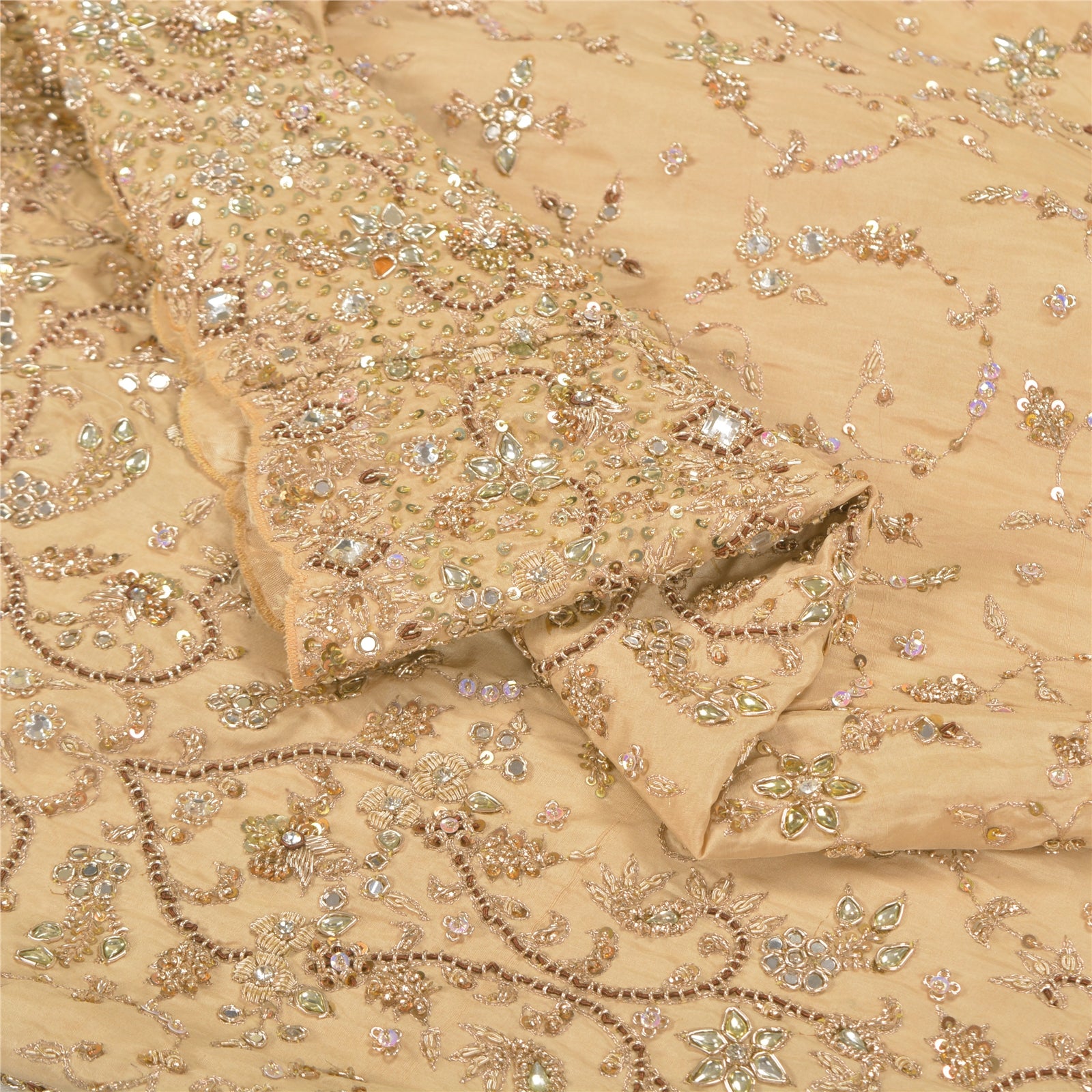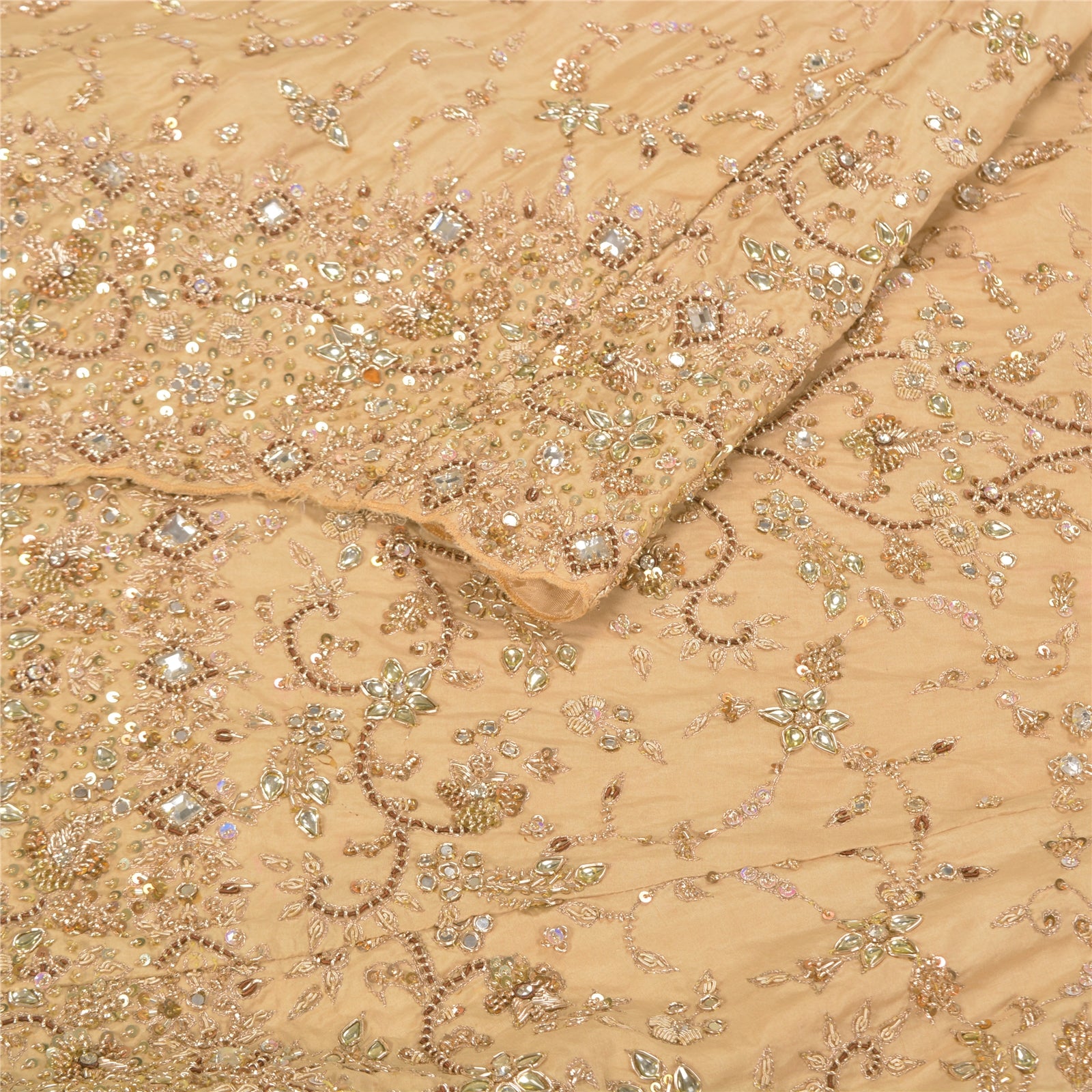 Sanskriti Offers This Vintage Cream Color hand Embroidered Stitched Long Skirt Made With 100% Pure Silk Base Fabric. It is fully covered with kundan stone work. Flare of the skirt has embroidered floral design embellished with pure metallic golden zari/dabka work, golden/red zardozi work, golden sequins, shinning mirror work, white designing rhinestone, white kundan stone & zircon work. You can see similar work on center part of skirt. Flaunt this heavy skirt with ethnic tops, blouses or kurtis at parties, weddings and other occasions. Measurement of the skirt- Length-40 To 57, Width- 34, Flare-75, Hip Size-38 Inches. Adjustable Drawstring Also Available For Your Comfort. Outstanding hand embroidered work skirt with beautiful craftsmanship which I am sure you will truly appreciate.