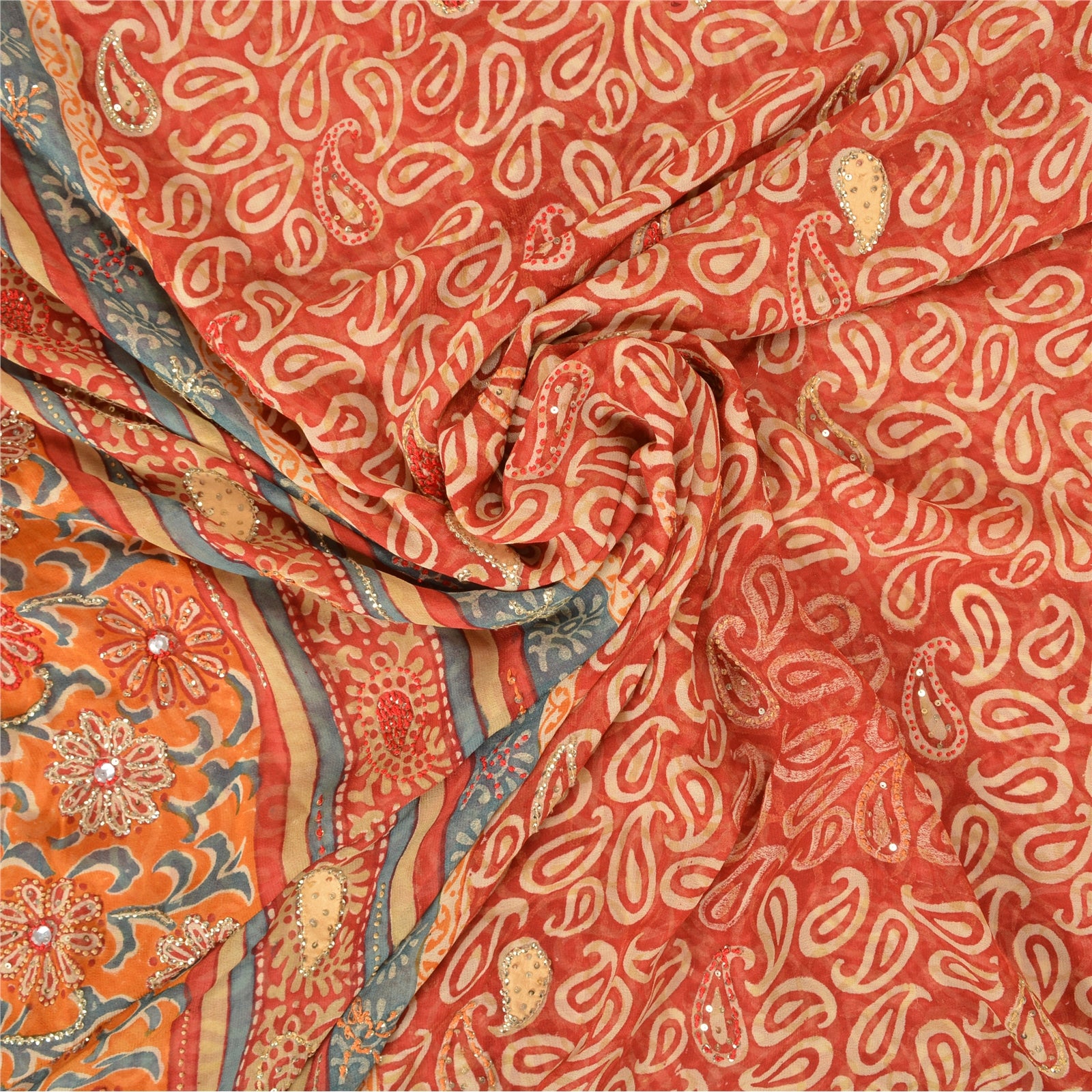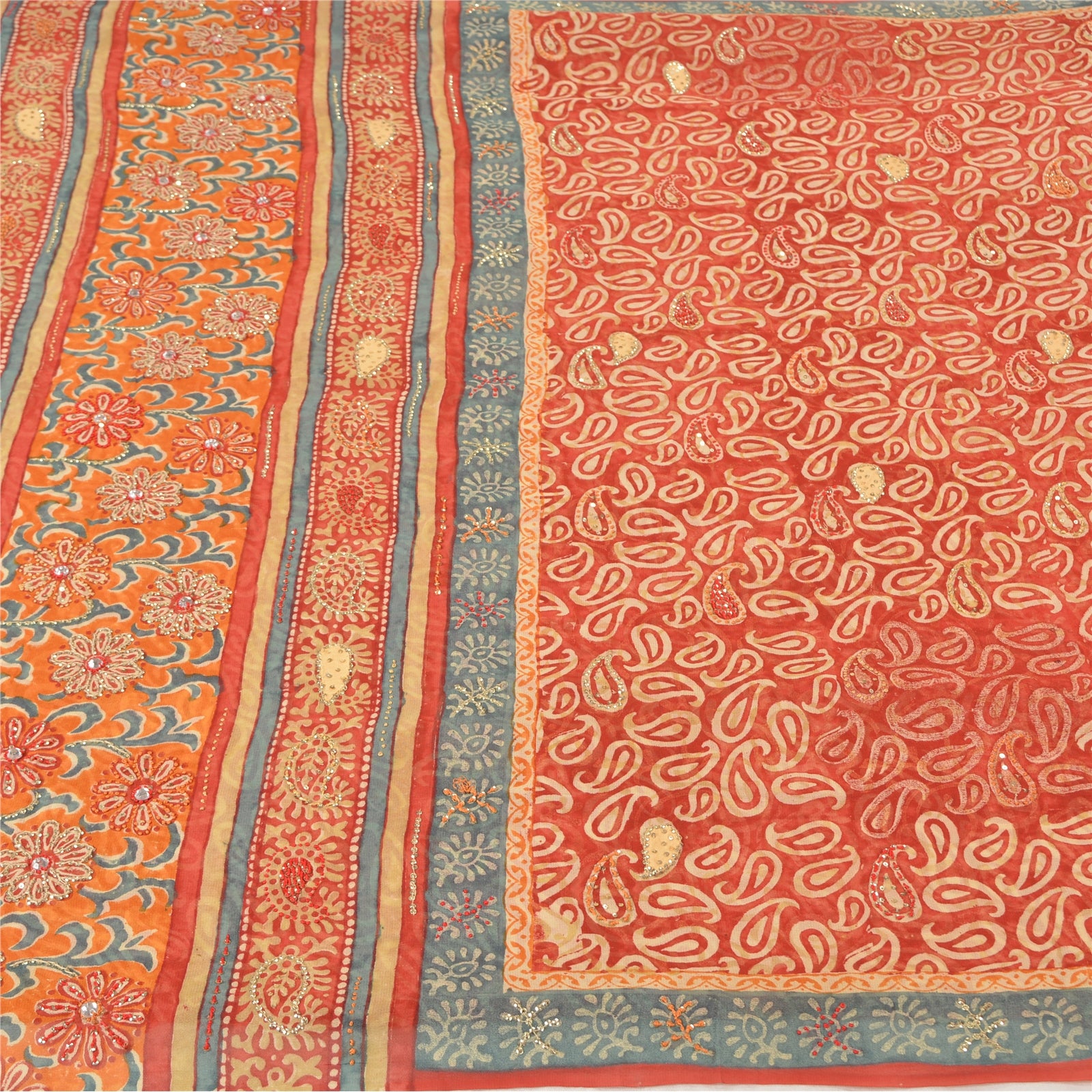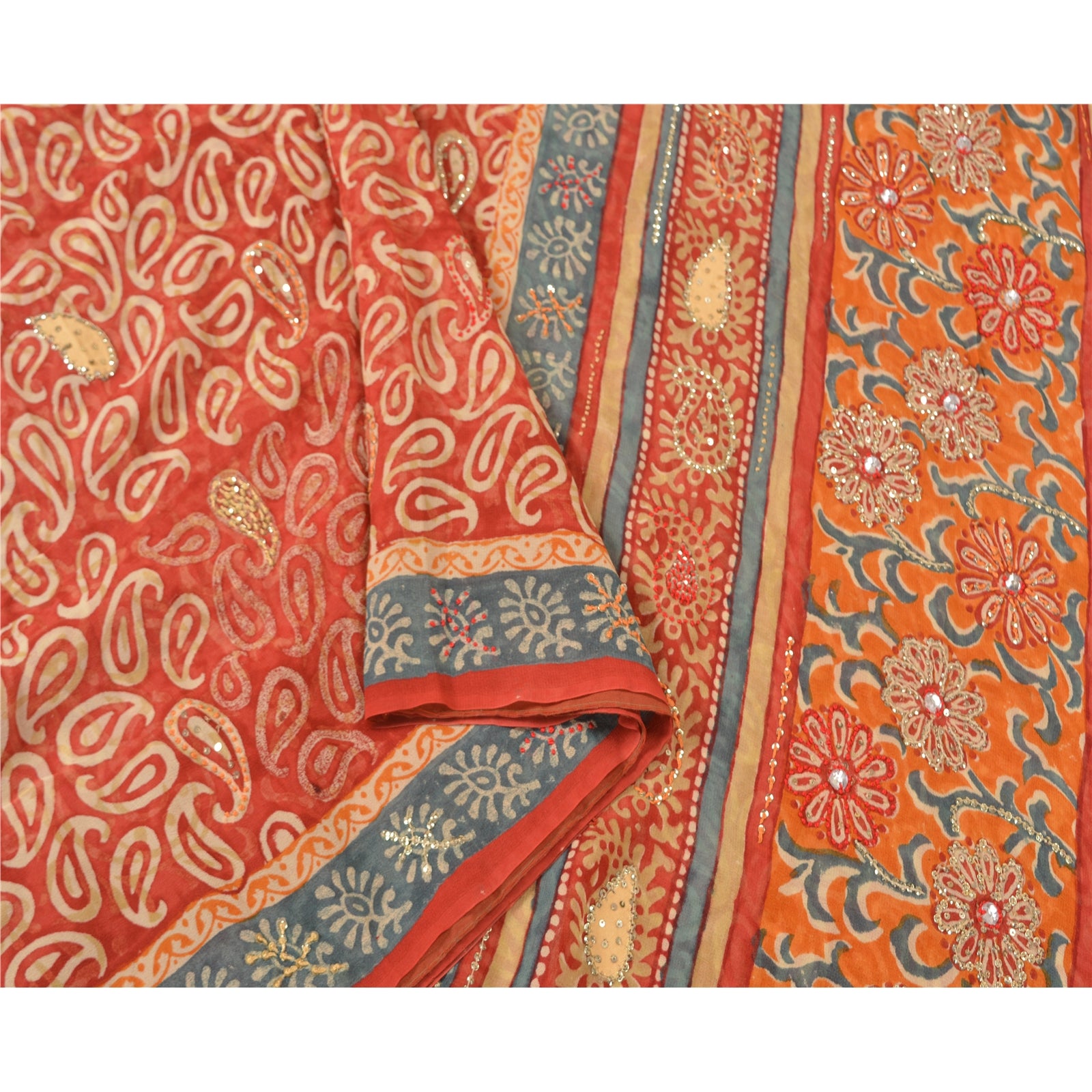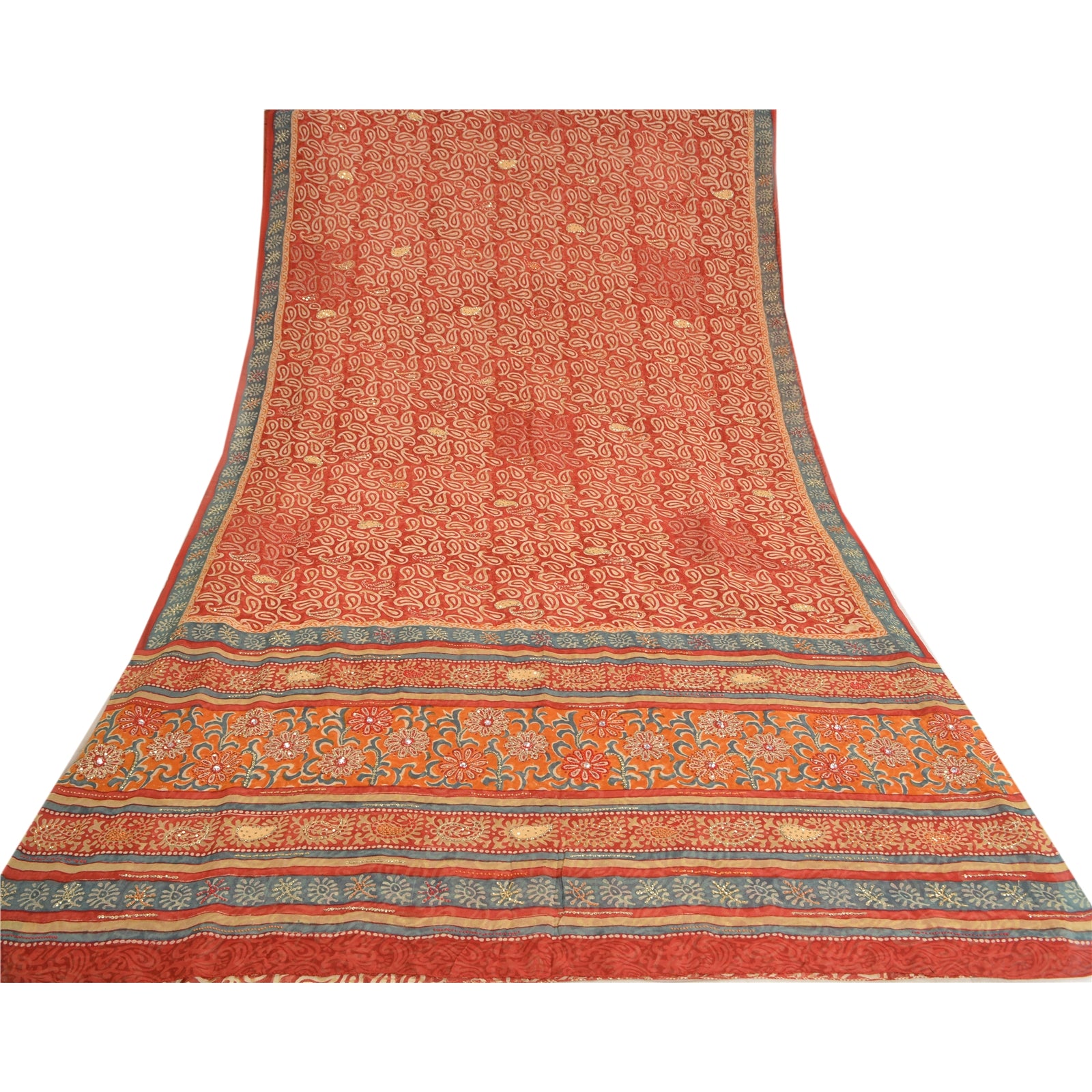 «ЦВЕТ ИЛИ ОТТЕНОК ИЗДЕЛИЯ МОЖЕТ БЫТЬ ТЕМНЕЕ ИЛИ СВЕТЛЕЕ, ЧЕМ НА ИЗОБРАЖЕНИИ». Красивое красное сари из чистого шелка-жоржета с ручной вышивкой. Pallu & border имеет напечатанный узор пейсли и цветочный узор, украшенный золотистыми пайетками и красно-оранжевой нитью. Центр сари украшен цветочным принтом и пайетками. Это сари можно использовать и для различных идей рукоделия. Используйте его для дизайна одежды, в качестве пледа, для оформления окон, обивки, столового белья и многого другого. Дайте волю своим творческим сокам. «Международные покупатели, обратите внимание: Импортные пошлины, налоги и сборы не включены в цену товара или стоимость почтовых расходов. Эти сборы оплачивает покупатель. Пожалуйста, свяжитесь с таможней вашей страны, чтобы определить, какими будут эти дополнительные расходы, до торгов или покупки. Покупатель оплачивает таможенную пошлину/налог. Она рассчитывается и взимается по-разному в каждой стране. Как продавец, я не имею никакого контроля над ней. НДС или налог с продаж рассчитывается платформой во время оформления заказа. Таможенный сбор оплачивается во время доставки.