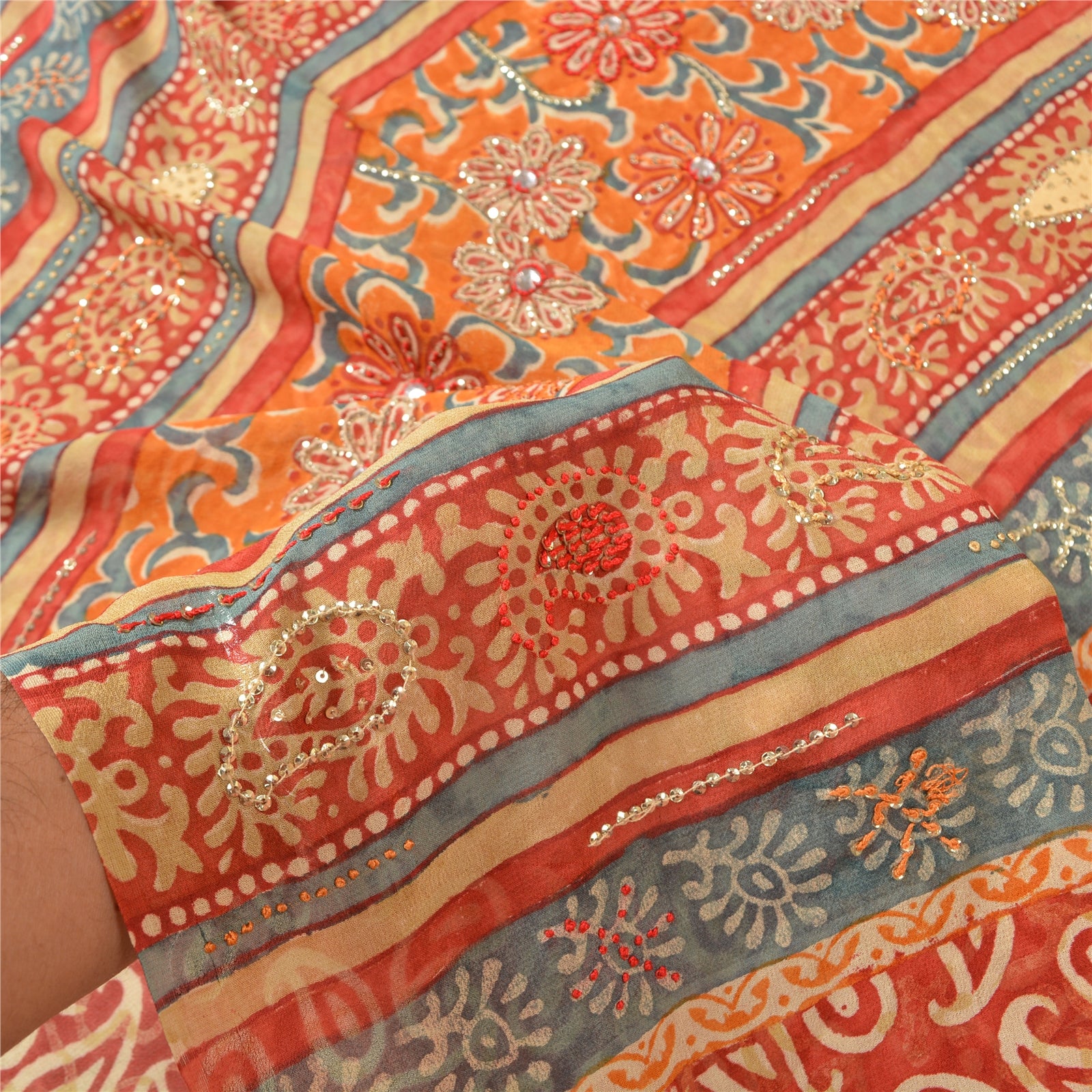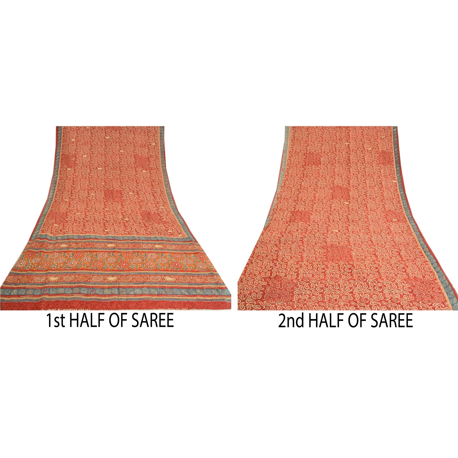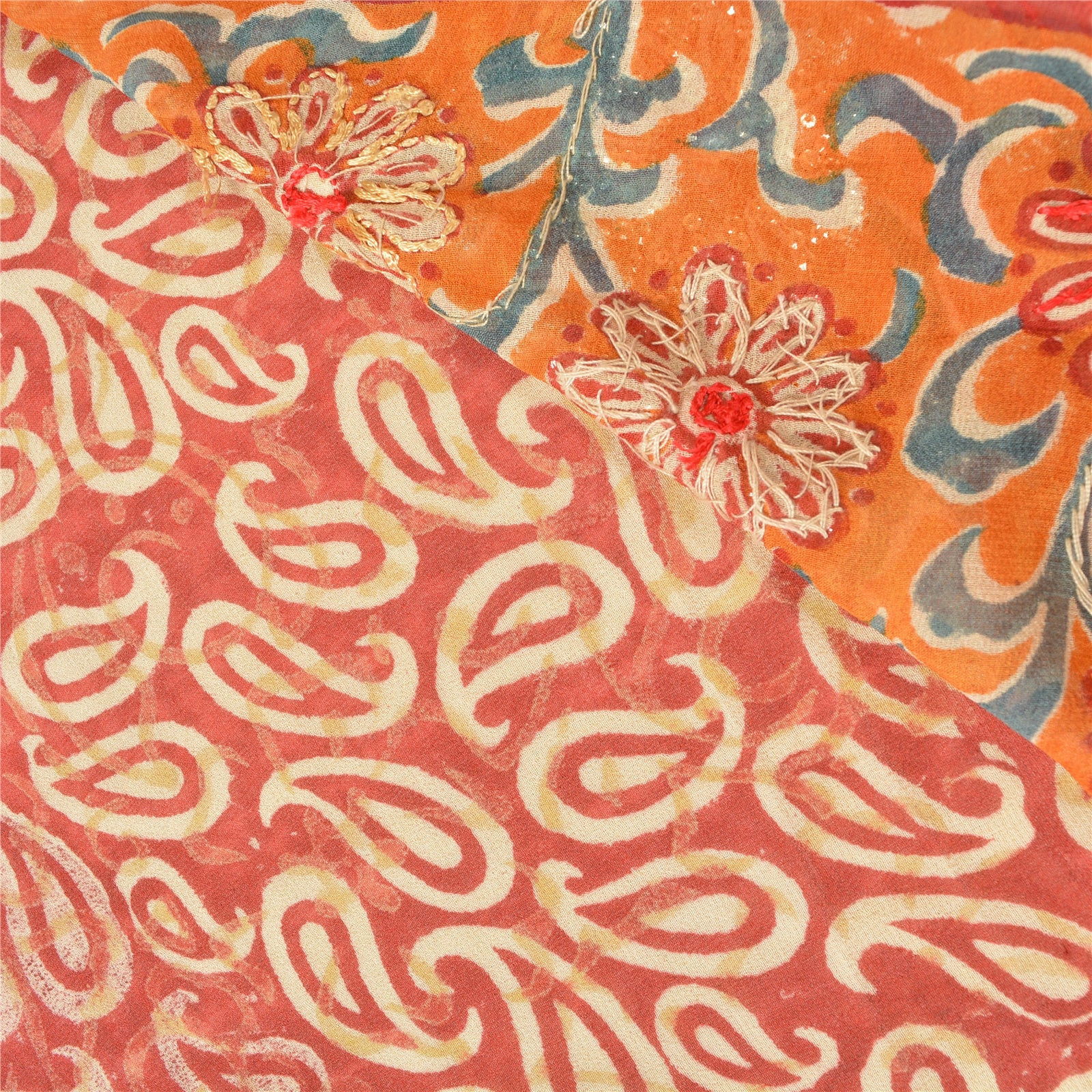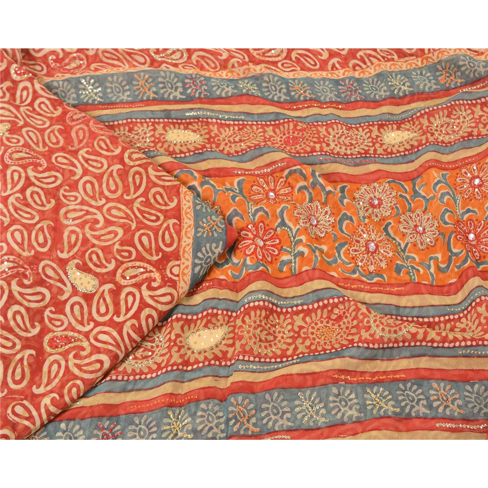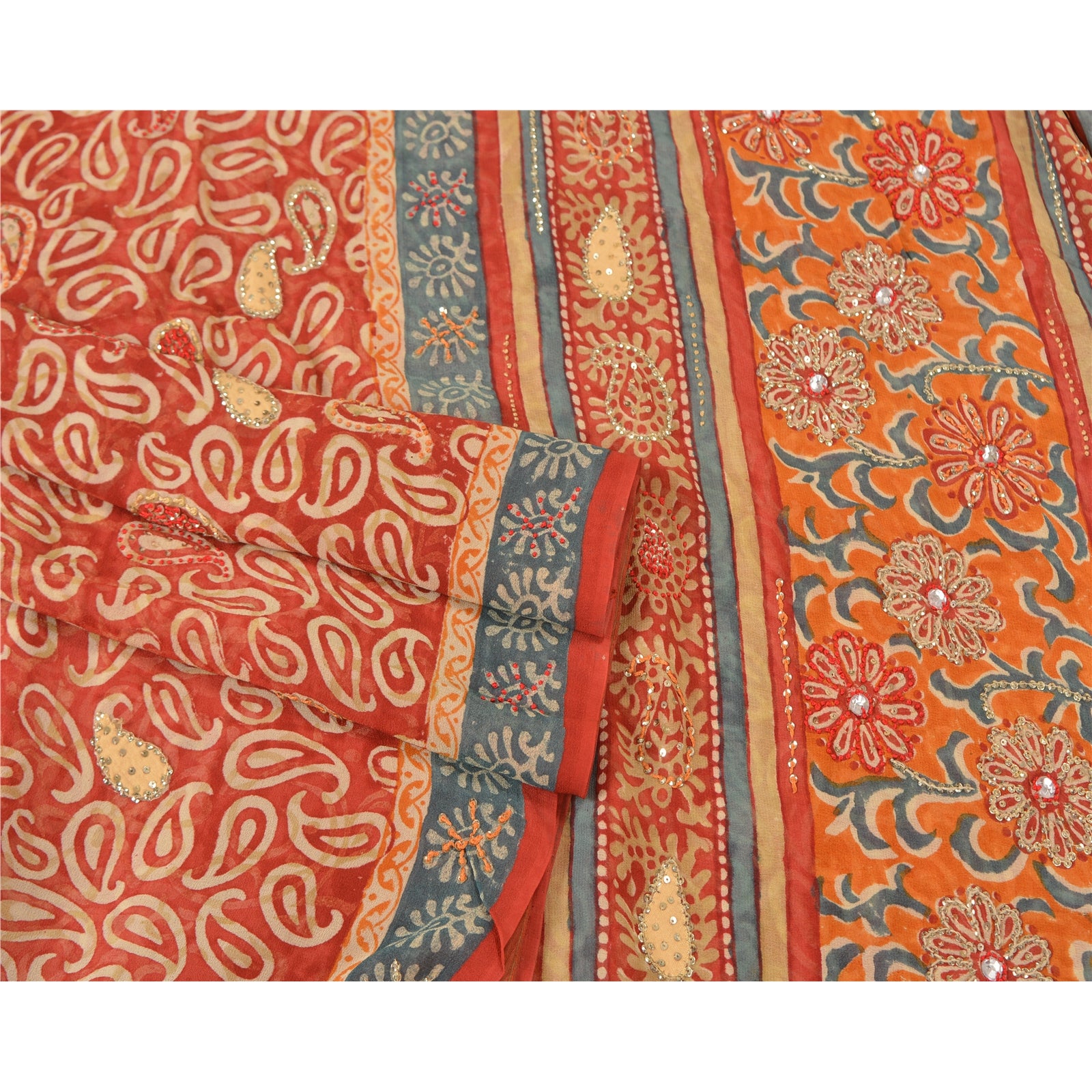 «ЦВЕТ ИЛИ ОТТЕНОК ИЗДЕЛИЯ МОЖЕТ БЫТЬ ТЕМНЕЕ ИЛИ СВЕТЛЕЕ, ЧЕМ НА ИЗОБРАЖЕНИИ». Красивое красное сари из чистого шелка-жоржета с ручной вышивкой. Pallu & border имеет напечатанный узор пейсли и цветочный узор, украшенный золотистыми пайетками и красно-оранжевой нитью. Центр сари украшен цветочным принтом и пайетками. Это сари можно использовать и для различных идей рукоделия. Используйте его для дизайна одежды, в качестве пледа, для оформления окон, обивки, столового белья и многого другого. Дайте волю своим творческим сокам. «Международные покупатели, обратите внимание: Импортные пошлины, налоги и сборы не включены в цену товара или стоимость почтовых расходов. Эти сборы оплачивает покупатель. Пожалуйста, свяжитесь с таможней вашей страны, чтобы определить, какими будут эти дополнительные расходы, до торгов или покупки. Покупатель оплачивает таможенную пошлину/налог. Она рассчитывается и взимается по-разному в каждой стране. Как продавец, я не имею никакого контроля над ней. НДС или налог с продаж рассчитывается платформой во время оформления заказа. Таможенный сбор оплачивается во время доставки.
