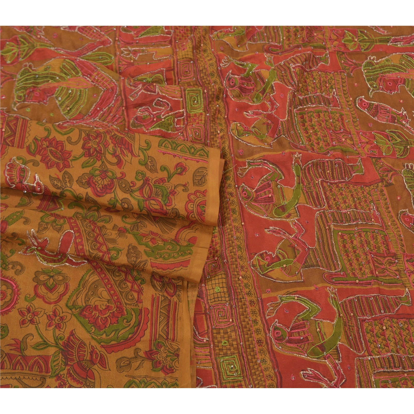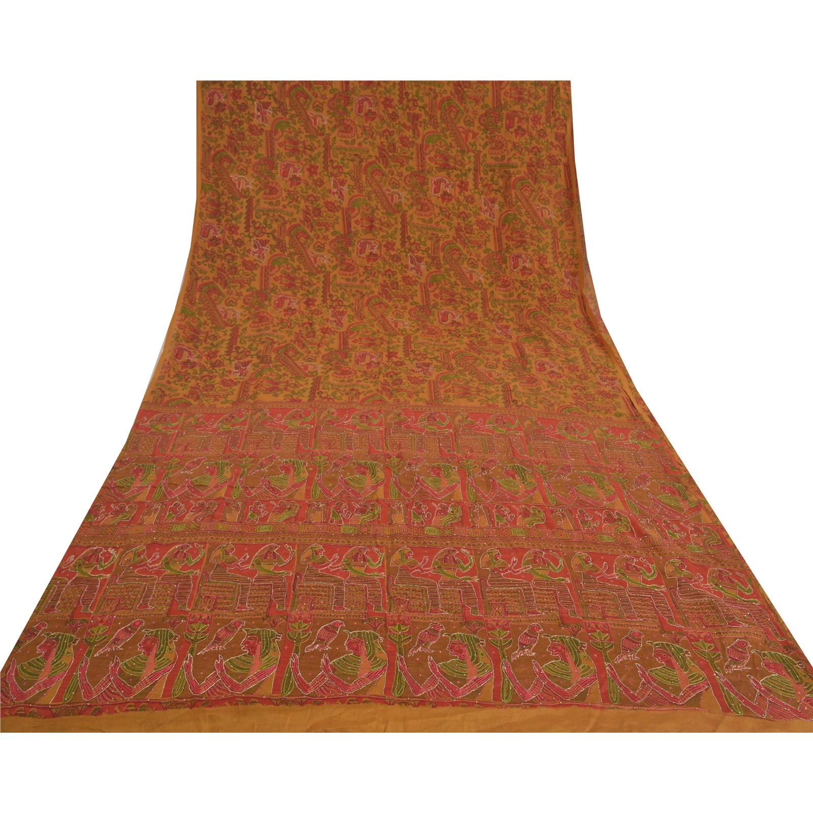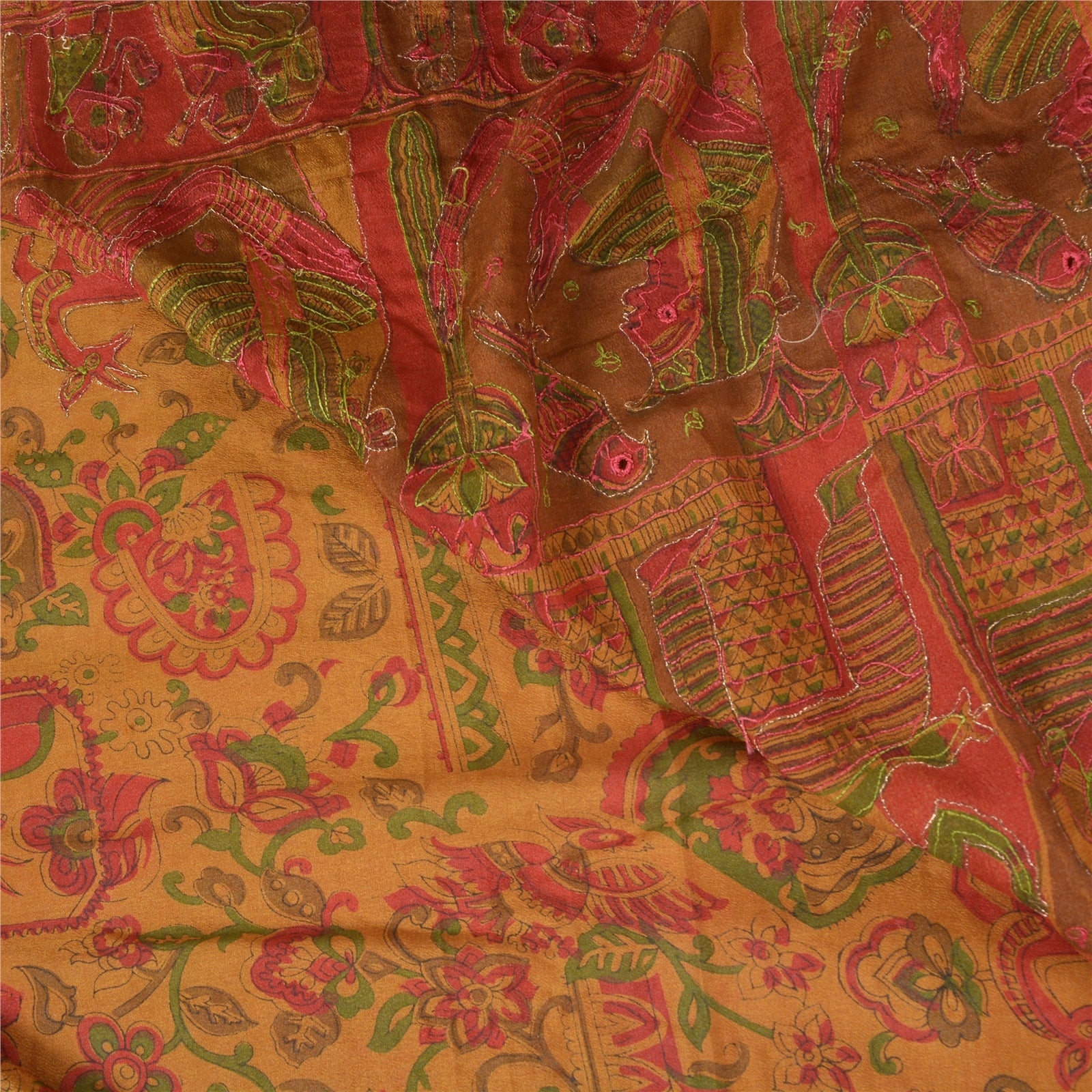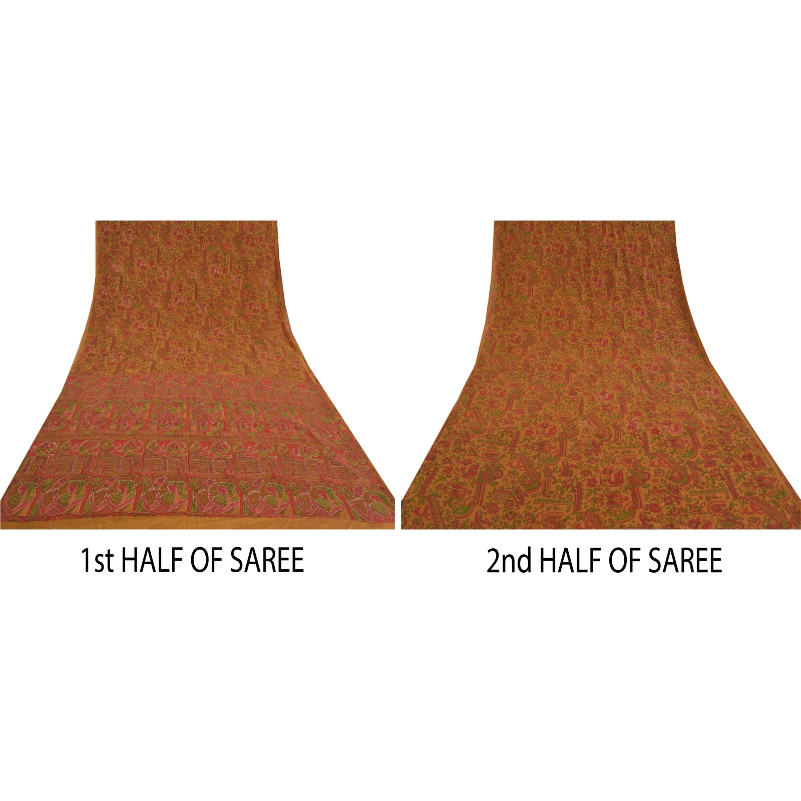 Красивое коричневое сари из 100% чистого шелка с ручной вышивкой. Pallu & border украшен цветочным и египетским узором с изображением людей, украшенным золотым плетением «зари», белыми стеклянными бусинами, коричневыми деревянными бусинами и нитями. В центре сари имеется аналогичный принт с цветочным и животным узором и узором «зари». Это сари можно использовать и для различных идей рукоделия. Используйте его для дизайна одежды, в качестве пледа, для оформления окон, обивки, столового белья и многого другого. Дайте волю своим творческим сокам.