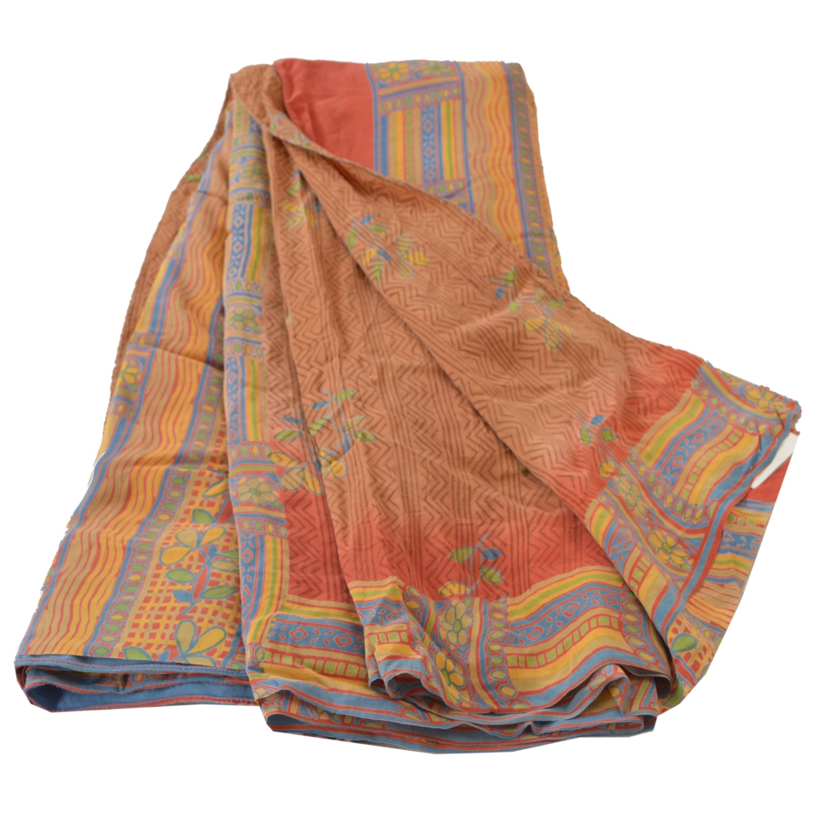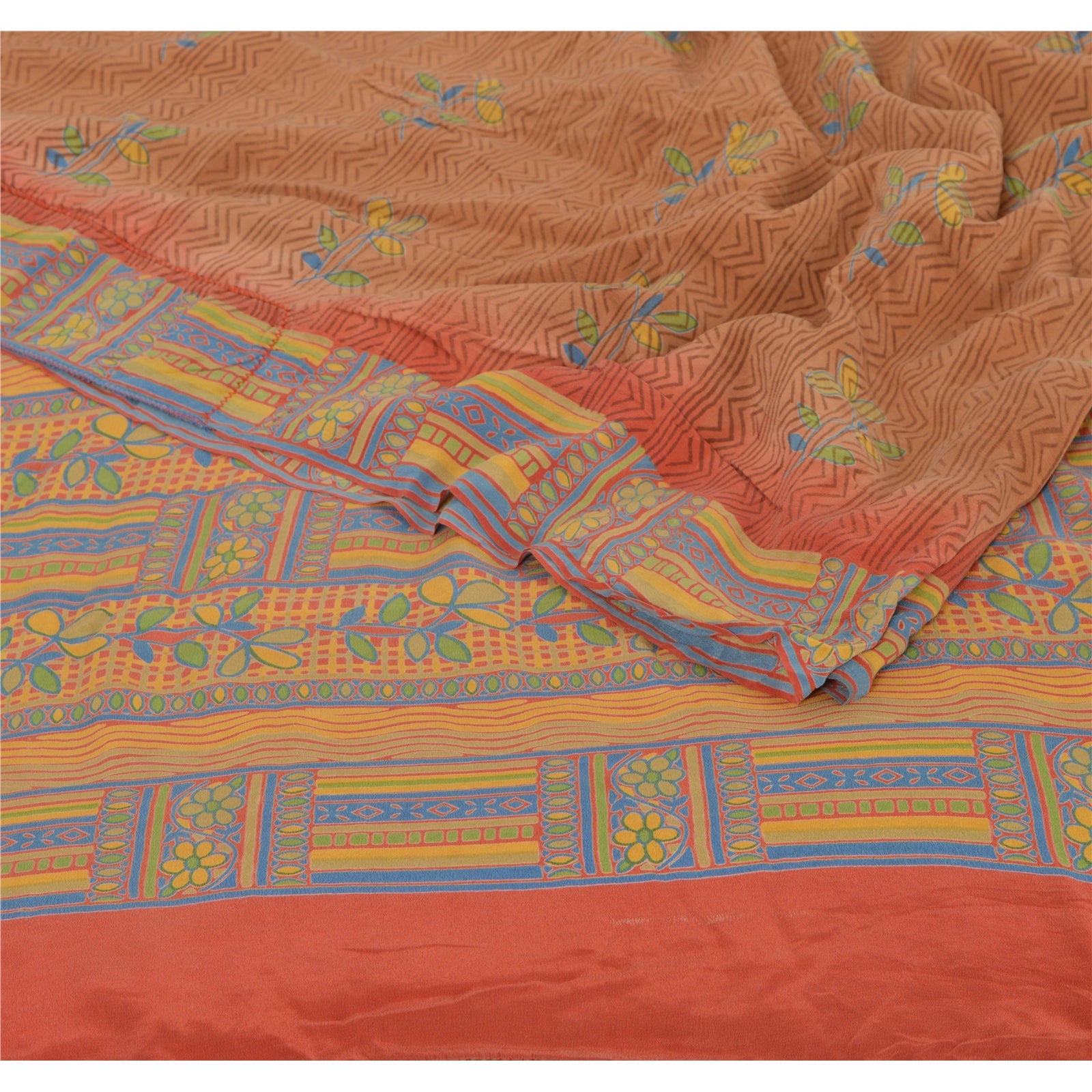 • Beautiful saffron & brown colored printed pure crepe silk saree . • Pallu & Border has printed floral & abstract design . • Floral design in center part of sari . This unique vintage saree can be used for various crafting ideas even if you don't want to use it as a sari. Design a dress, use it as a throw, as window dressing, beachwear, sarongs, table linen and much more. Let your creative juices flow and use this decorated fabric in multiple fashion.