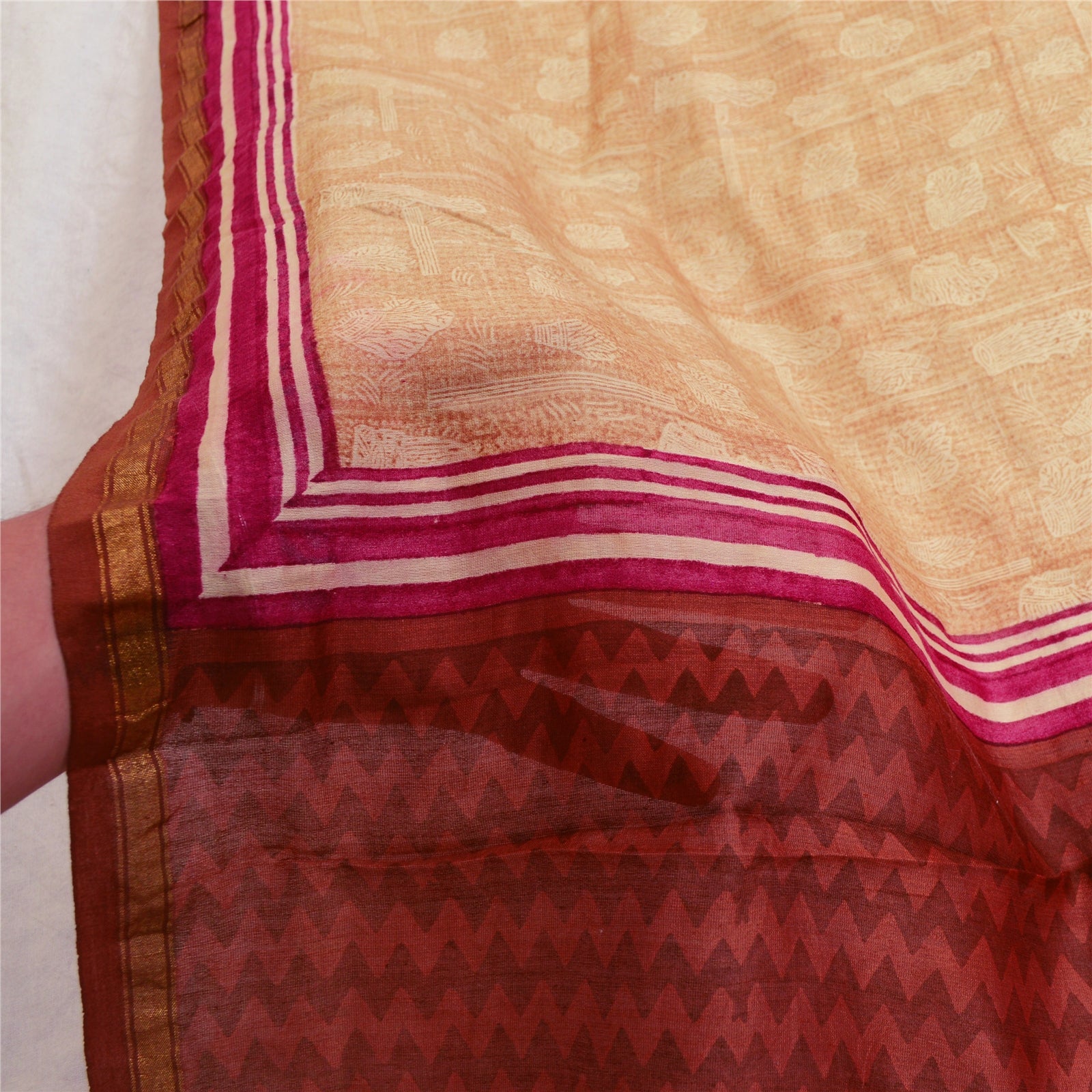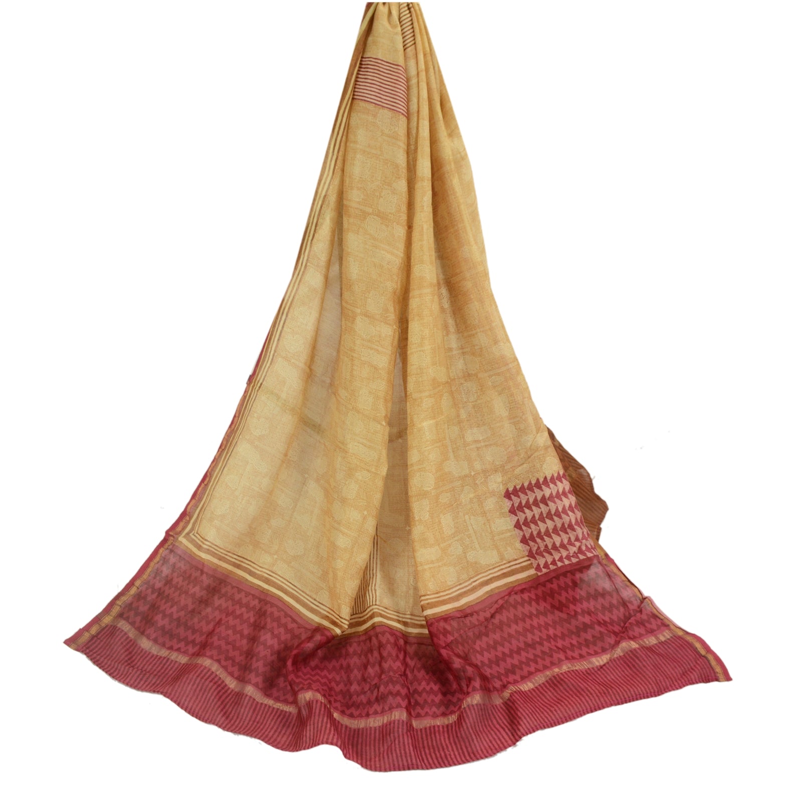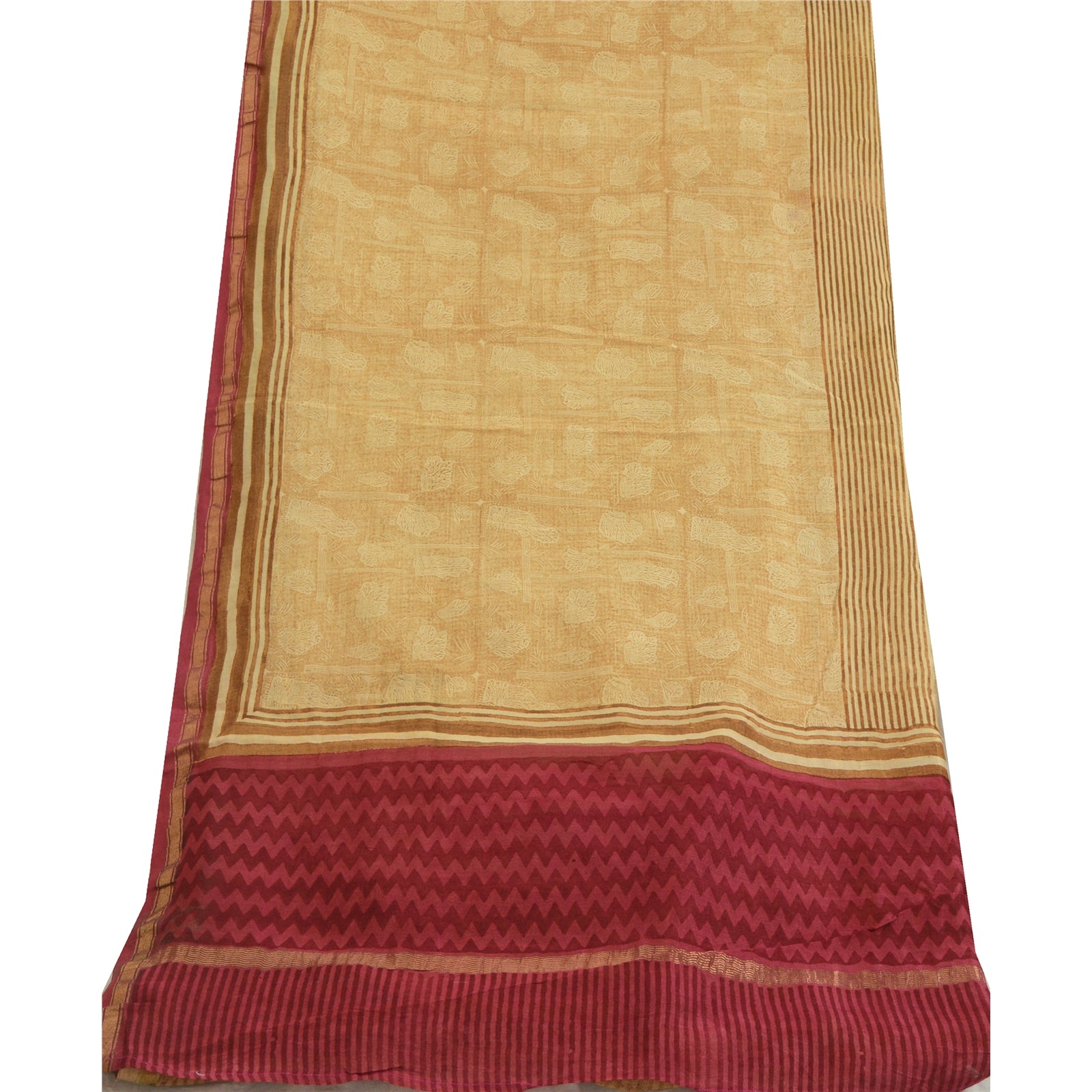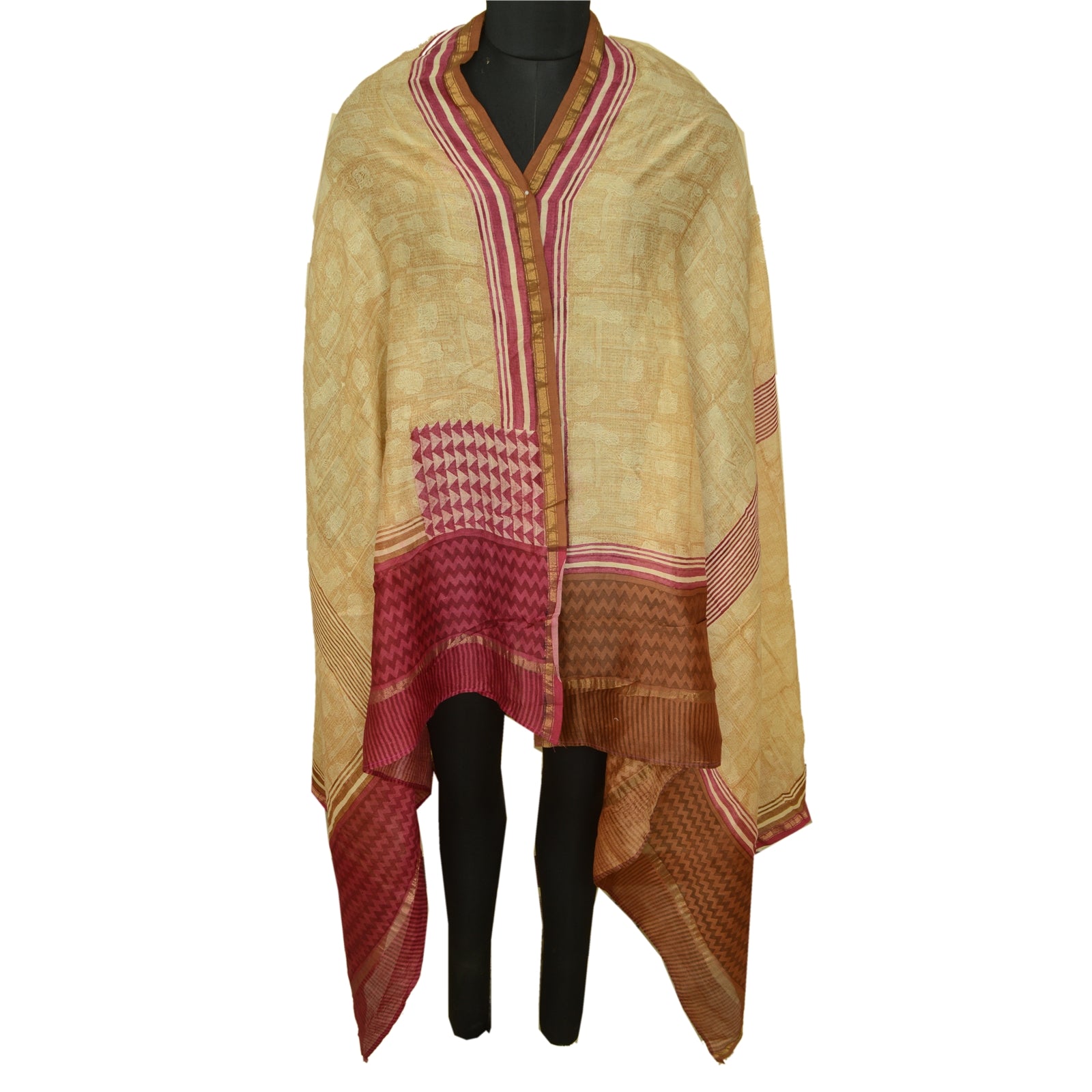 Санскрити Винтаж Кремовый/Темно-красный Длинный Палантин Дупатта Чистый Шелковый Набивной Шарф