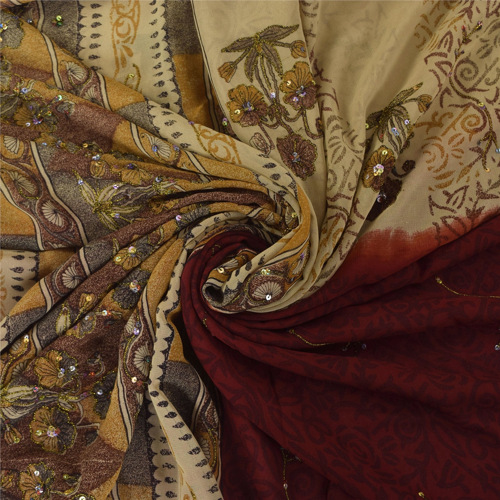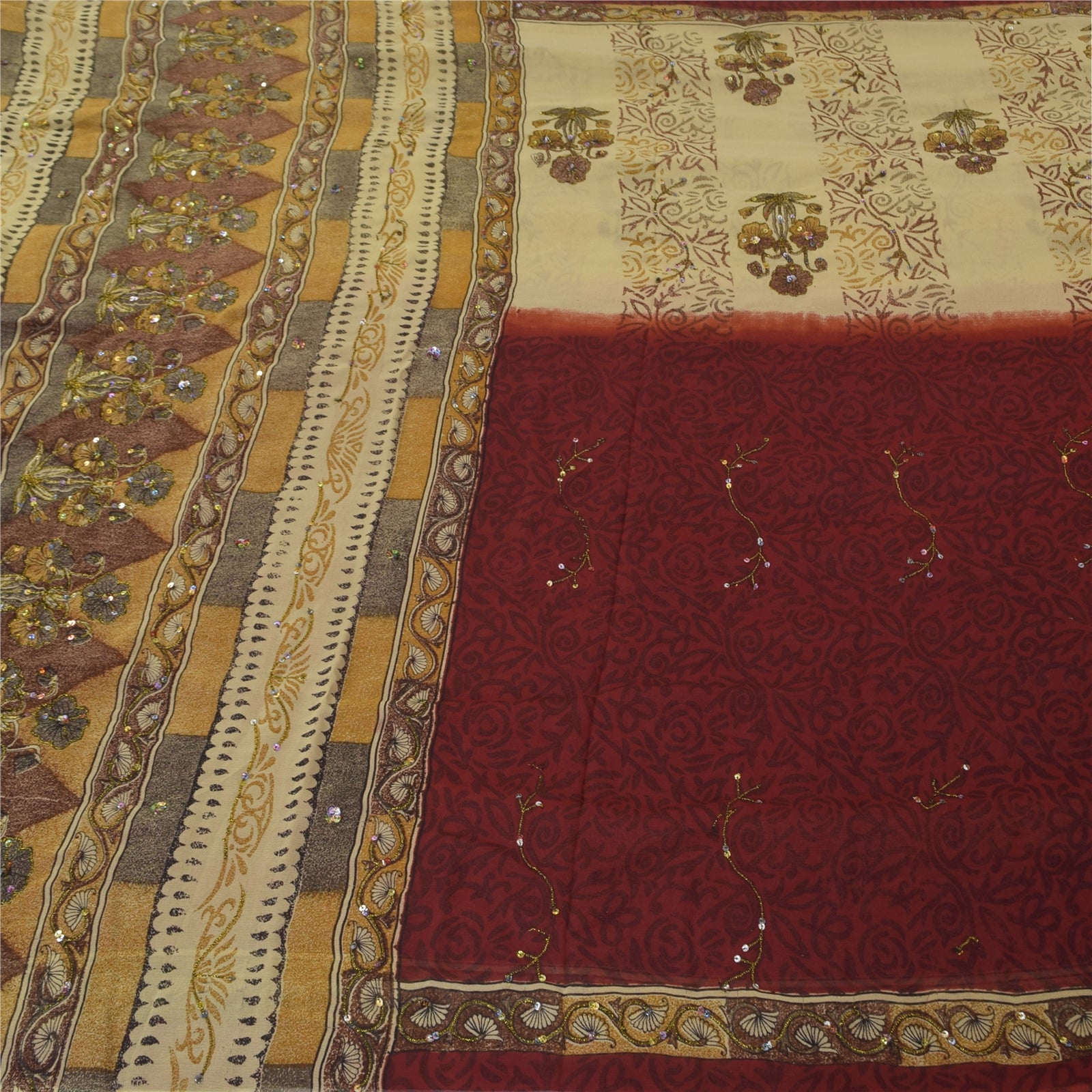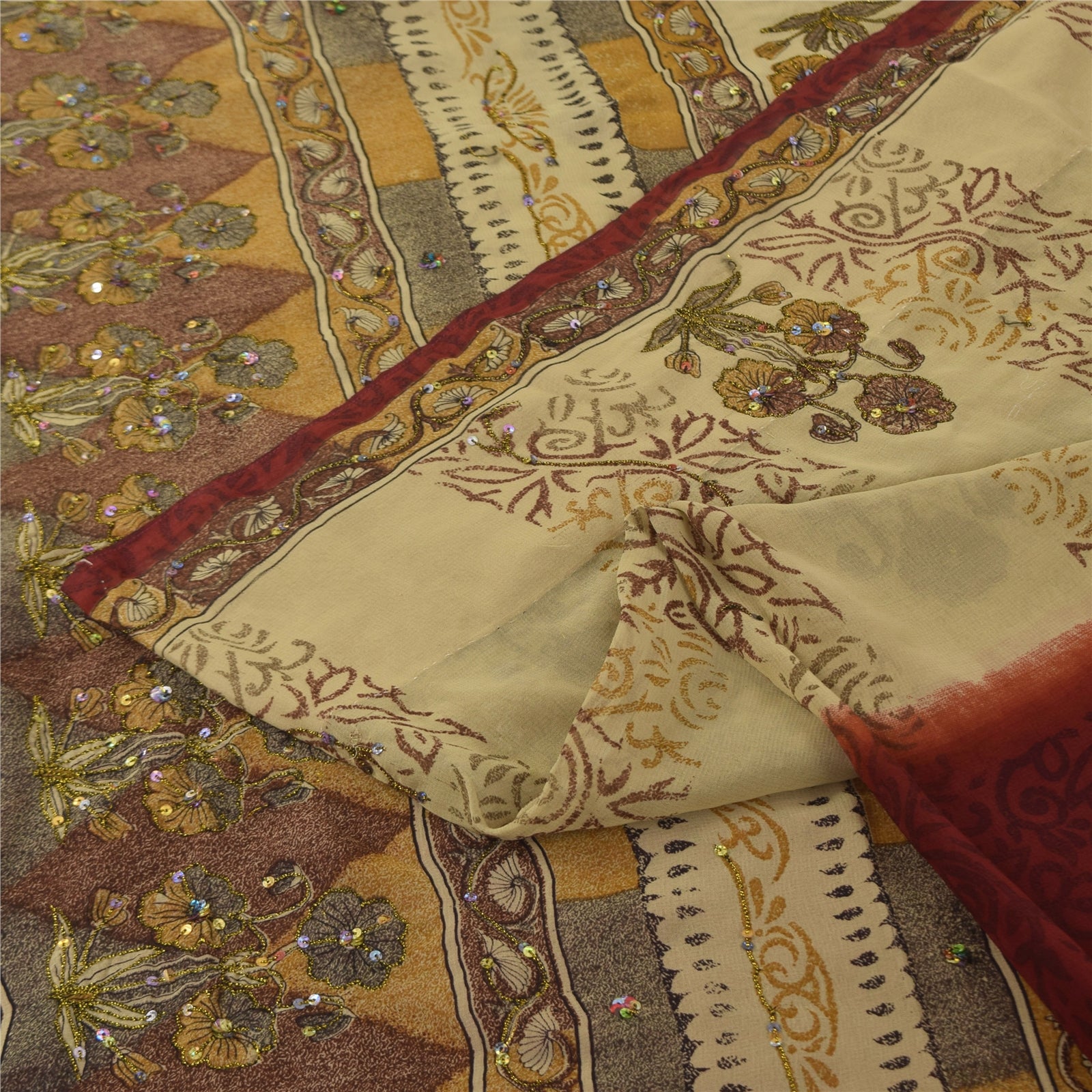 THE ITEM COLOR OR SHADE MAY BE DARKER OR LIGHTER THAN THE PICTURE.' Beautiful Cream/Red colored hand embroidered and printed sari in georgette. Pallu & Border features floral design embellished with black, gold thread work, multi color sequins work. There are floral motifs with similar work in center part of sari. This item's Beauty Factor Shimmering multi color sequins work with printed work on green & dark red color base fabric is really enhancing the beauty of the saree. This unique vintage saree can be used for various crafting ideas even if you don't want to use it as a sari. Design a dress, use it as a throw, as window dressing, upholstery, sarongs, table linen and much more. Let your creative juices flow and use this decorated fabric in multiple fashion. Shipping note: International buyers please note: Import duties, taxes, and charges are not included in the item price or postage cost. These charges are the buyer's responsibility. Please check with your country's customs office to determine what these additional costs will be prior to bidding or buying. Buyer will pay custom duty/tax. It is calculated and charged differently by every country. As a seller I do not have any control over it. VAT or sales tax is calculated by the platform at the time of checkout. Customs charge is payable at the time of delivery. SKU: PS-31806