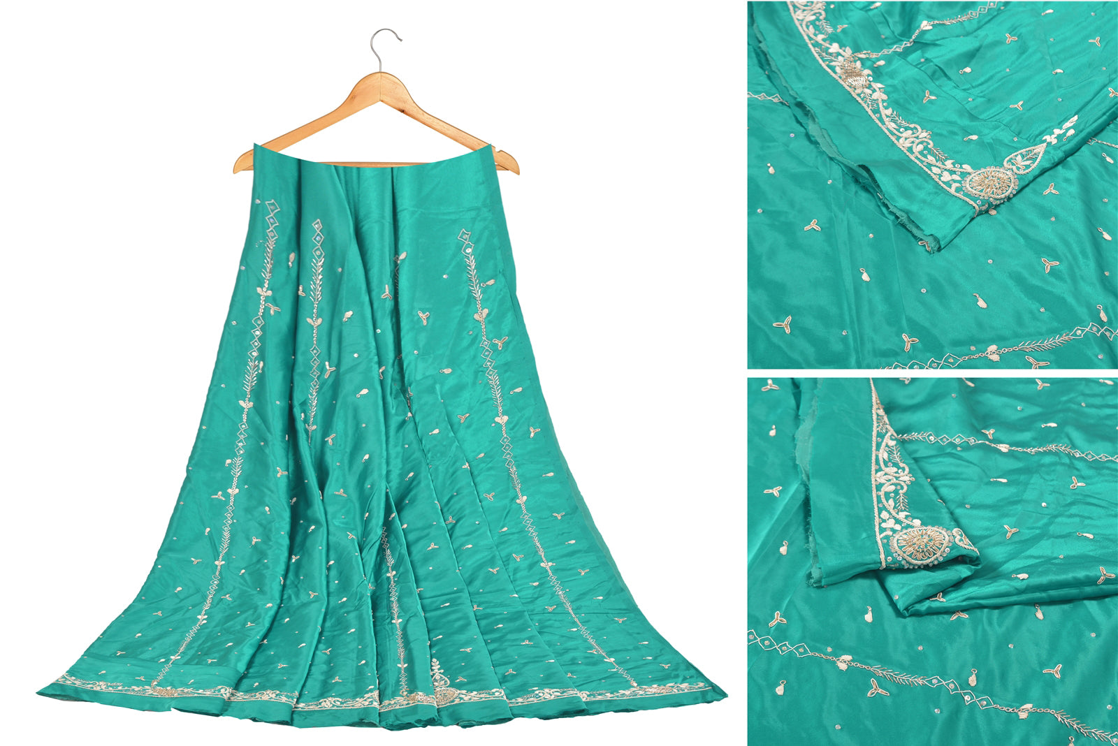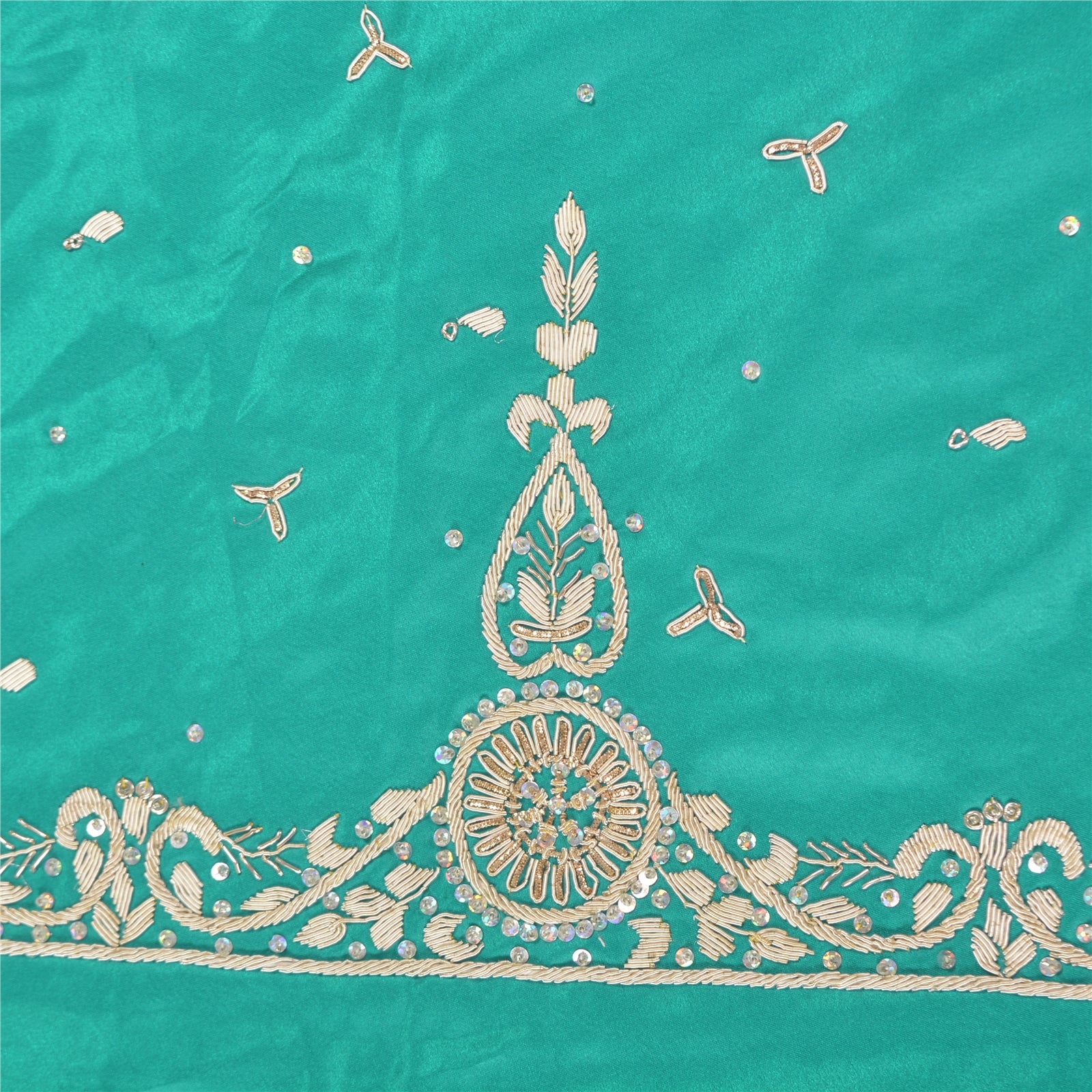 Awesome green colored vintage artificial silk hand embroidered unstitched lehenga. Bottom of lehenga features floral design embellished with pure metallic golden zardozi, dabka, sequins & glass beaded work. Similar work on allover lehenga. Length-42, Flare-150 inches Flaunt this heavy lehenga with ethnic tops, blouses or kurtis at parties, weddings and other occasions. A one of a kind item hard to find. Awesome craftsmanship. THE ITEM COLOR OR SHADE MAY BE DARKER OR LIGHTER THAN THE PICTURE.' International buyers please note: Import duties, taxes, and charges are not included in the item price or postage cost. Buyer will pay custom duty/tax,VAT, and any applicable charges at the time of delivery. L-759