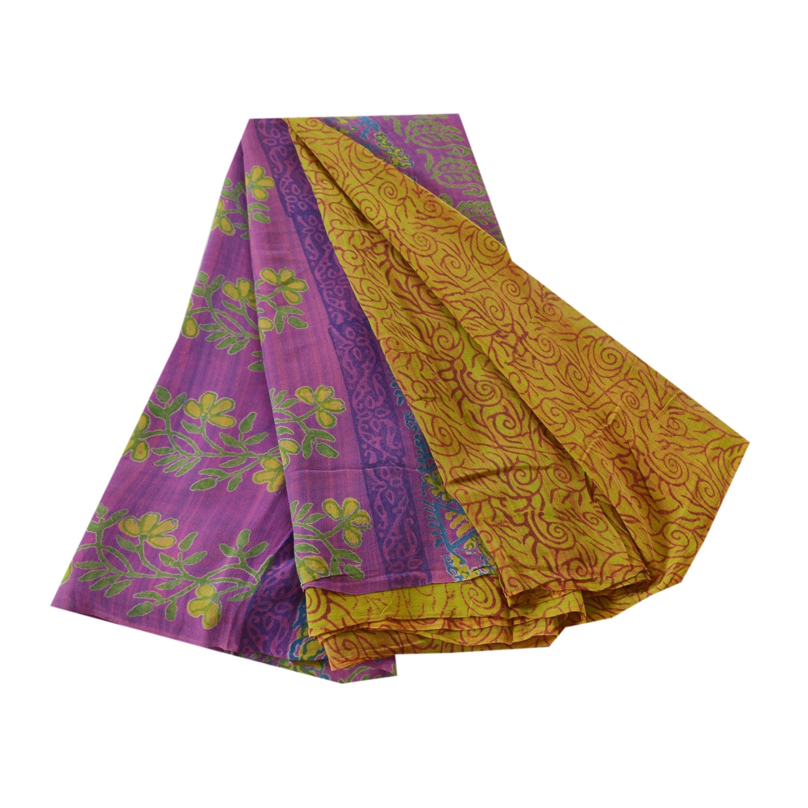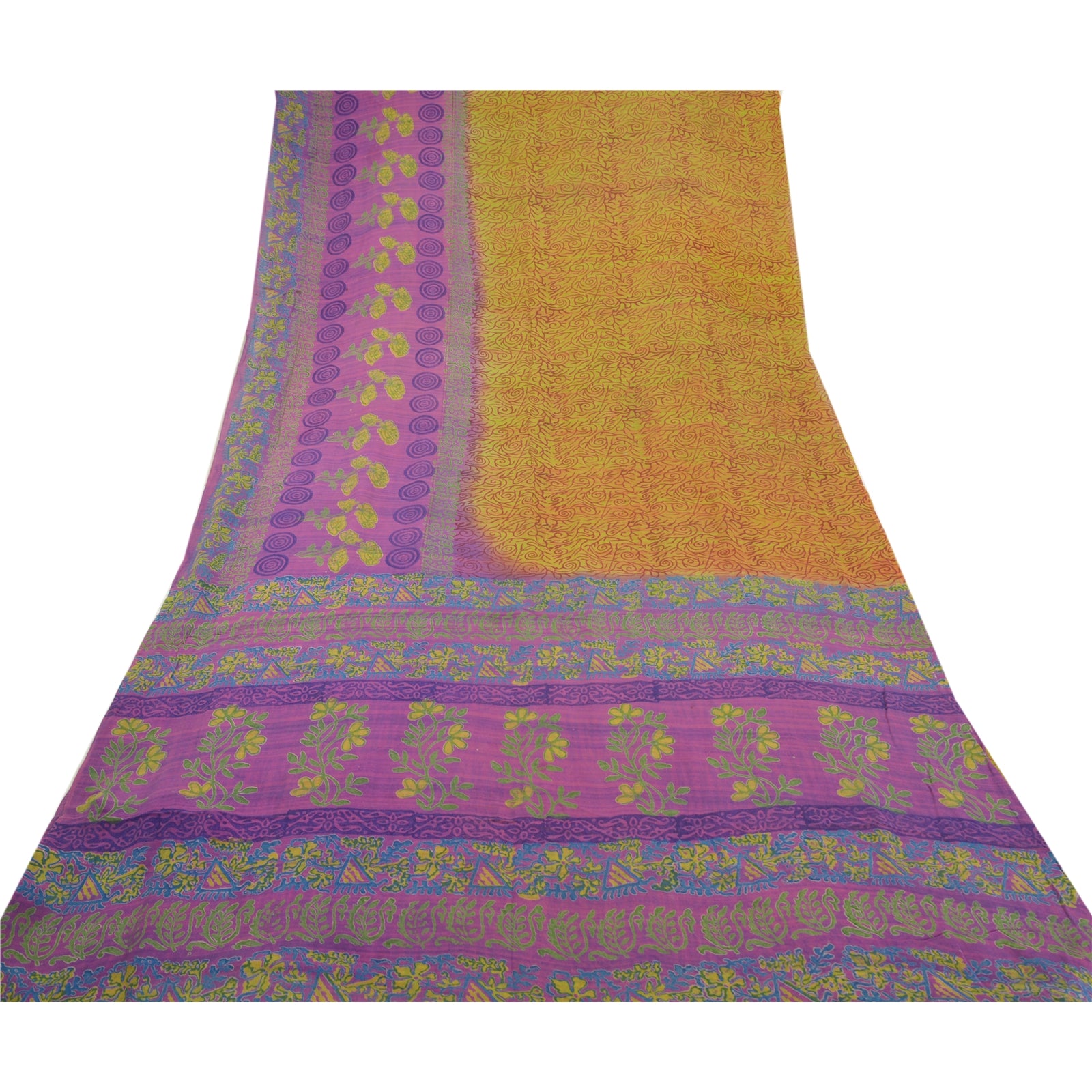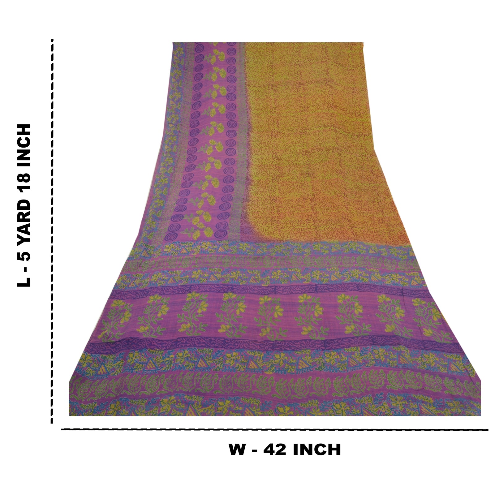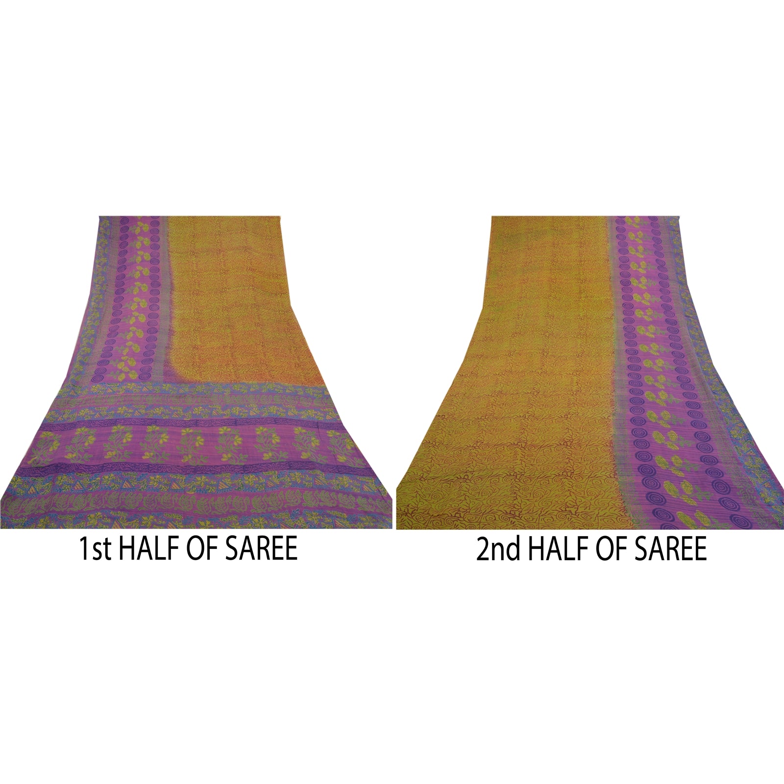 Привлекающее внимание сари из чистого шелка-жоржета горчично-зеленого и фиолетового цвета с принтом. Pallu & Border напечатала цветочный узор. Цветочный узор в центральной части сари. Что особенного в этом сари? Великолепный дизайн на мягкой устойчивой ткани действительно подчеркивает красоту сари. Это уникальное винтажное сари можно использовать для различных идей по рукоделию, даже если вы не хотите использовать его как сари. Спроектируйте платье, используйте его в качестве украшения витрин, обивки, саронгов, пледов, для пошива платьев и столового белья и многого другого. Дайте волю своим творческим способностям и используйте эту декорированную устойчивую ткань в различных вариантах.