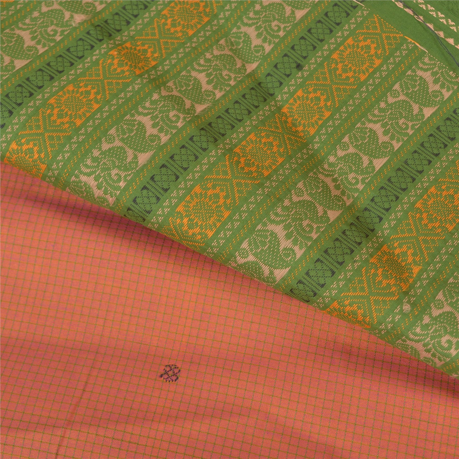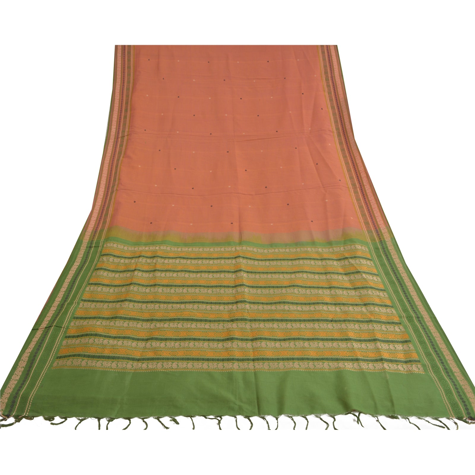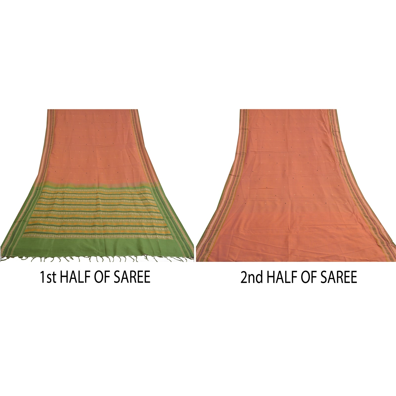 Красивое сари из смеси шелка зеленого и персикового цветов, сотканное вручную. Pallu & Border производит тканые изделия с прекрасными цветочными, пейслийскими и павлиньими узорами. Центр сари украшен аналогичным плетением нитей с цветочными мотивами. Это сари можно использовать и для различных идей рукоделия. Используйте его для дизайна одежды, в качестве пледа, для оформления окон, обивки, столового белья и многого другого. Дайте волю своим творческим сокам.