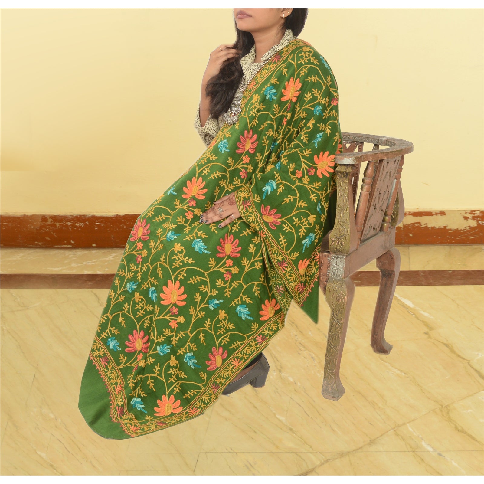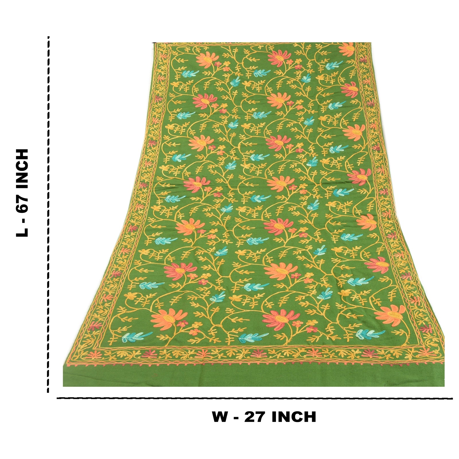 Sanskriti Vintage Green Woollen Long Stole/Shawl Hand Embroidered Ari Scarf