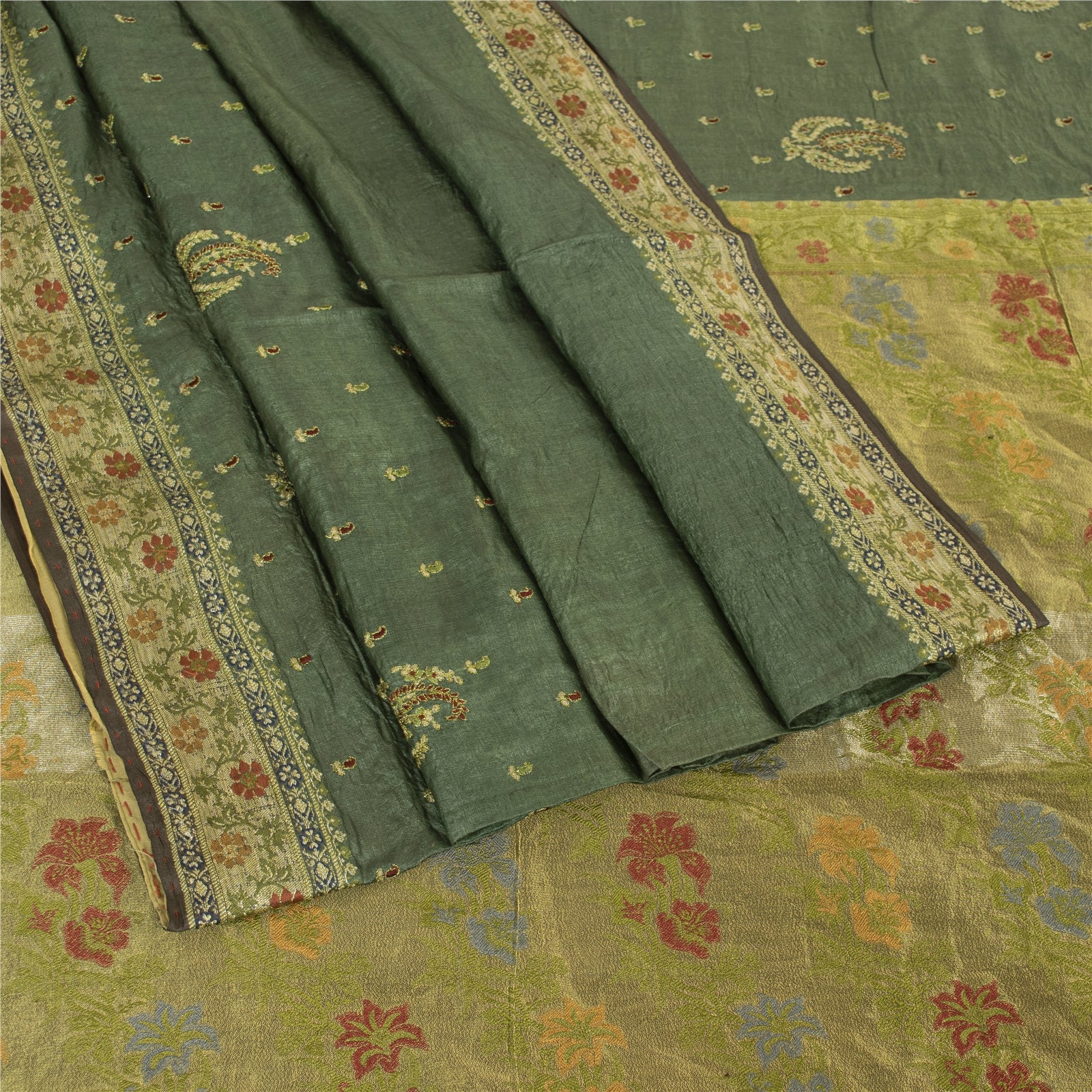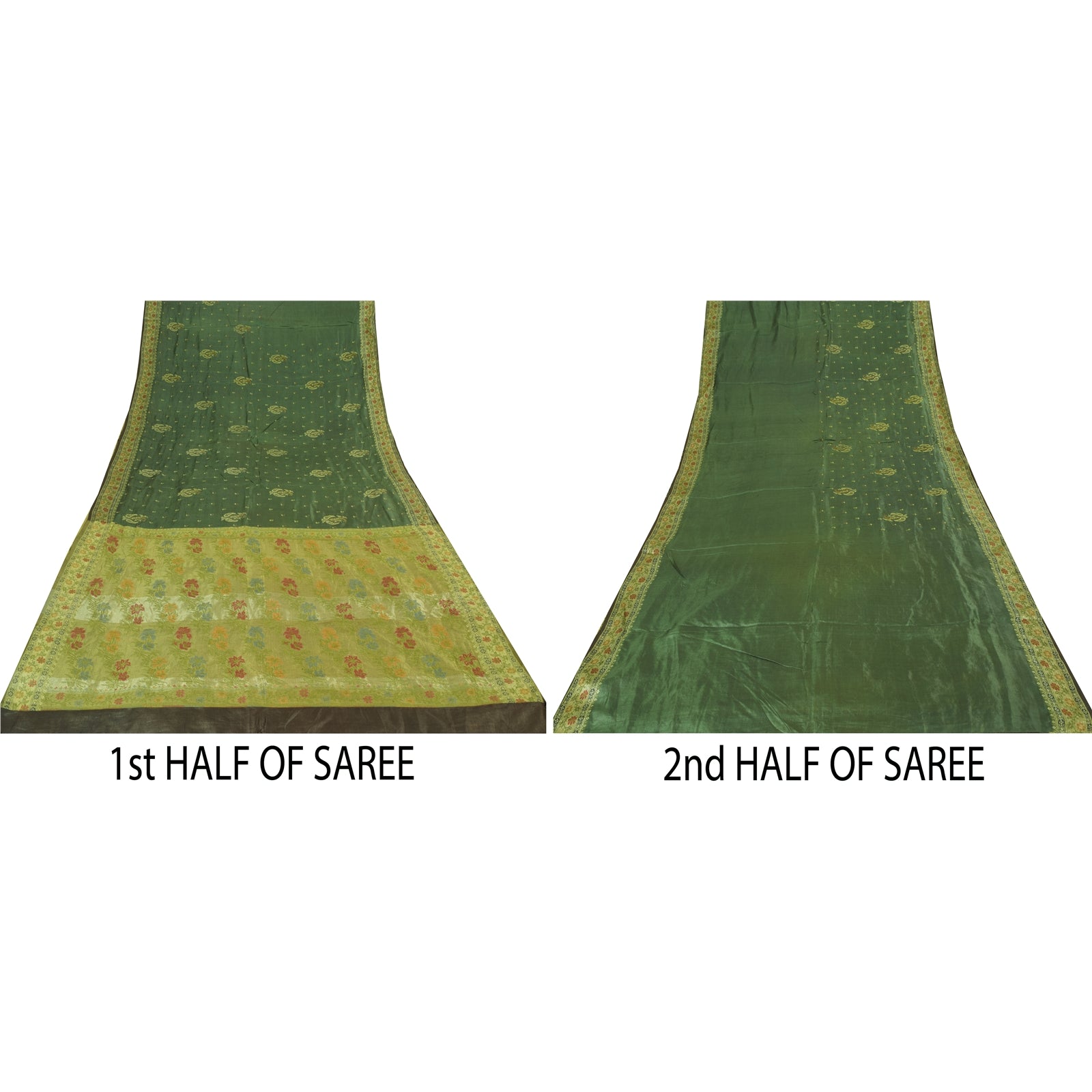 Sanskriti Vintage Indian Dark Green Sarees Pure Silk Hand Woven Sari 5+yd Fabric