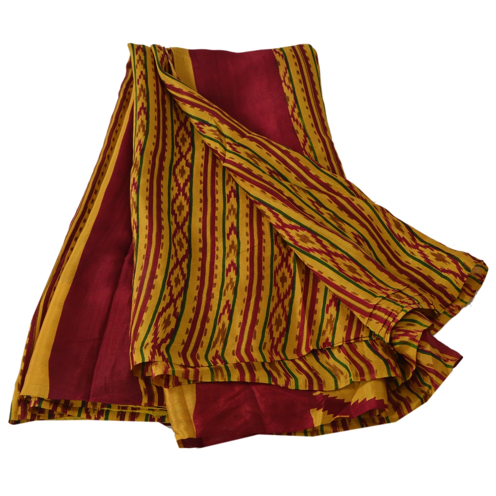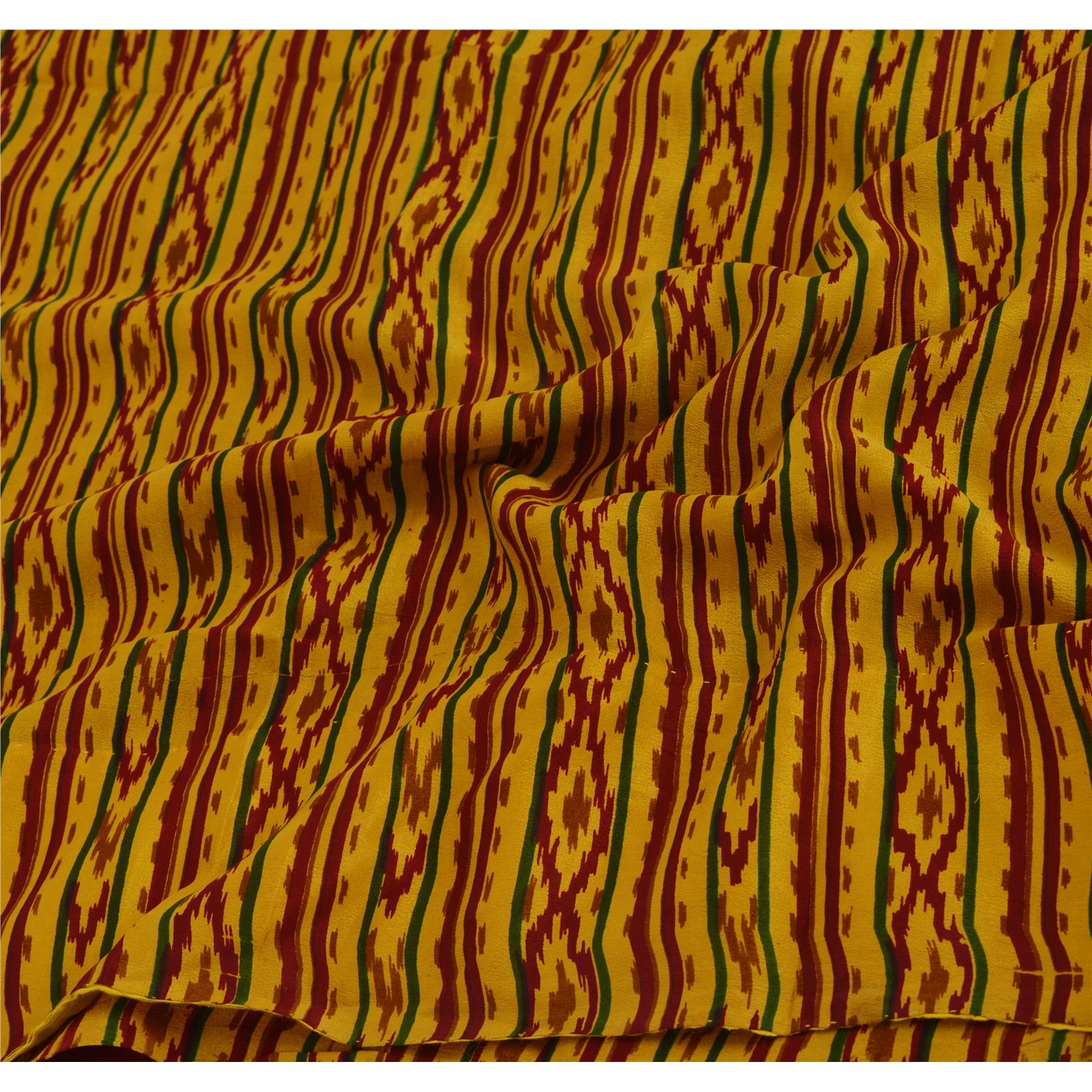 • Beautiful mustard & dark red colored printed pure crepe silk saree . • Pallu has printed abstract & jagged temple design . • Abstract design in center part of sari . This unique vintage saree can be used for various crafting ideas even if you don't want to use it as a sari. Design a dress, use it as a throw, as window dressing, beachwear, sarongs, table linen and much more. Let your creative juices flow and use this decorated fabric in multiple fashion.