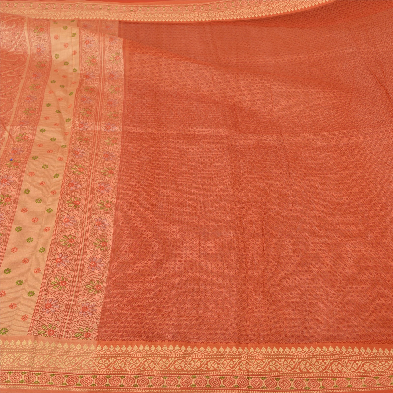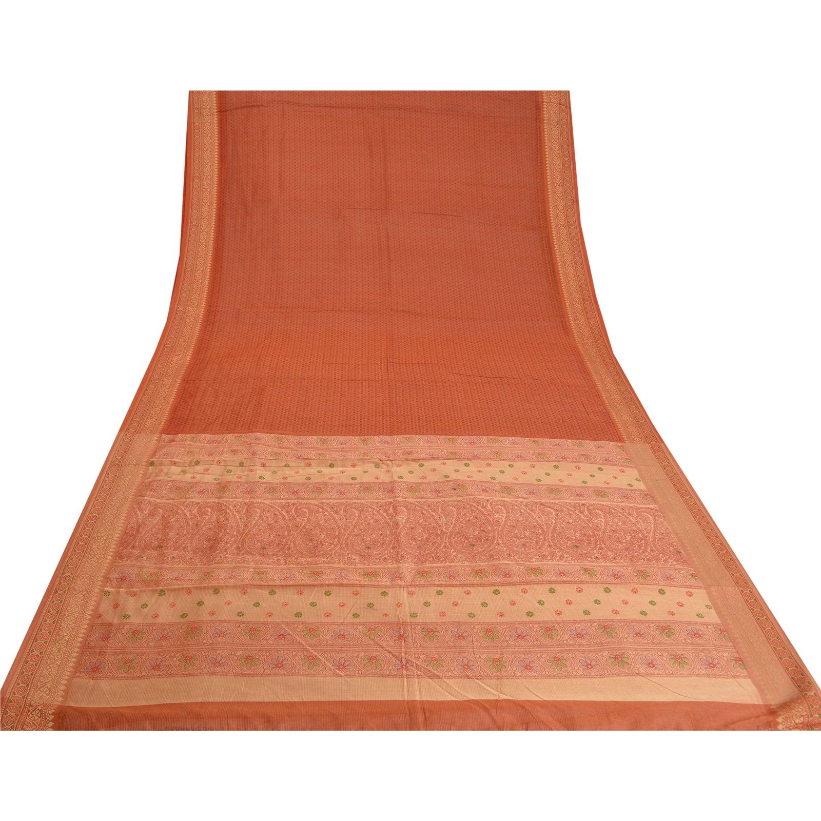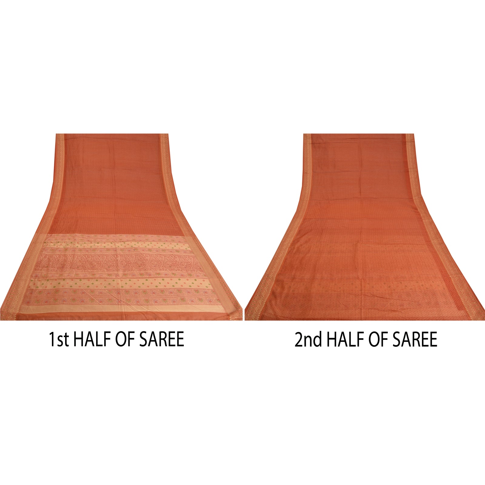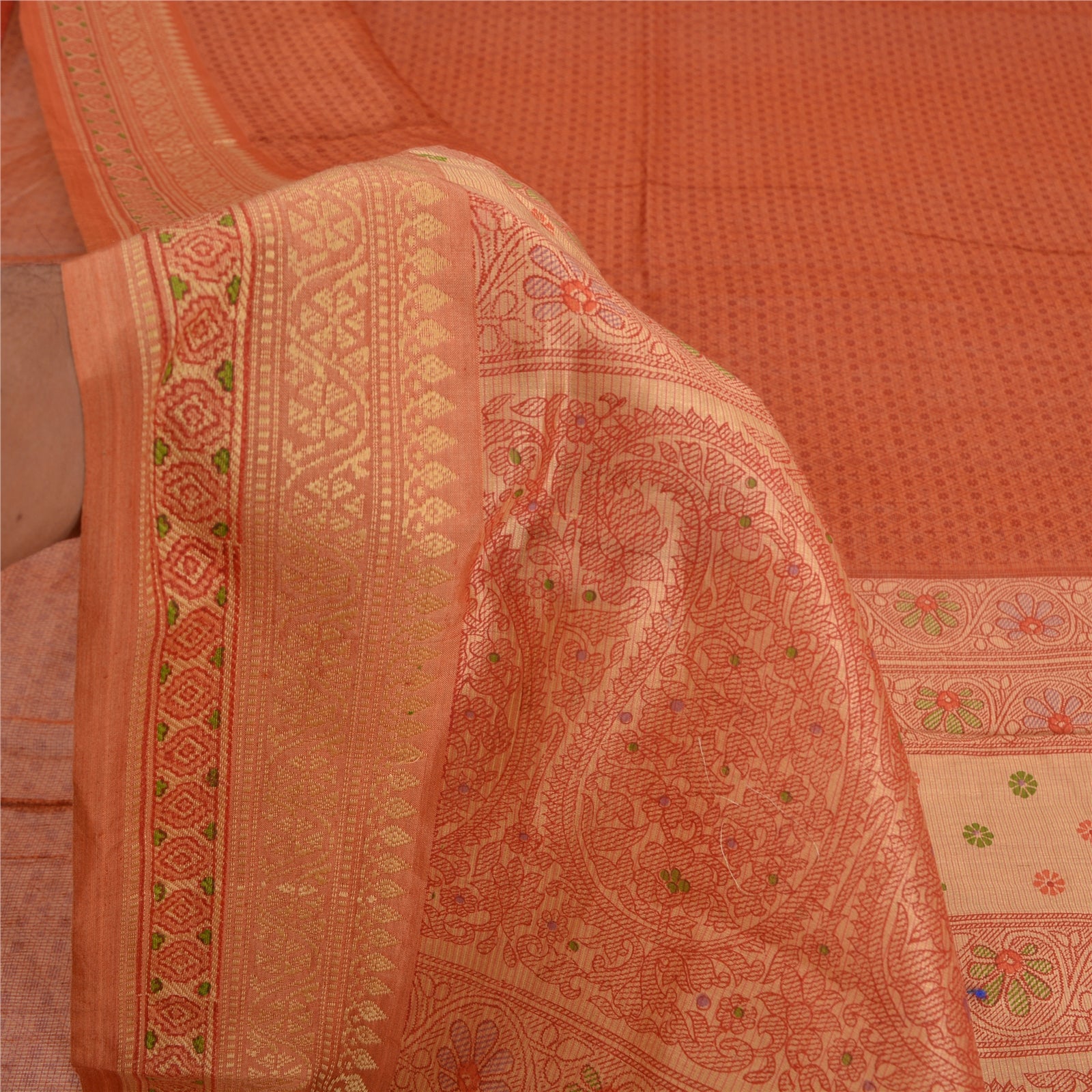 Сари Санскрити Винтаж Оранжевый Хлопок Шелк Напечатанный Тканый Сари Ремесло Экологичная Ткань