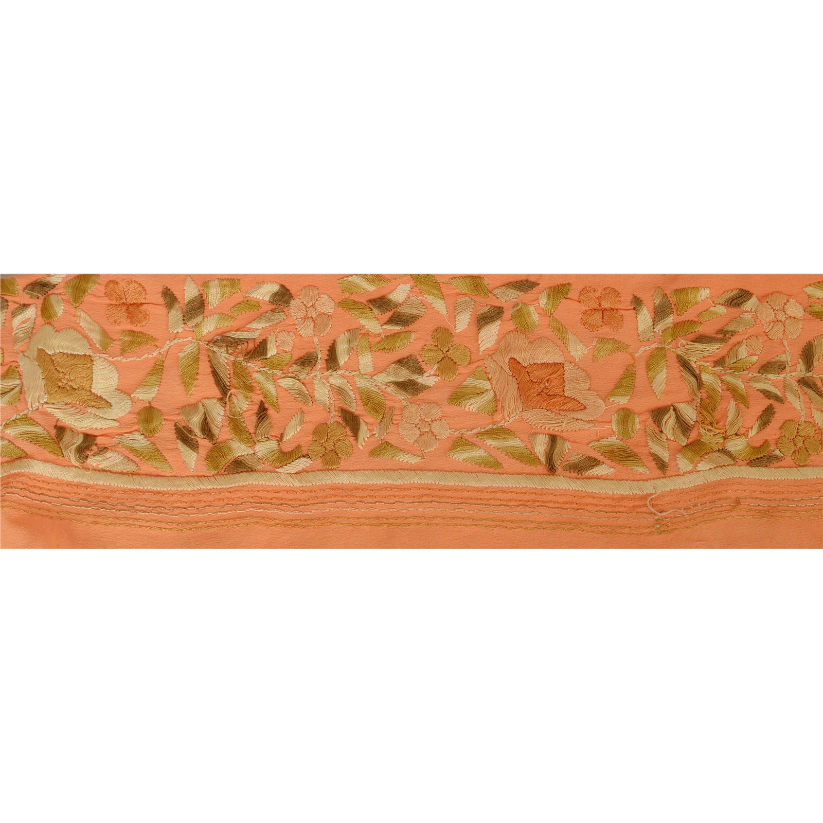 Amazing crepe silk and embroidered Parsee sari border in peach color highlighting thread work. Border has beautiful floral patterns painstakingly embroidered with green, cream, brown thread work WOW!! an awesome one of a kind versatile border. 1 Quantity = 1 Yard B-14503