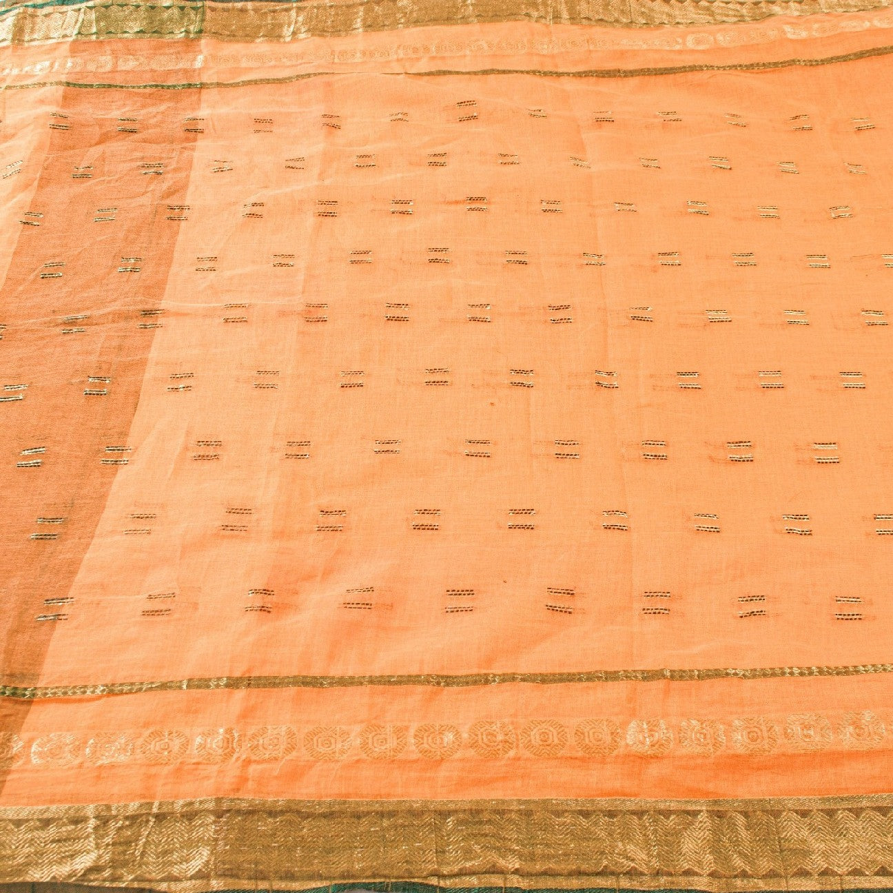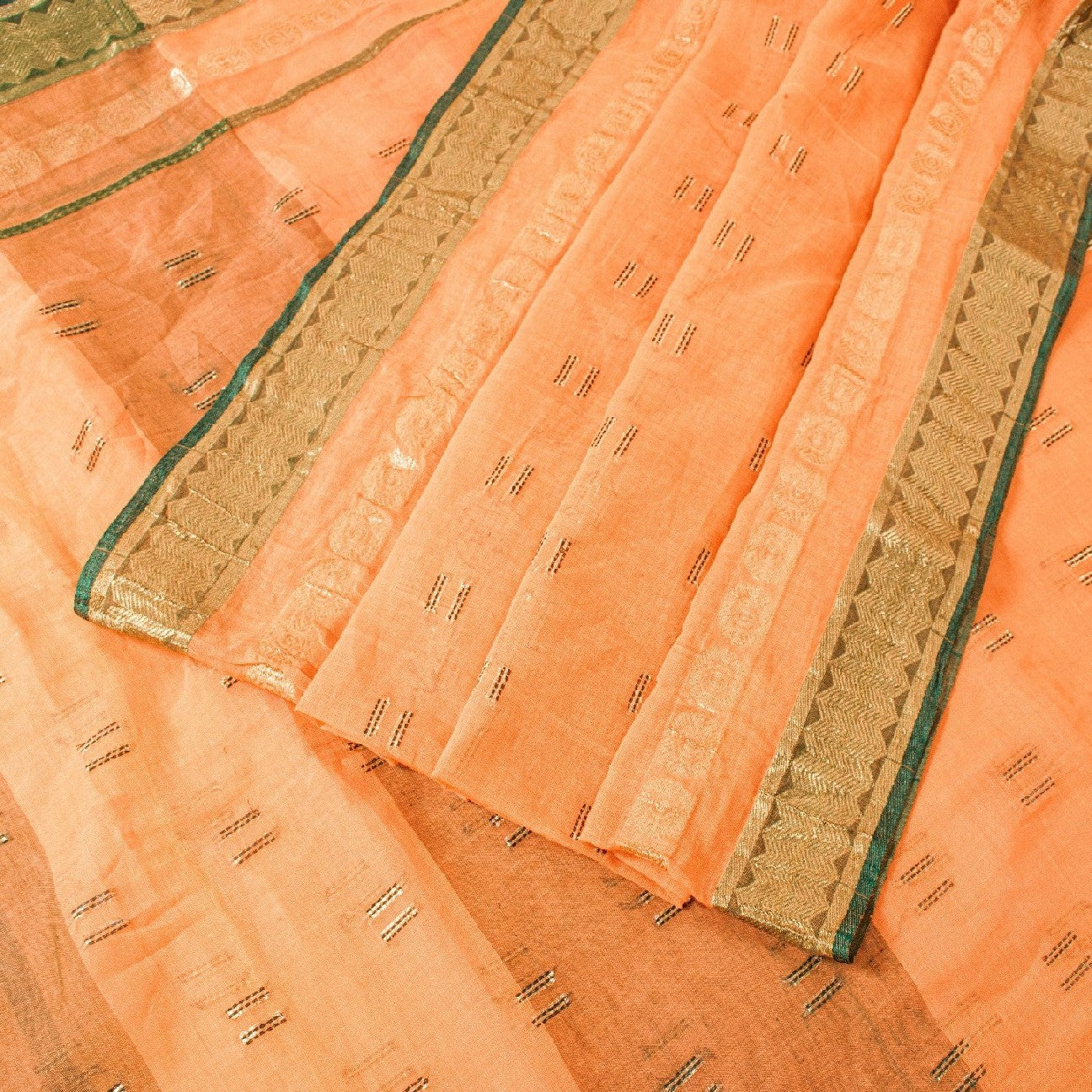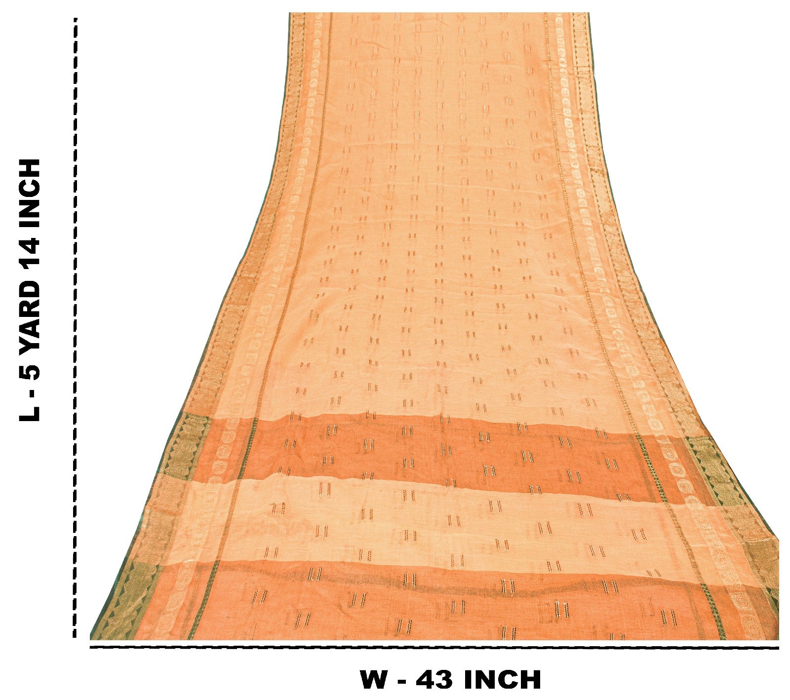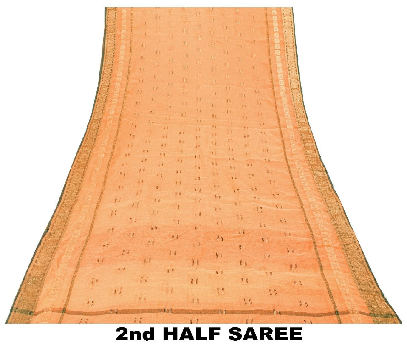 Сари красивого персикового оттенка из 100% чистого хлопка. Pallu & Border имеет цветочный узор из зеленой плетеной нити, украшенный сверкающими золотистыми зари. Центр сари украшен аналогичным переплетением нитей и узором «зари» с цветочными мотивами. Это сари можно использовать и для различных идей рукоделия. Используйте его для дизайна одежды, в качестве пледа, для оформления окон, обивки, столового белья и многого другого. Дайте волю своим творческим сокам.