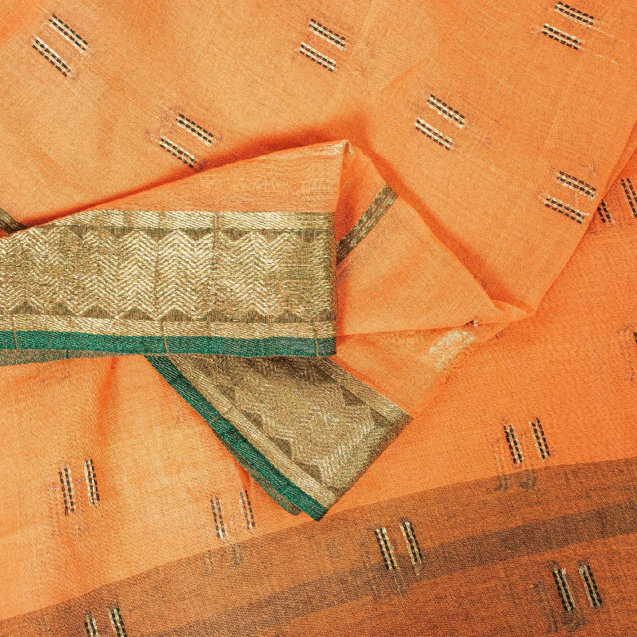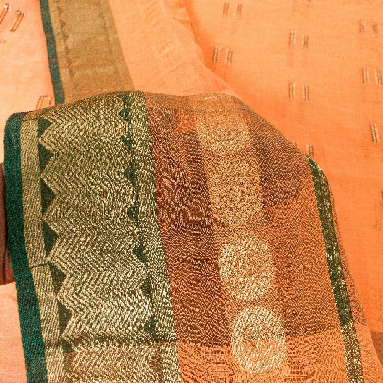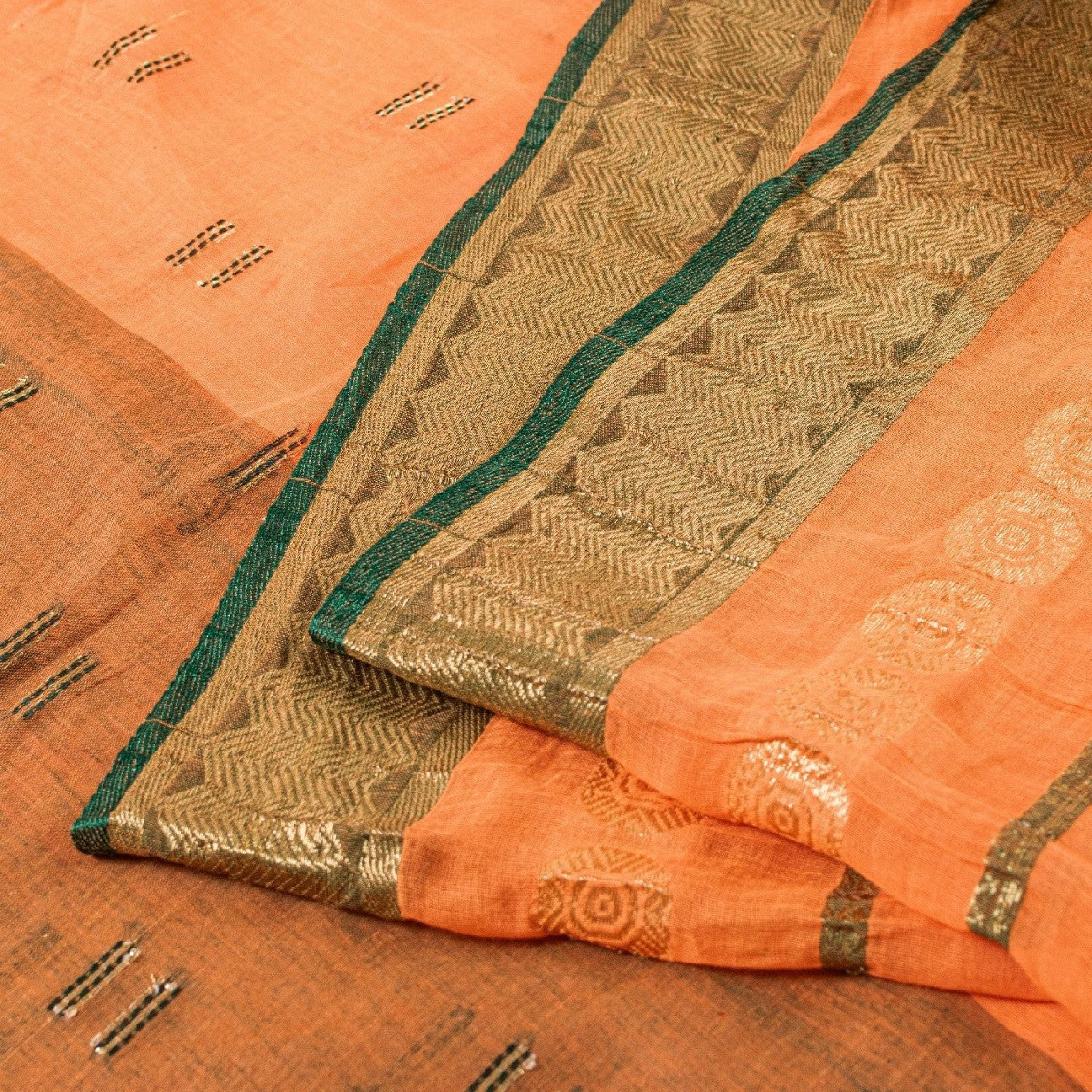 Сари красивого персикового оттенка из 100% чистого хлопка. Pallu & Border имеет цветочный узор из зеленой плетеной нити, украшенный сверкающими золотистыми зари. Центр сари украшен аналогичным переплетением нитей и узором «зари» с цветочными мотивами. Это сари можно использовать и для различных идей рукоделия. Используйте его для дизайна одежды, в качестве пледа, для оформления окон, обивки, столового белья и многого другого. Дайте волю своим творческим сокам.