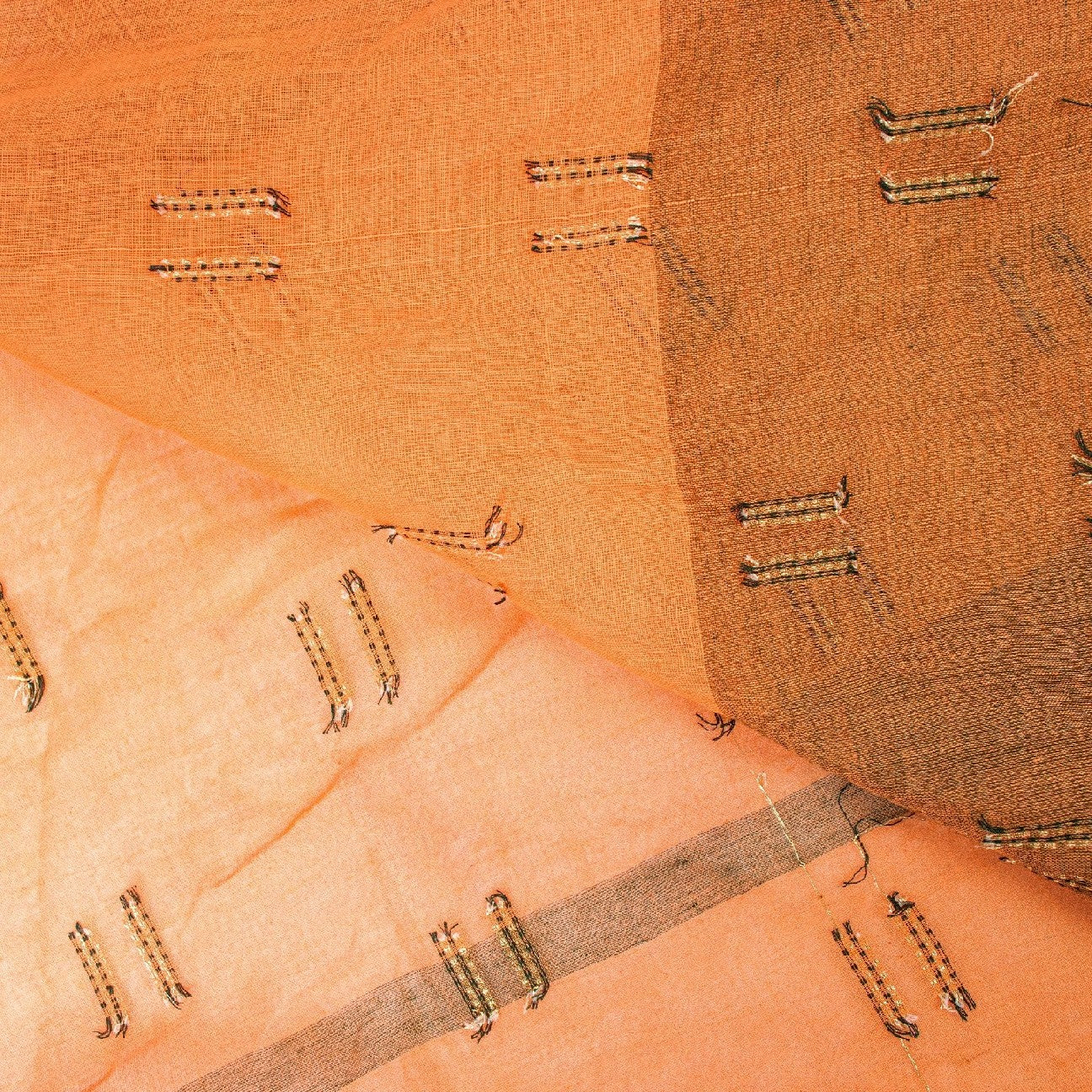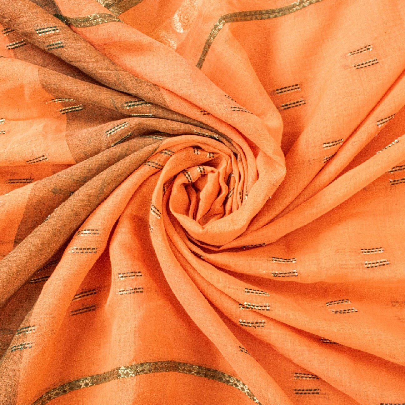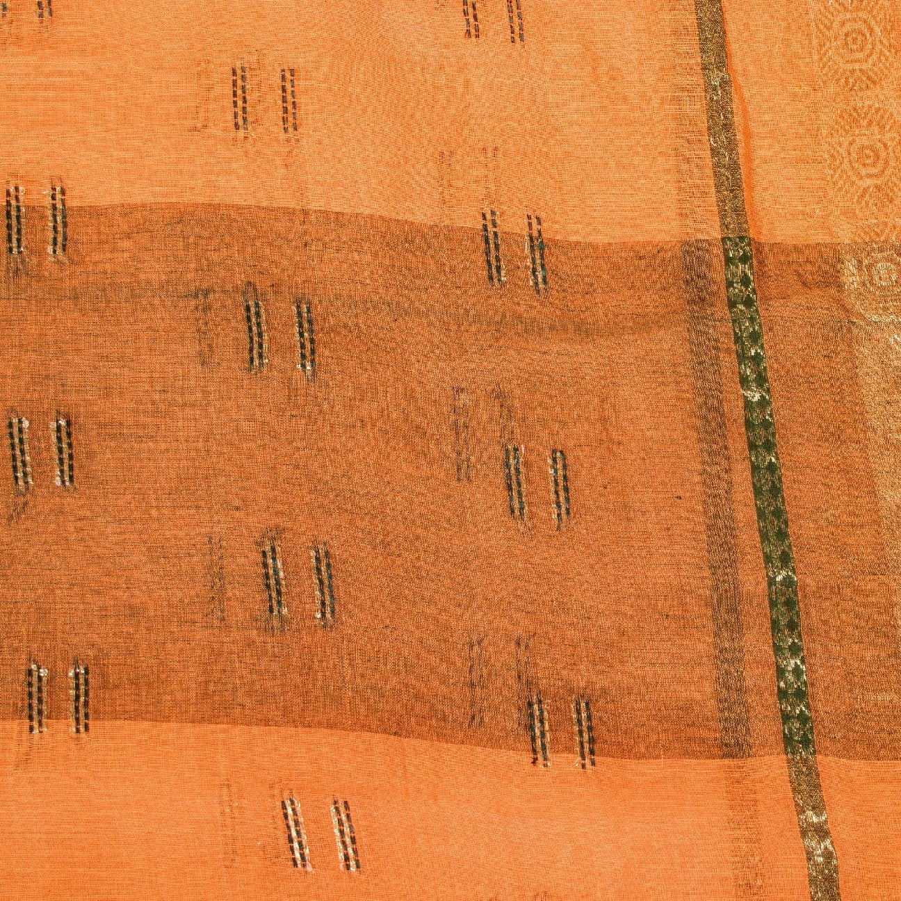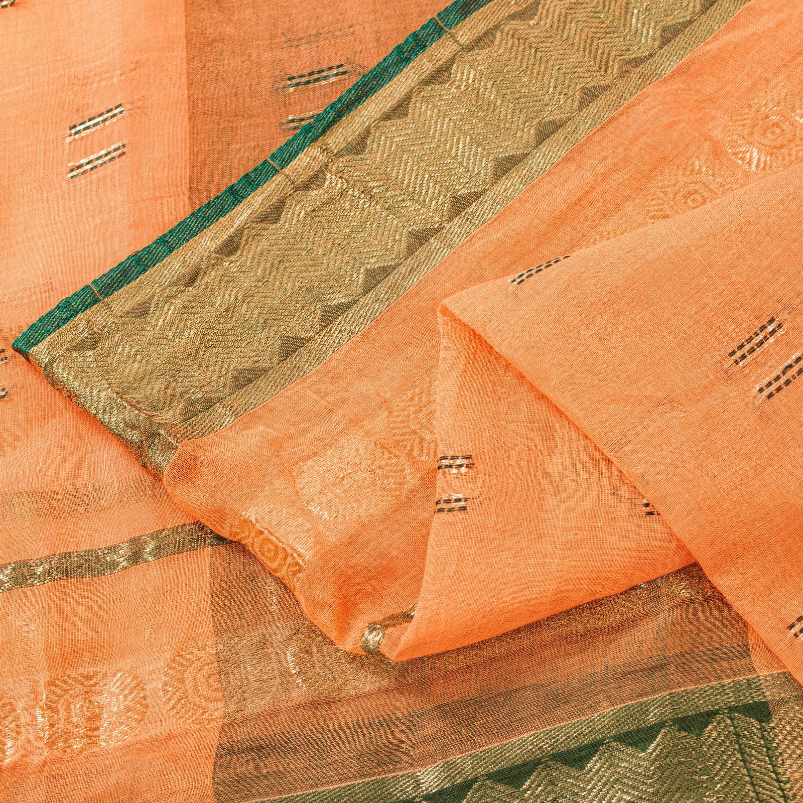 Сари красивого персикового оттенка из 100% чистого хлопка. Pallu & Border имеет цветочный узор из зеленой плетеной нити, украшенный сверкающими золотистыми зари. Центр сари украшен аналогичным переплетением нитей и узором «зари» с цветочными мотивами. Это сари можно использовать и для различных идей рукоделия. Используйте его для дизайна одежды, в качестве пледа, для оформления окон, обивки, столового белья и многого другого. Дайте волю своим творческим сокам.